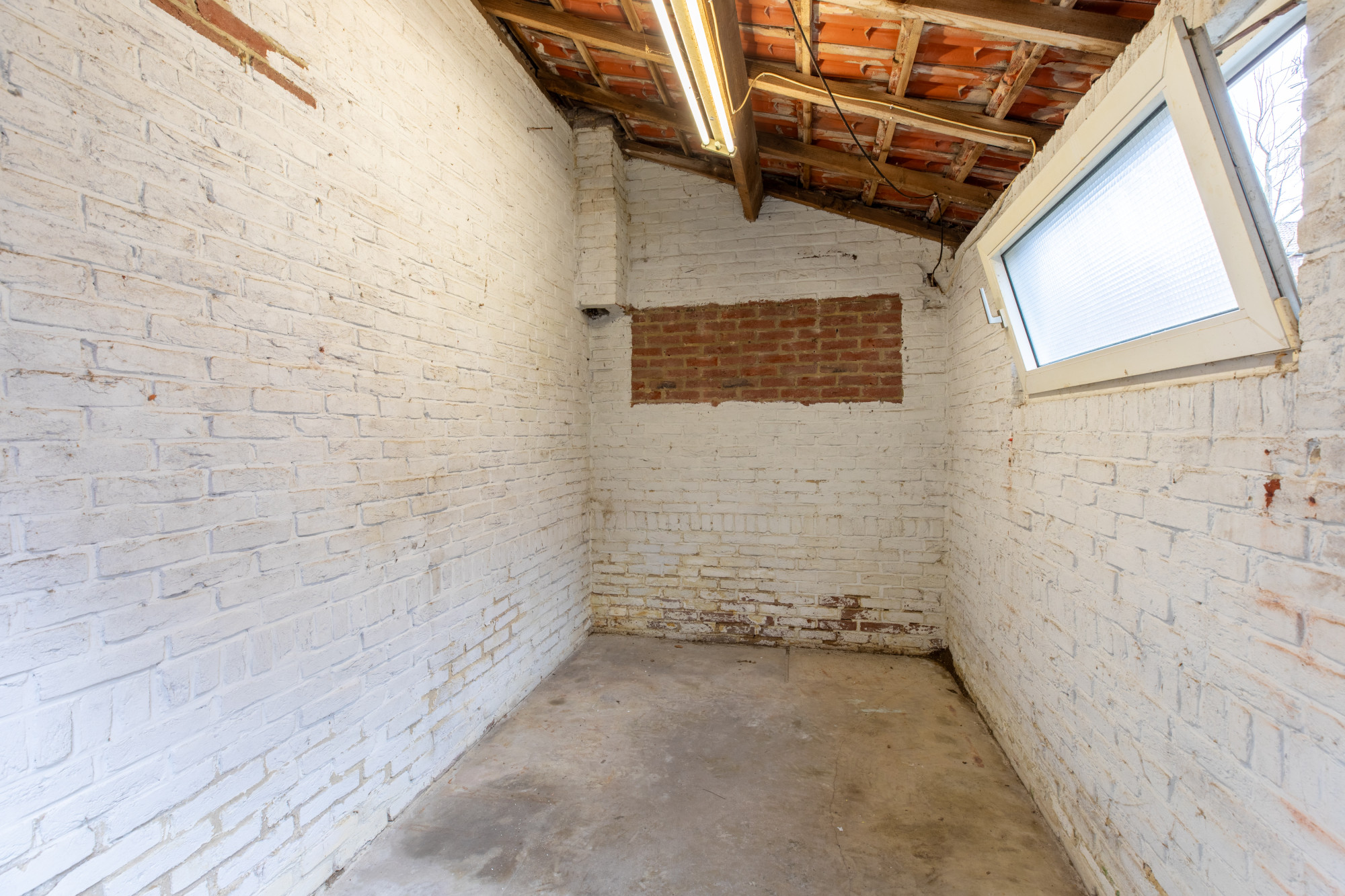 Kelderruimte met aansluitpunt wasapparatuur.