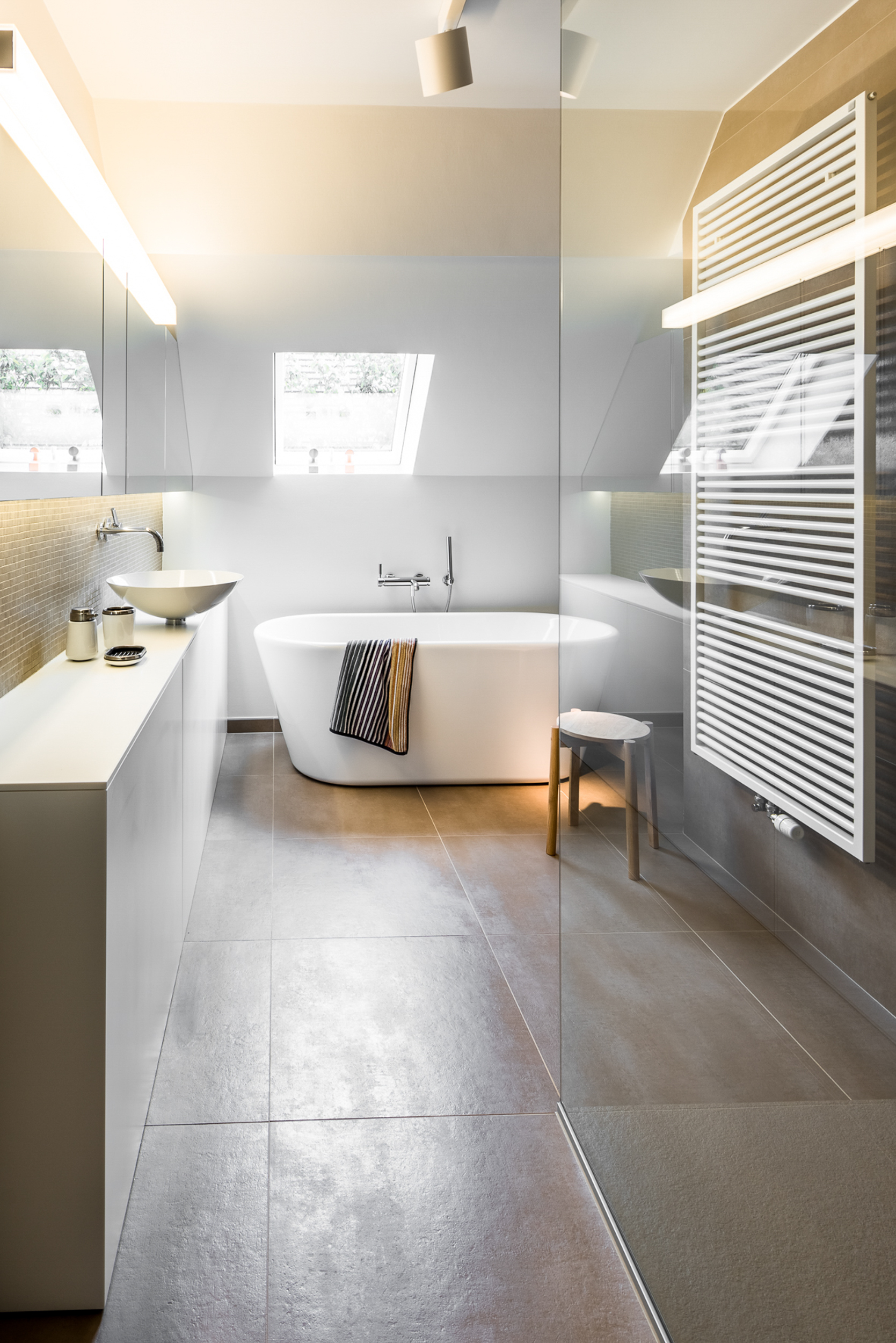 - Luxueus ingerichte badkamer met inloopdouche, vrijstaand bad en enkele lavabo in fraai badkamermeubel