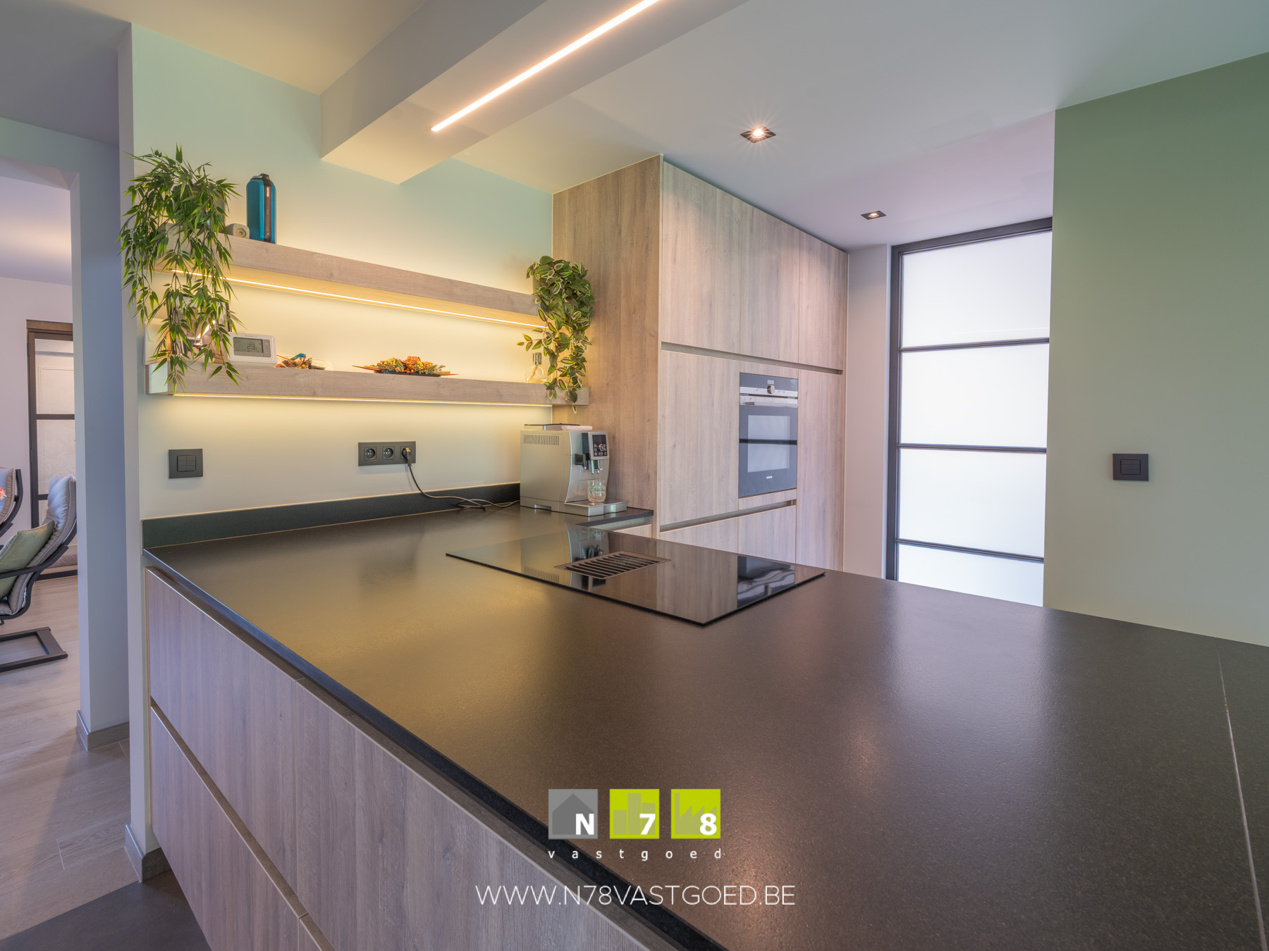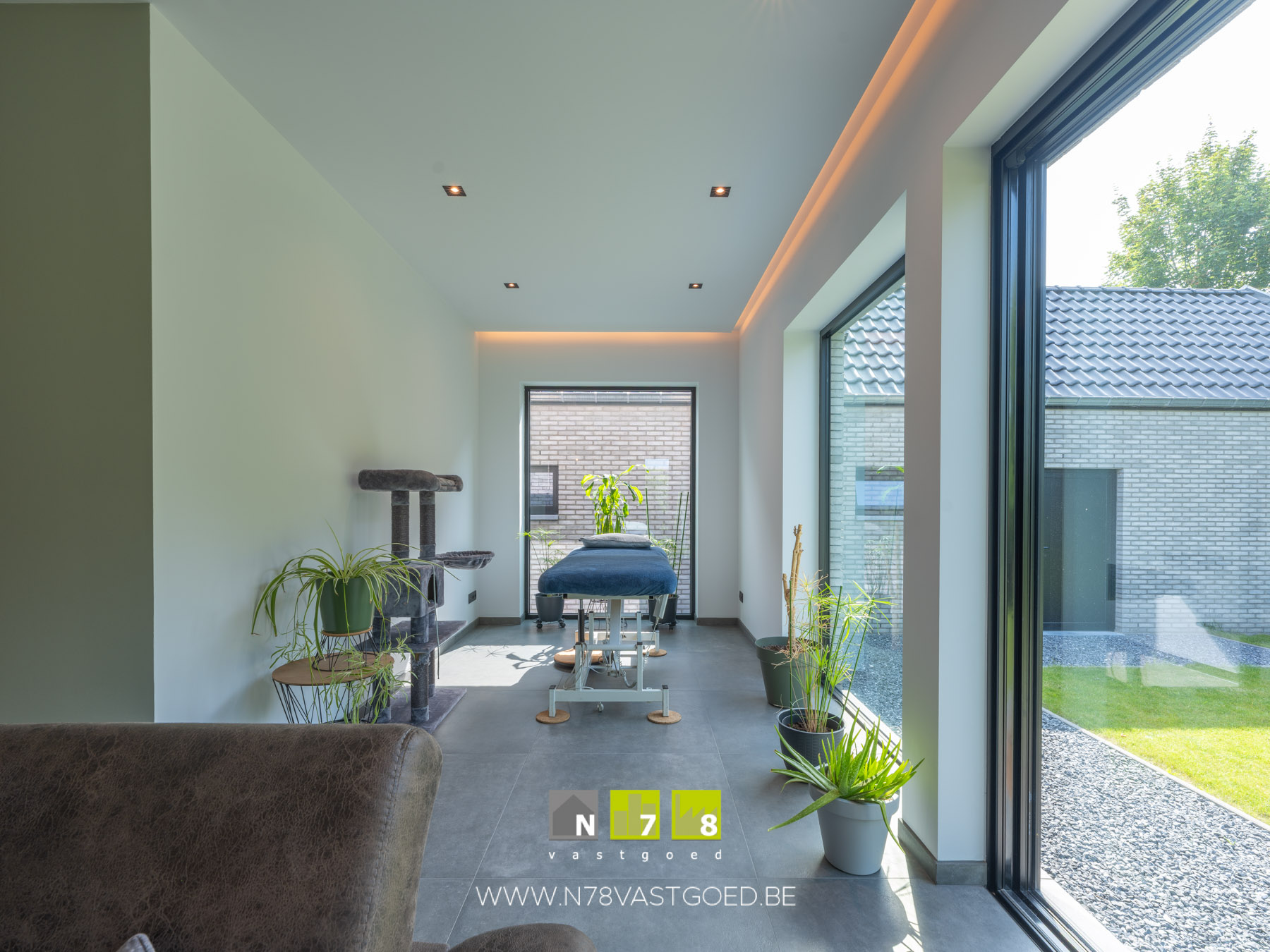 - Zitplaats (4,50m x 5,20m = 23,40m²): airco, veel lichtinval, schuifraam naar tuin, indirecte ledverlichting, tegelvloer.