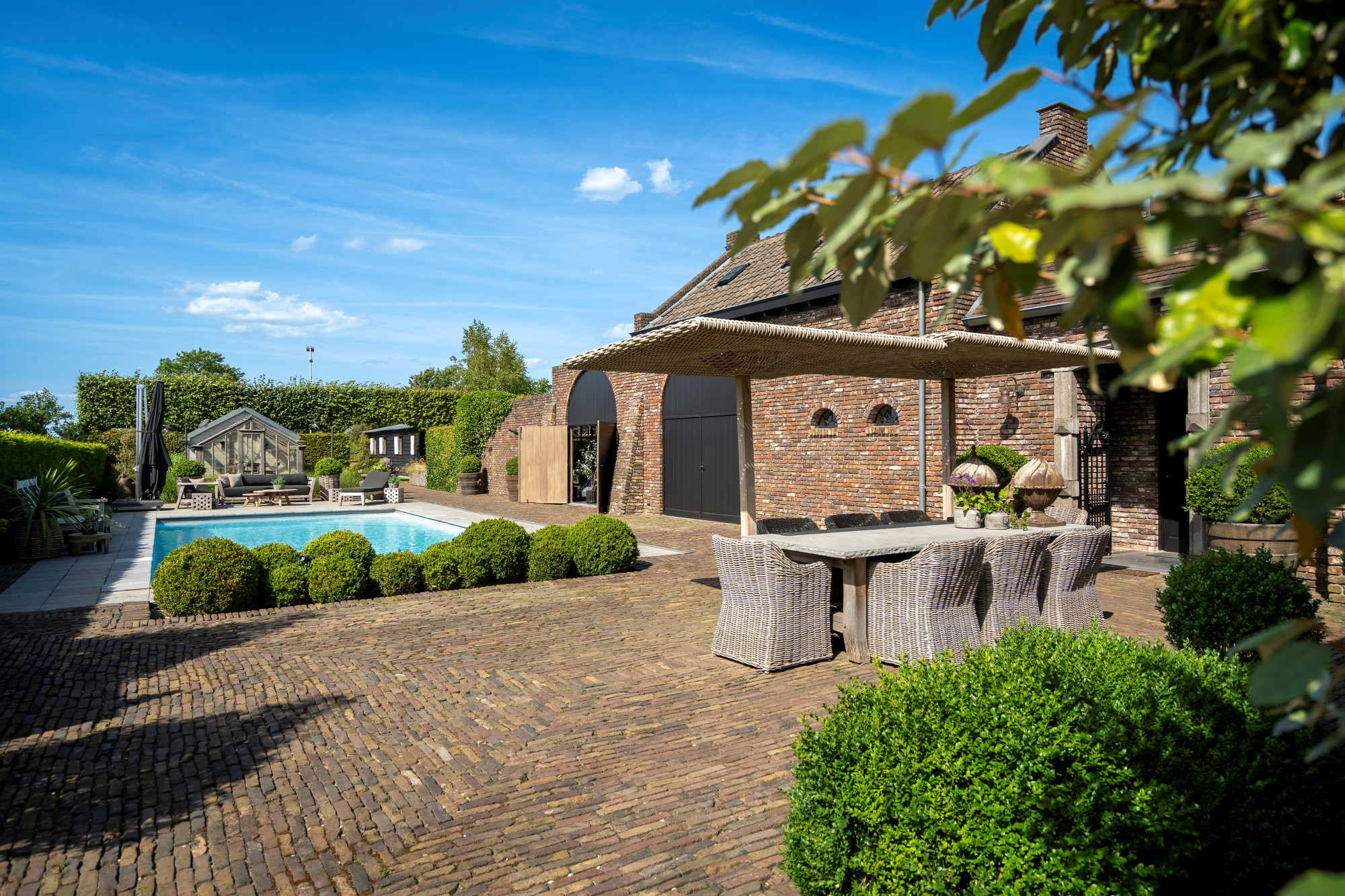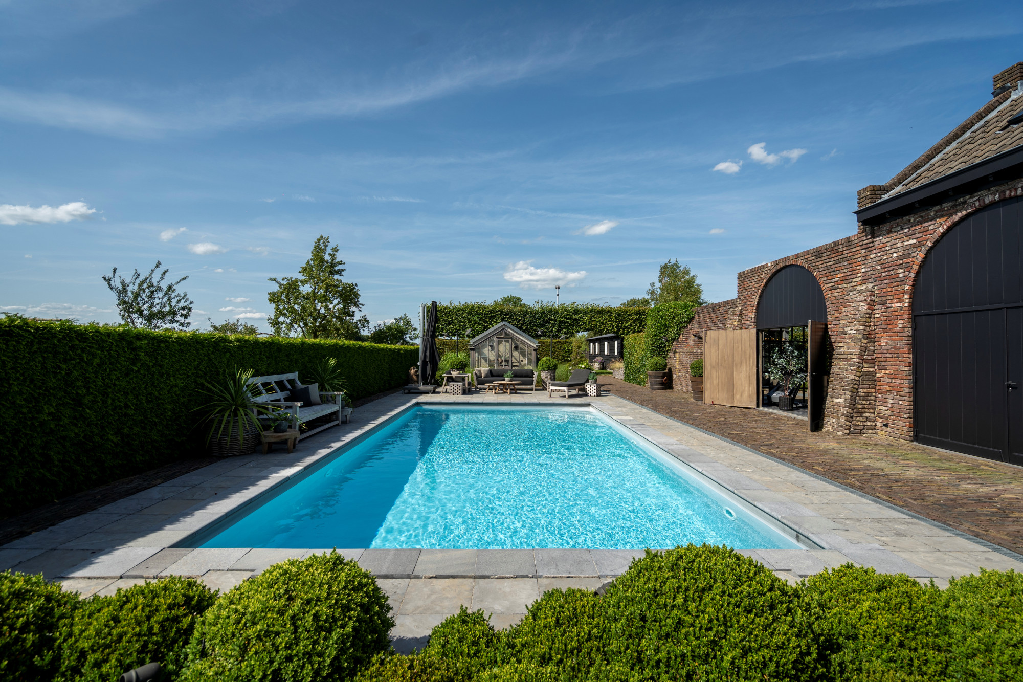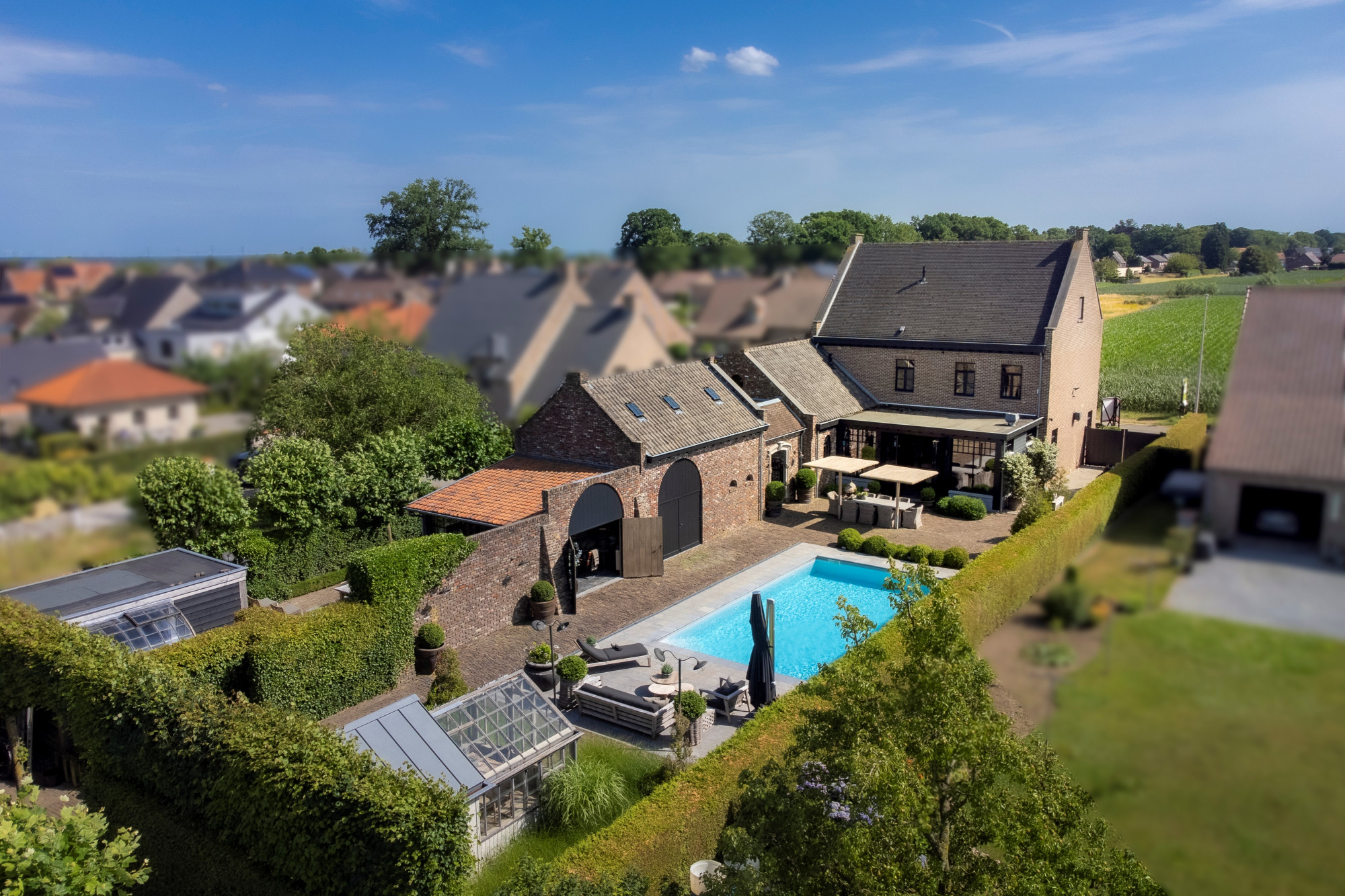 The landscaped ornamental garden is fully enclosed and equipped with an automatic entrance gate. At the heart of the garden lies a large terrace with an outdoor swimming pool (5 × 10 m) and a freestanding greenhouse. At the rear, the property adjoins meadows, a horse arena, and a detached outbuilding with horse stables.