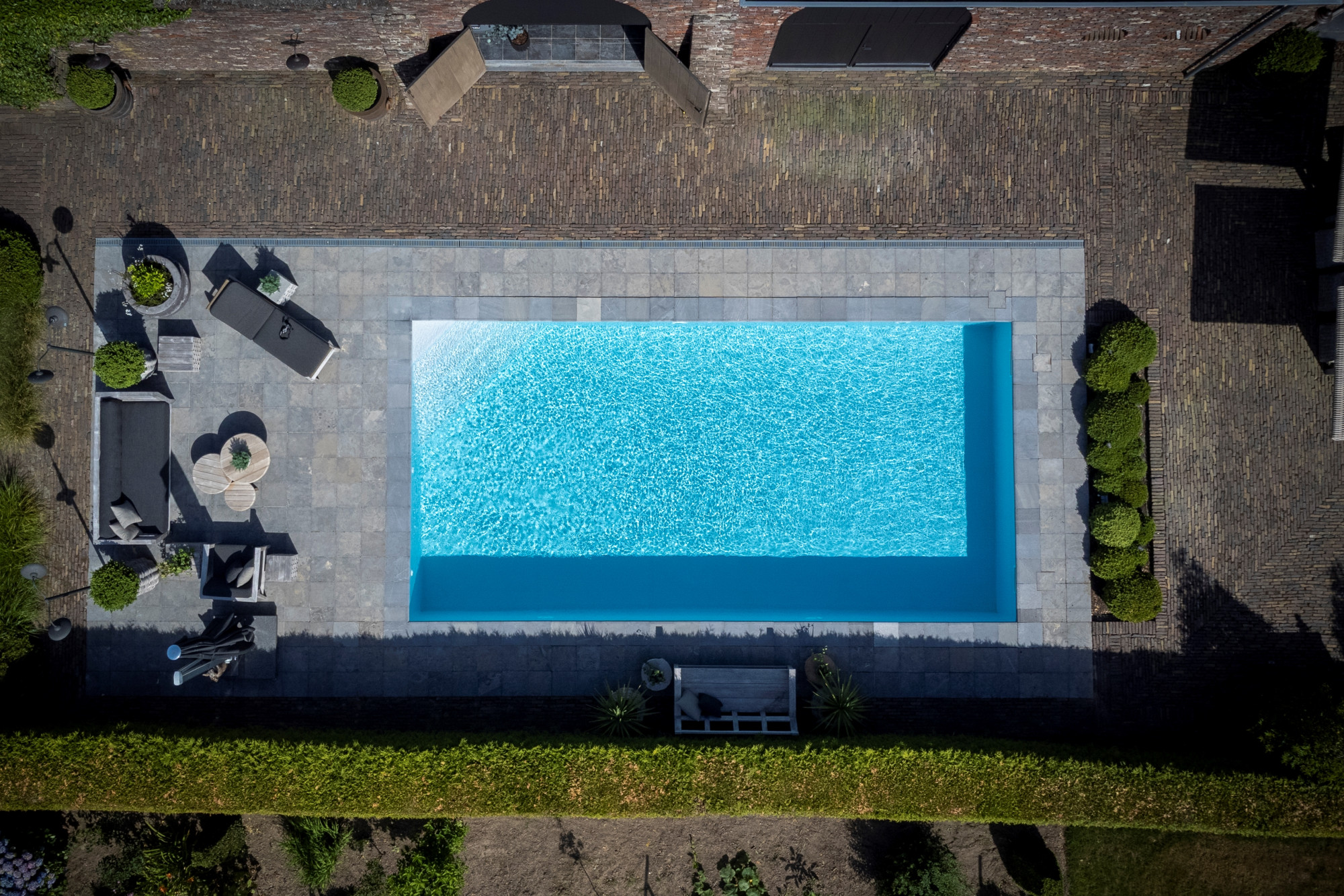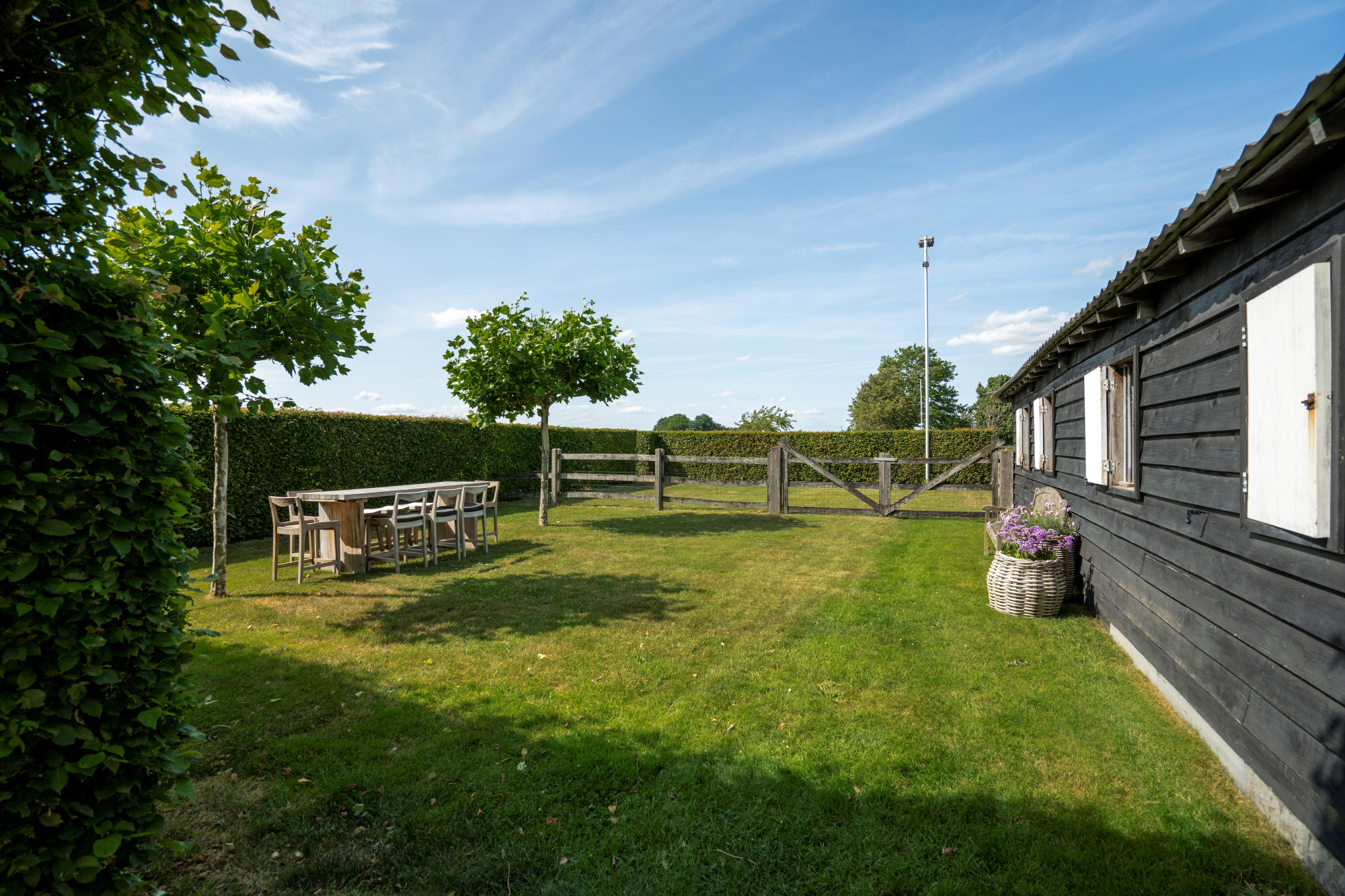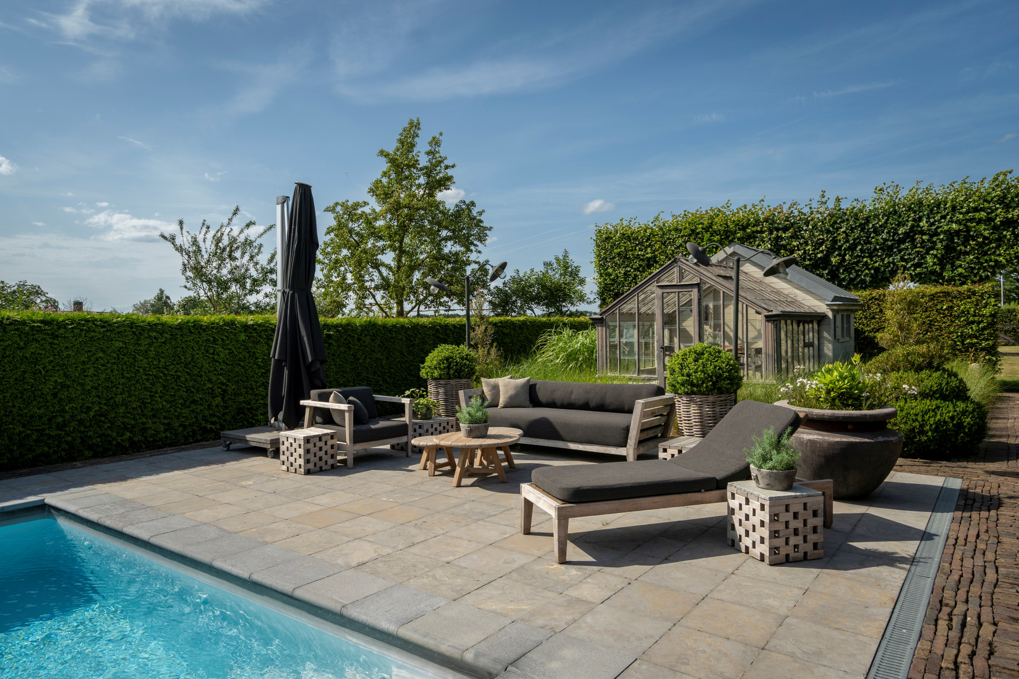 The landscaped ornamental garden is fully enclosed and equipped with an automatic entrance gate. At the heart of the garden lies a large terrace with an outdoor swimming pool (5 × 10 m) and a freestanding greenhouse. At the rear, the property adjoins meadows, a horse arena, and a detached outbuilding with horse stables.