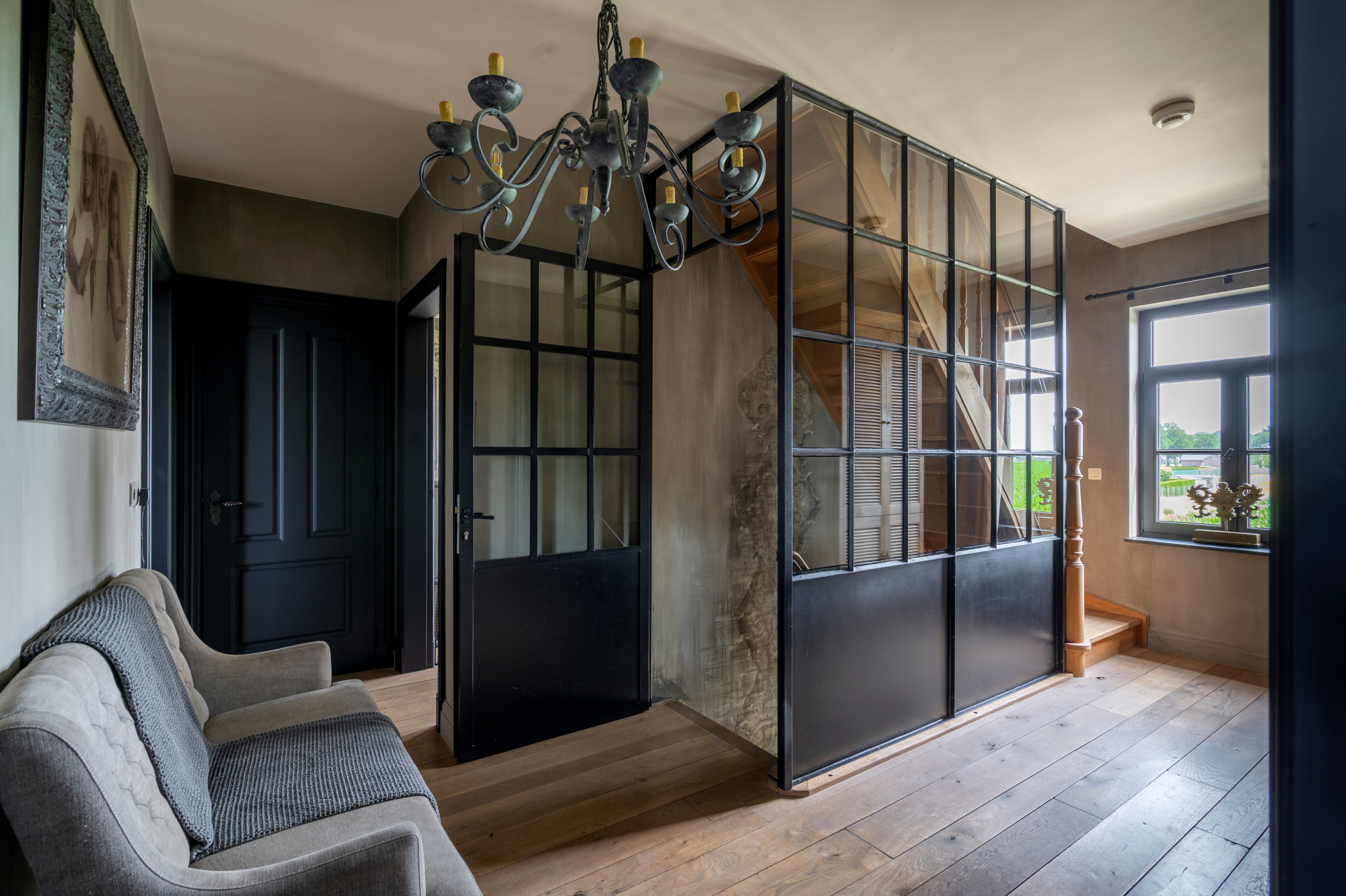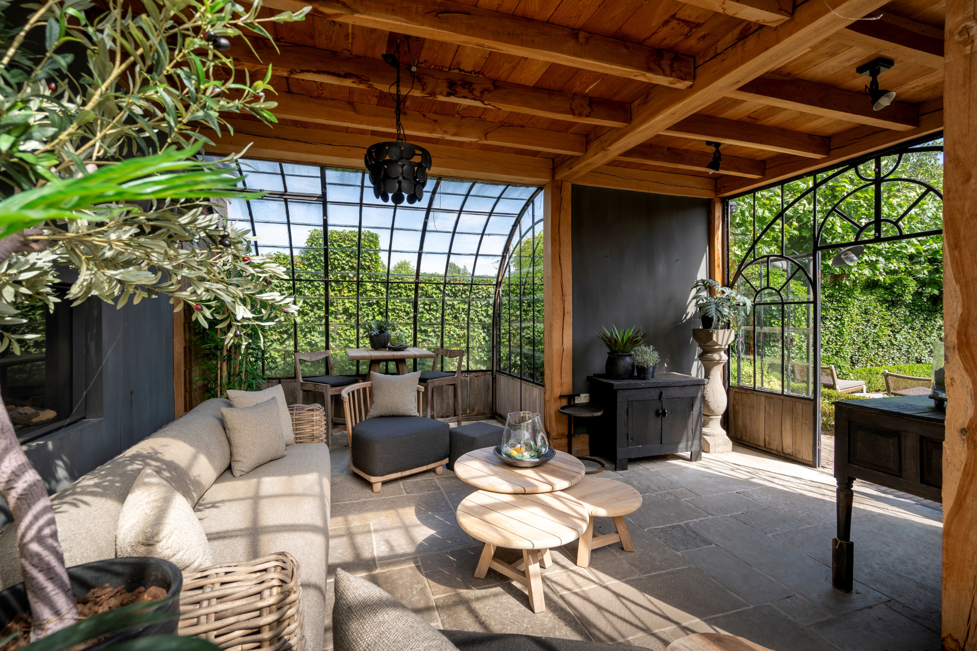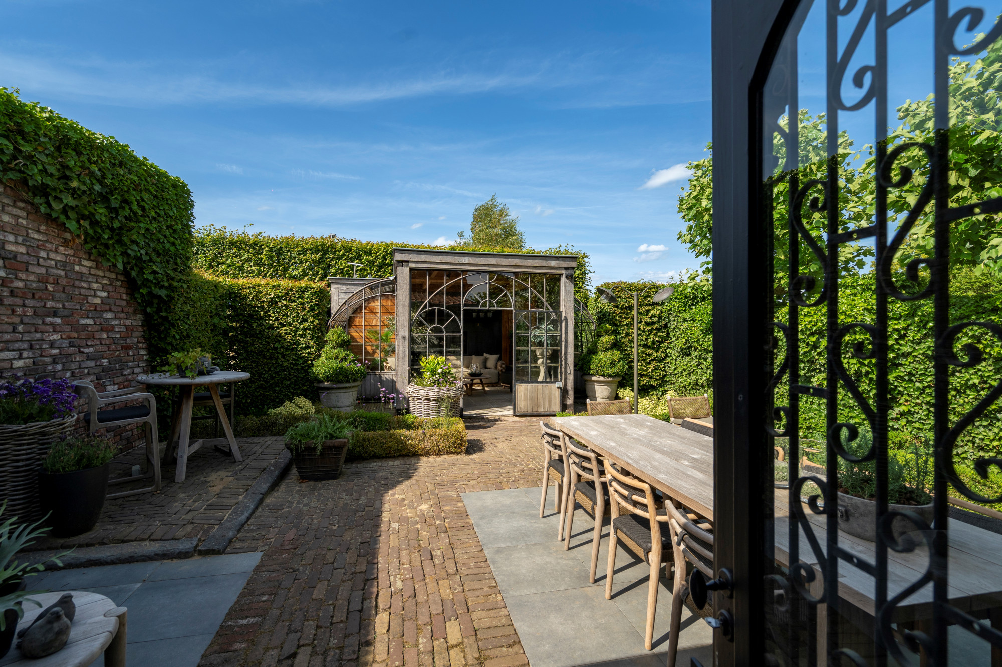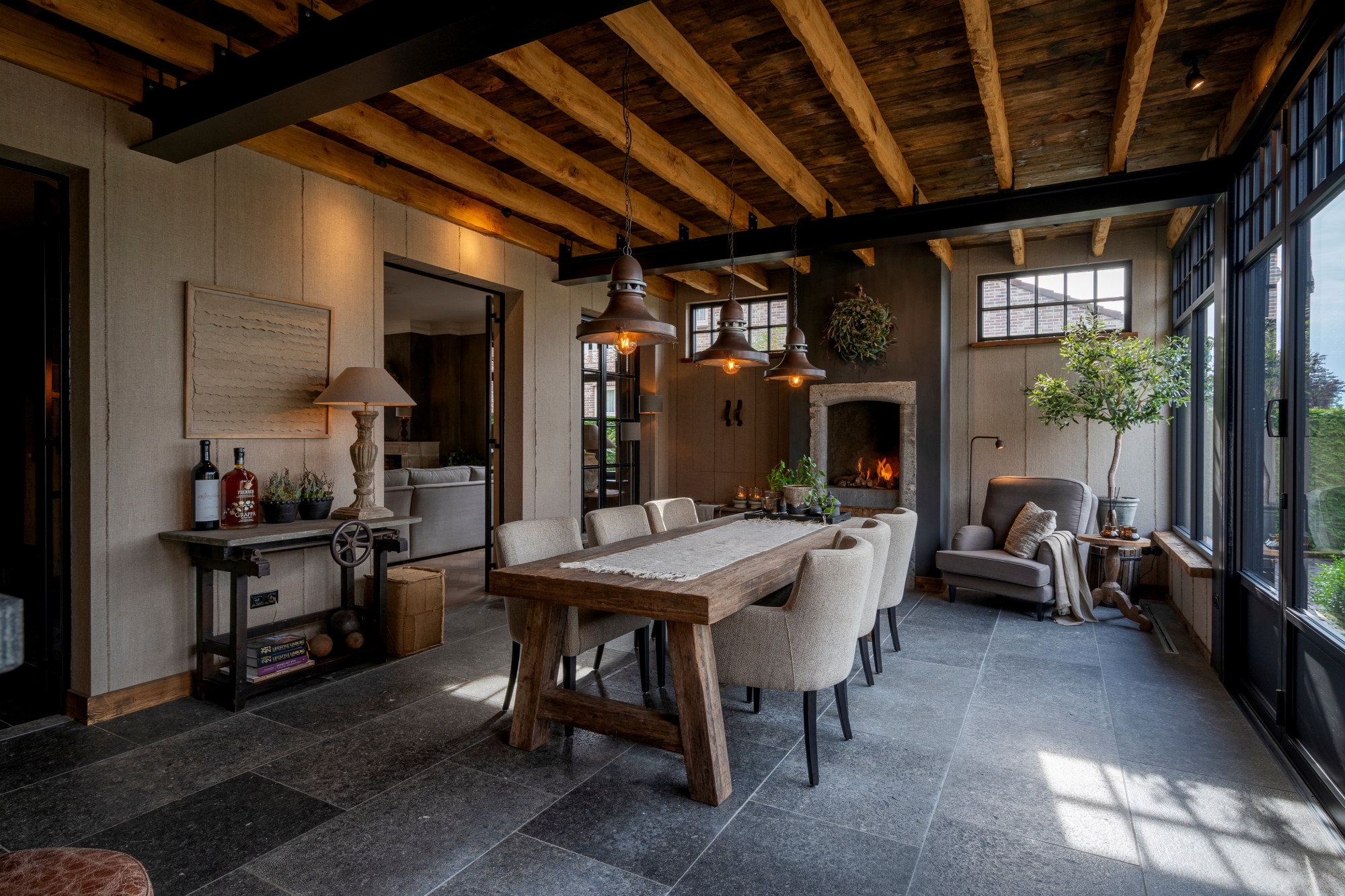 The annex is currently set up as a studio/shop with a separate entrance door. Behind the studio is a staircase hall with access to both the basement and the first floor. On the ground level, the annex also includes a living room with a gas fireplace, a garden room arranged as a dining area with access to the patio, and across the patio, a spacious winter garden.