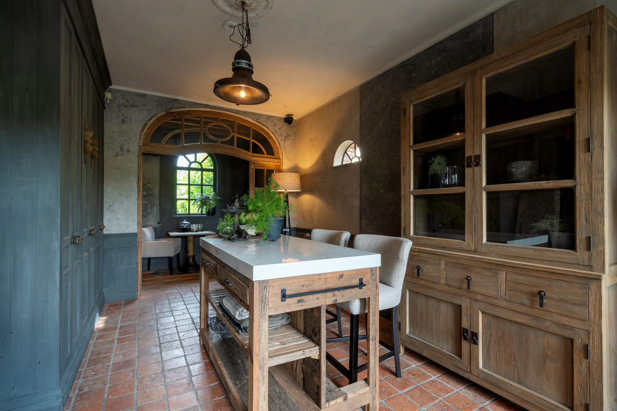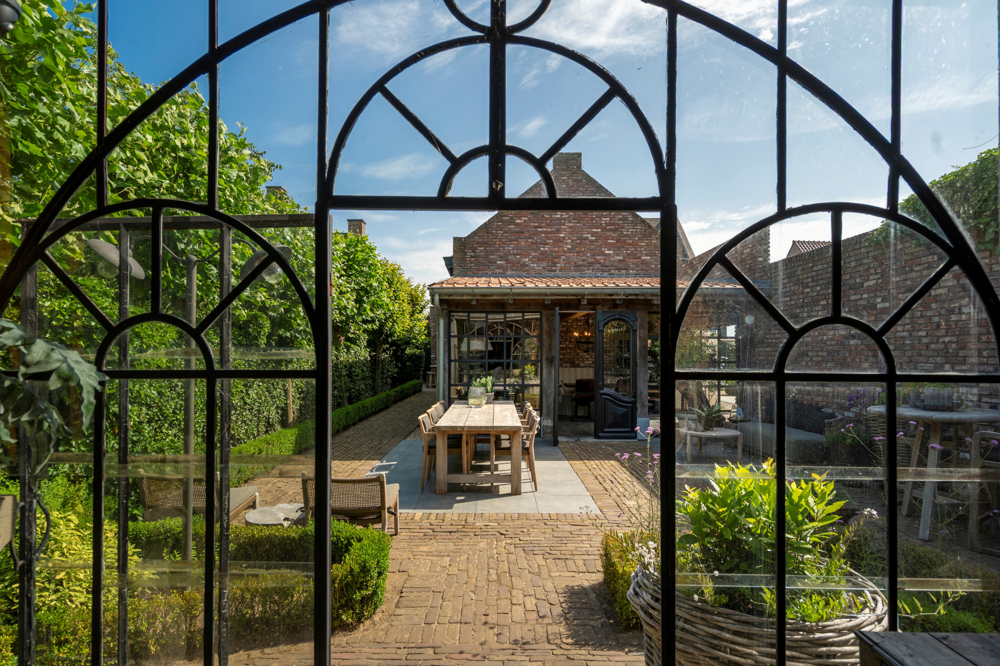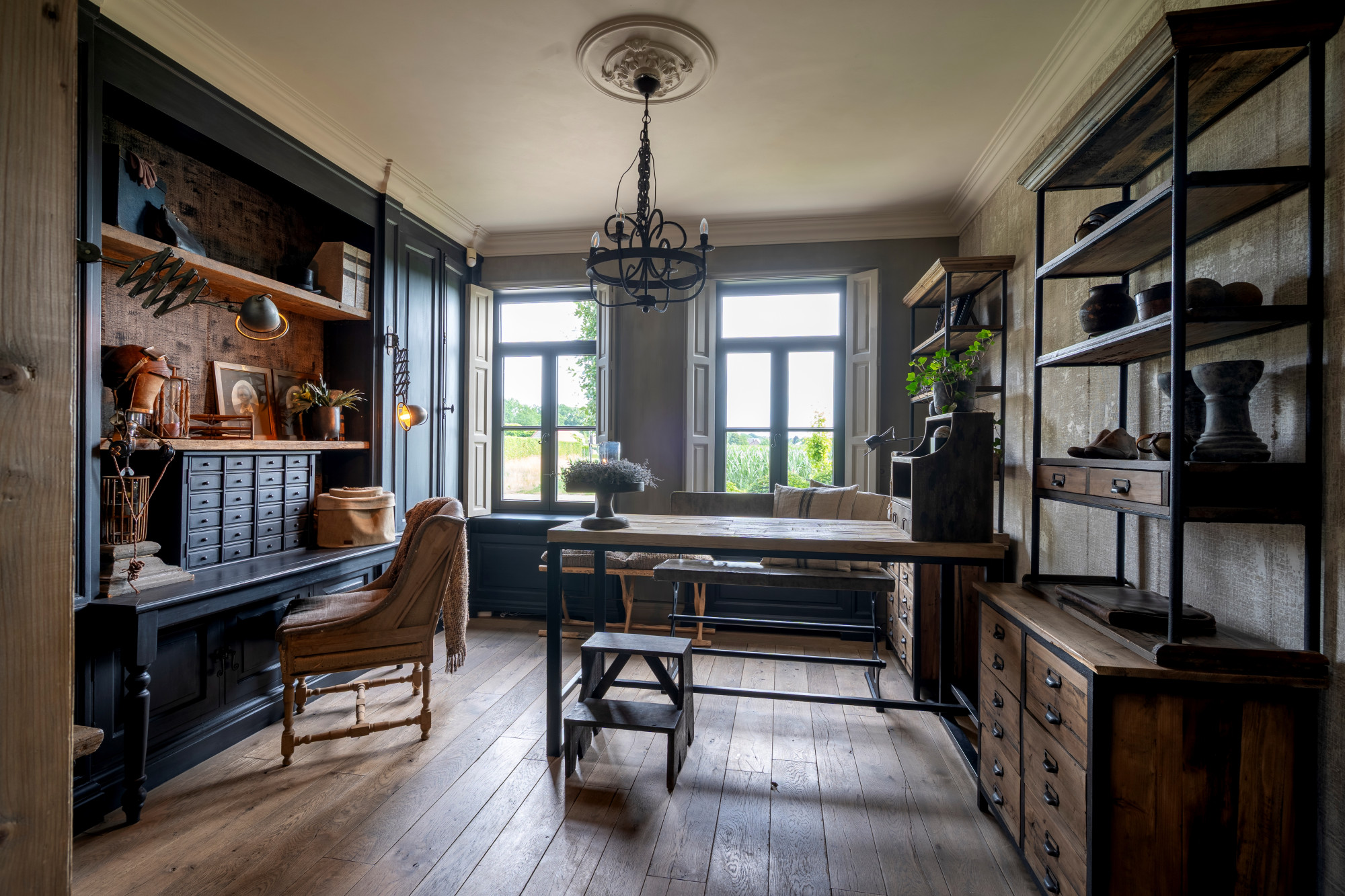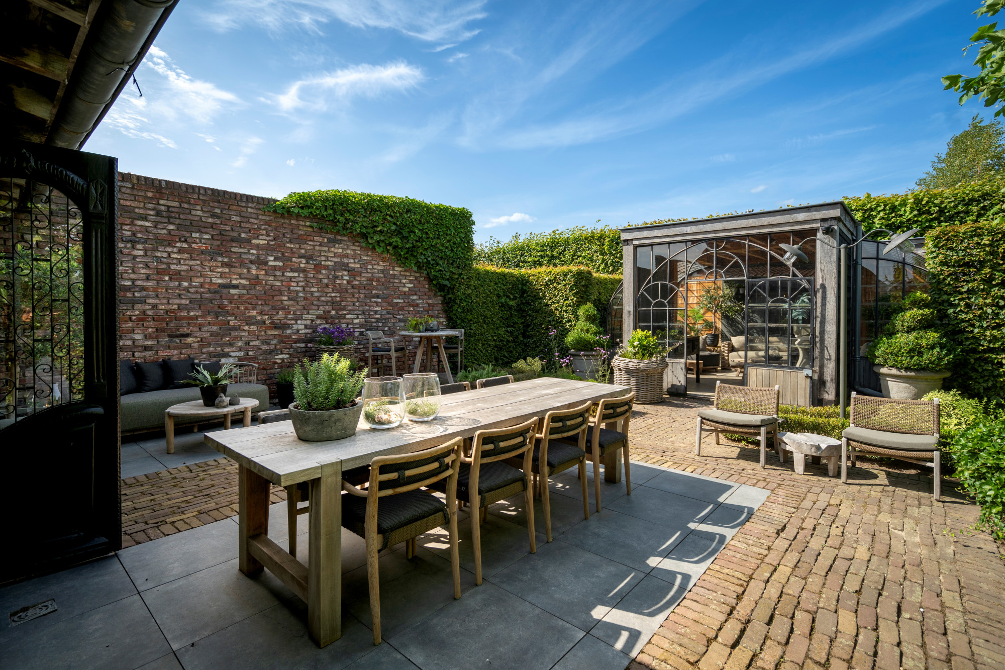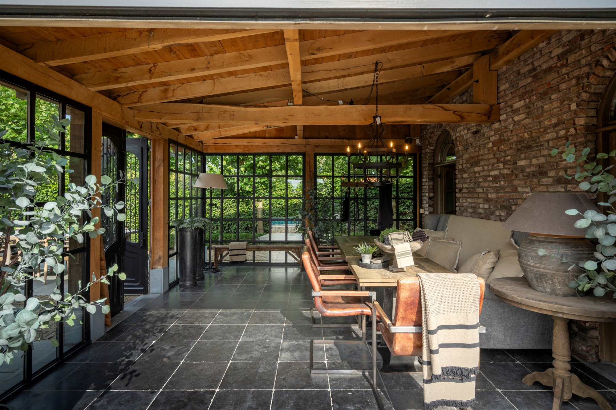 The annex is currently set up as a studio/shop with a separate entrance door. Behind the studio is a staircase hall with access to both the basement and the first floor. On the ground level, the annex also includes a living room with a gas fireplace, a garden room arranged as a dining area with access to the patio, and across the patio, a spacious winter garden.