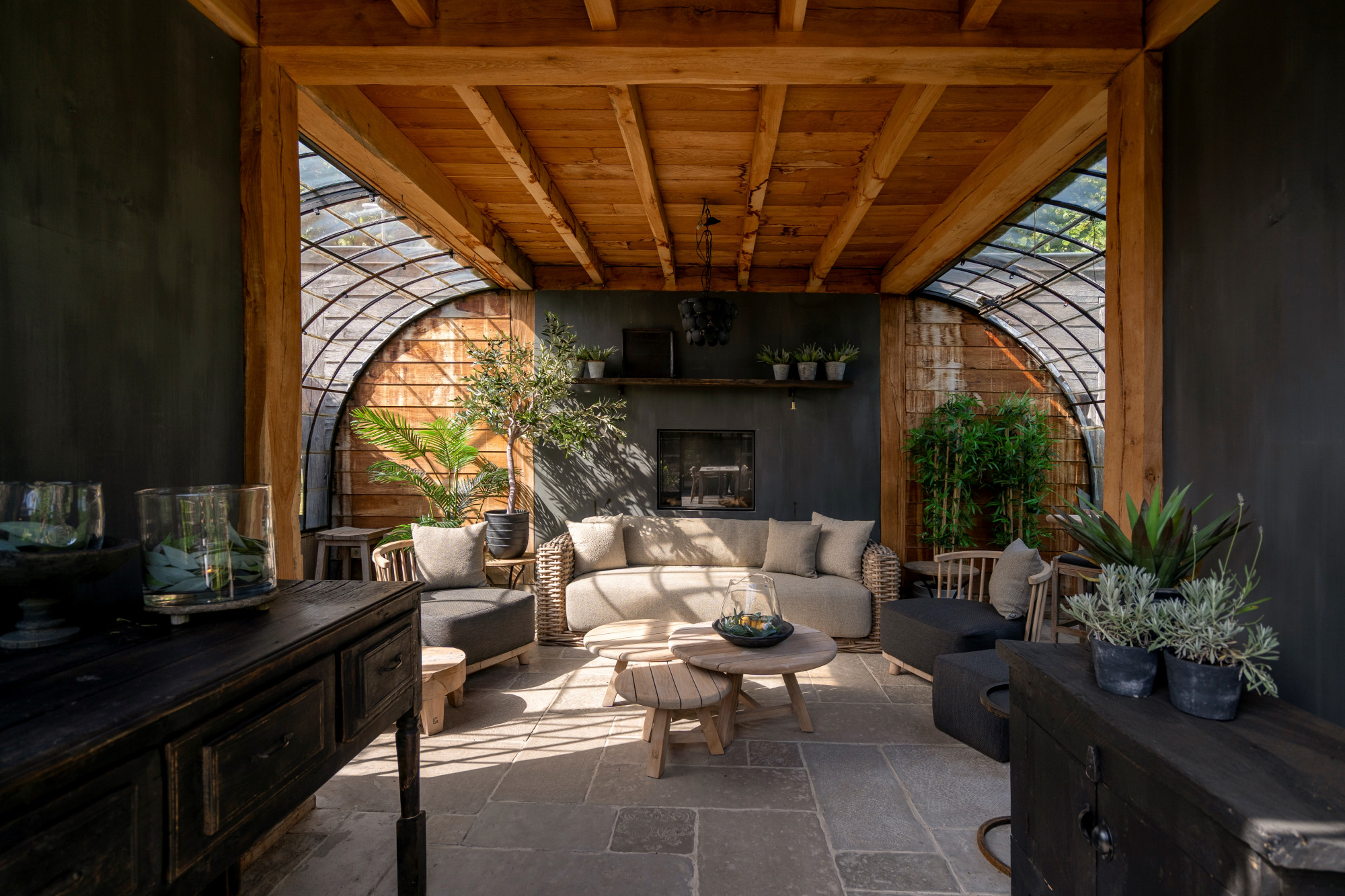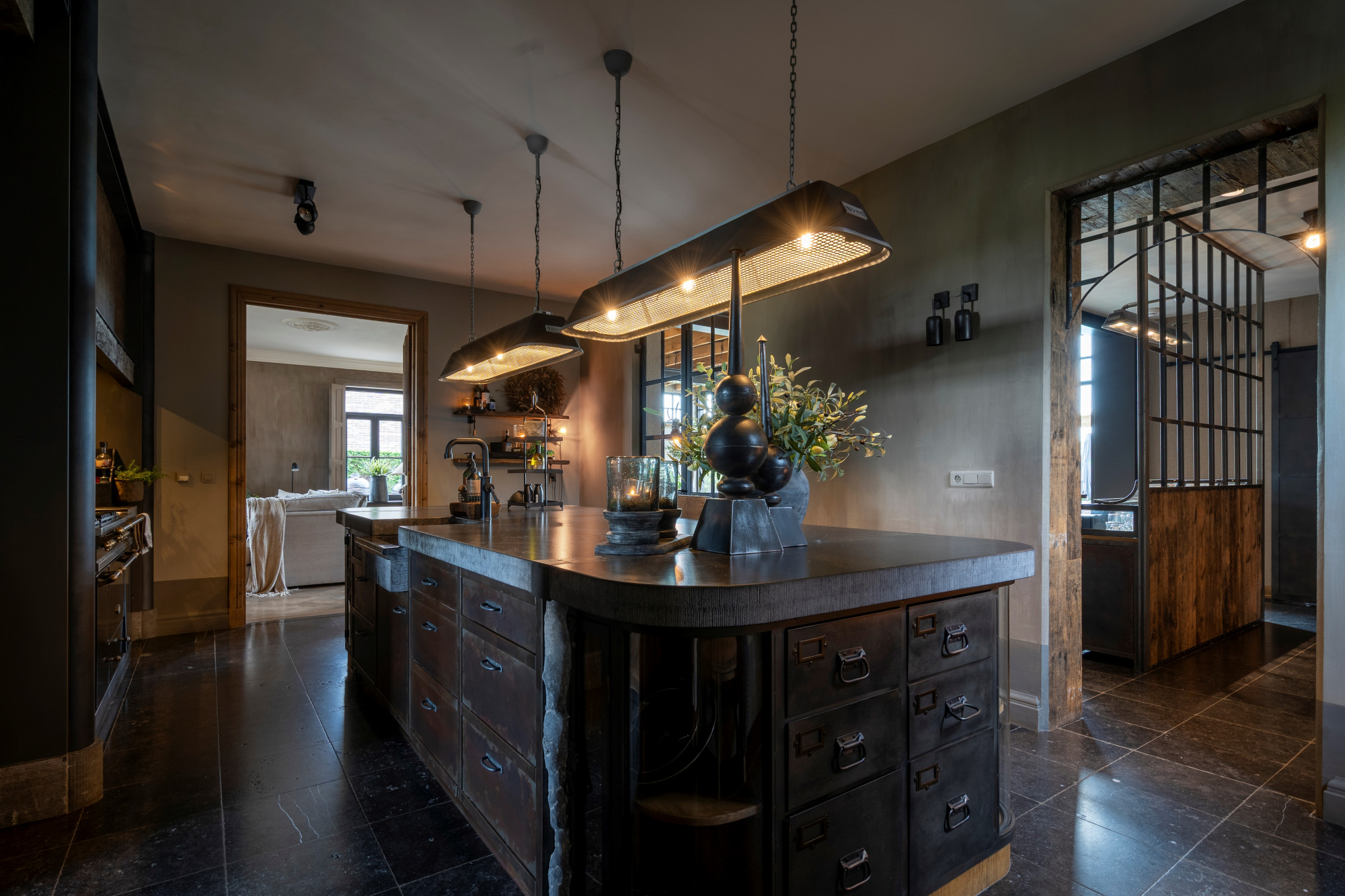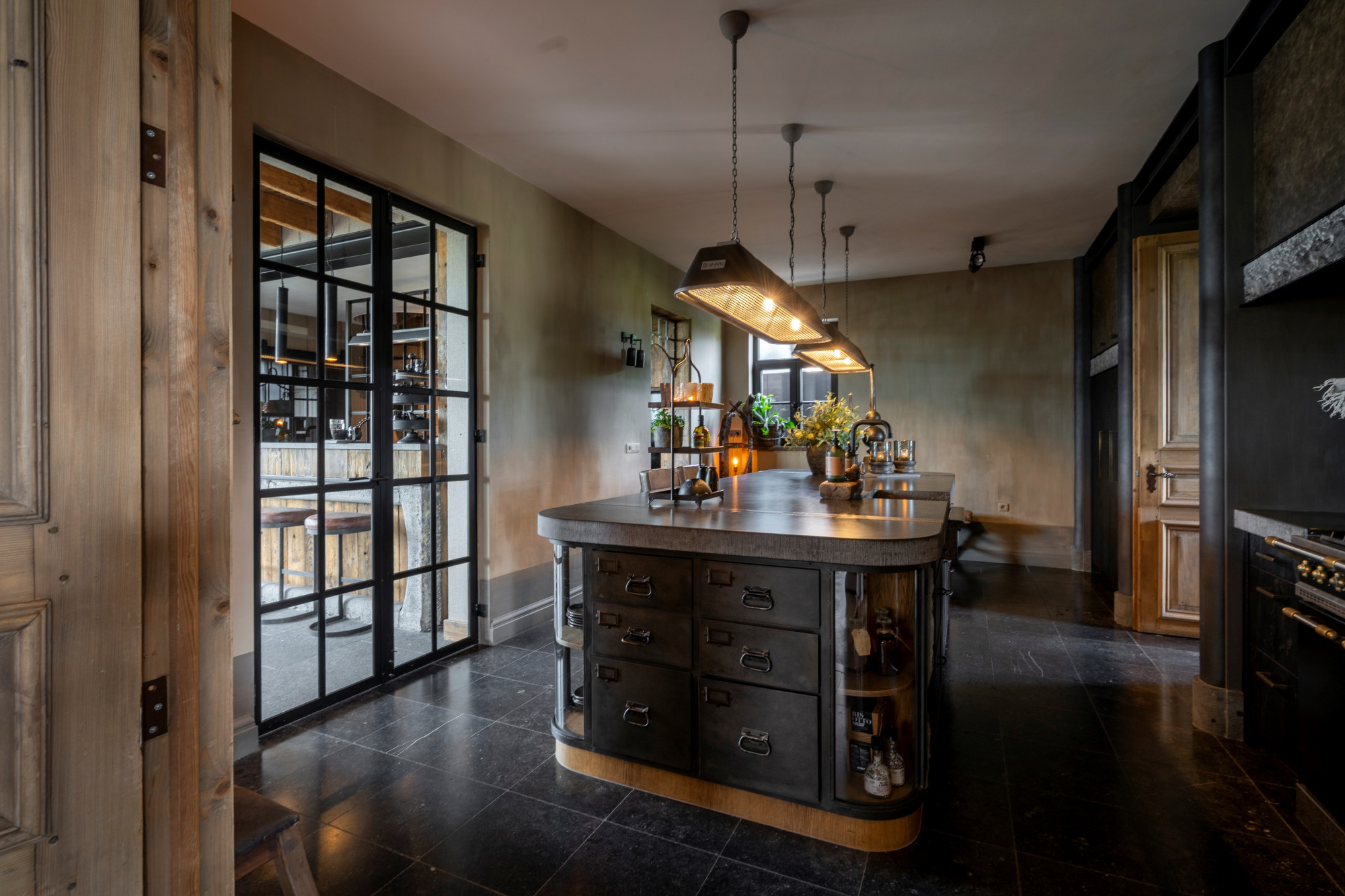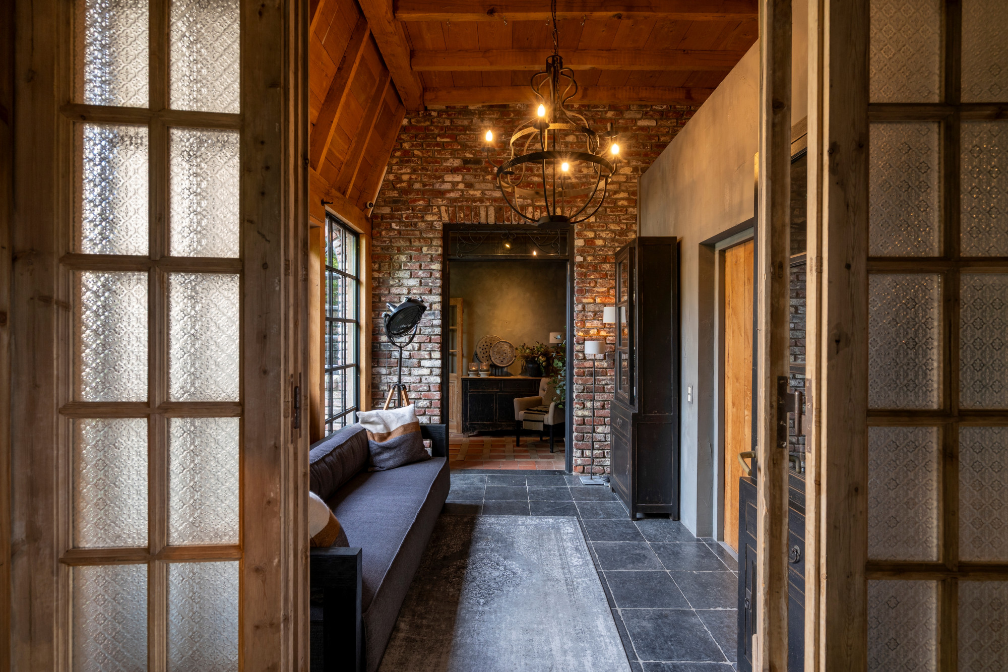 The annex is currently set up as a studio/shop with a separate entrance door. Behind the studio is a staircase hall with access to both the basement and the first floor. On the ground level, the annex also includes a living room with a gas fireplace, a garden room arranged as a dining area with access to the patio, and across the patio, a spacious winter garden.