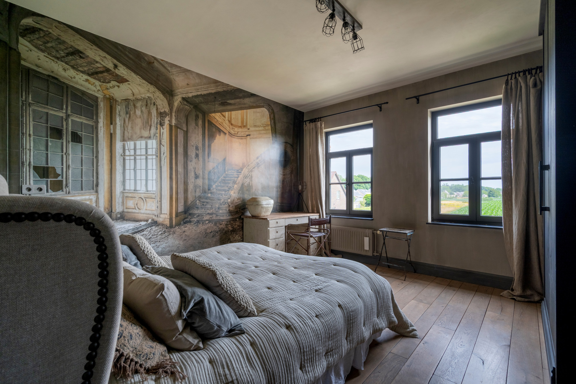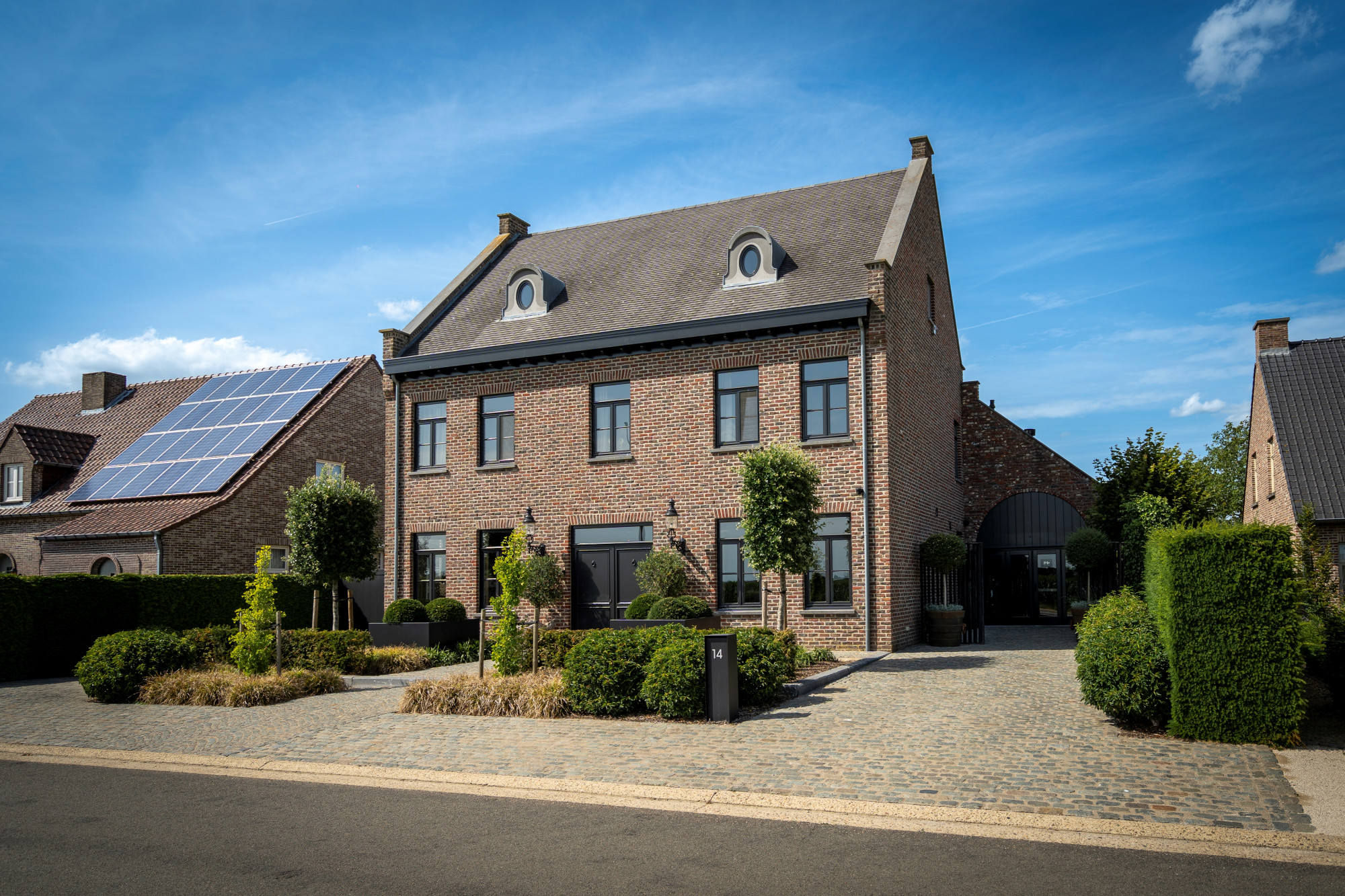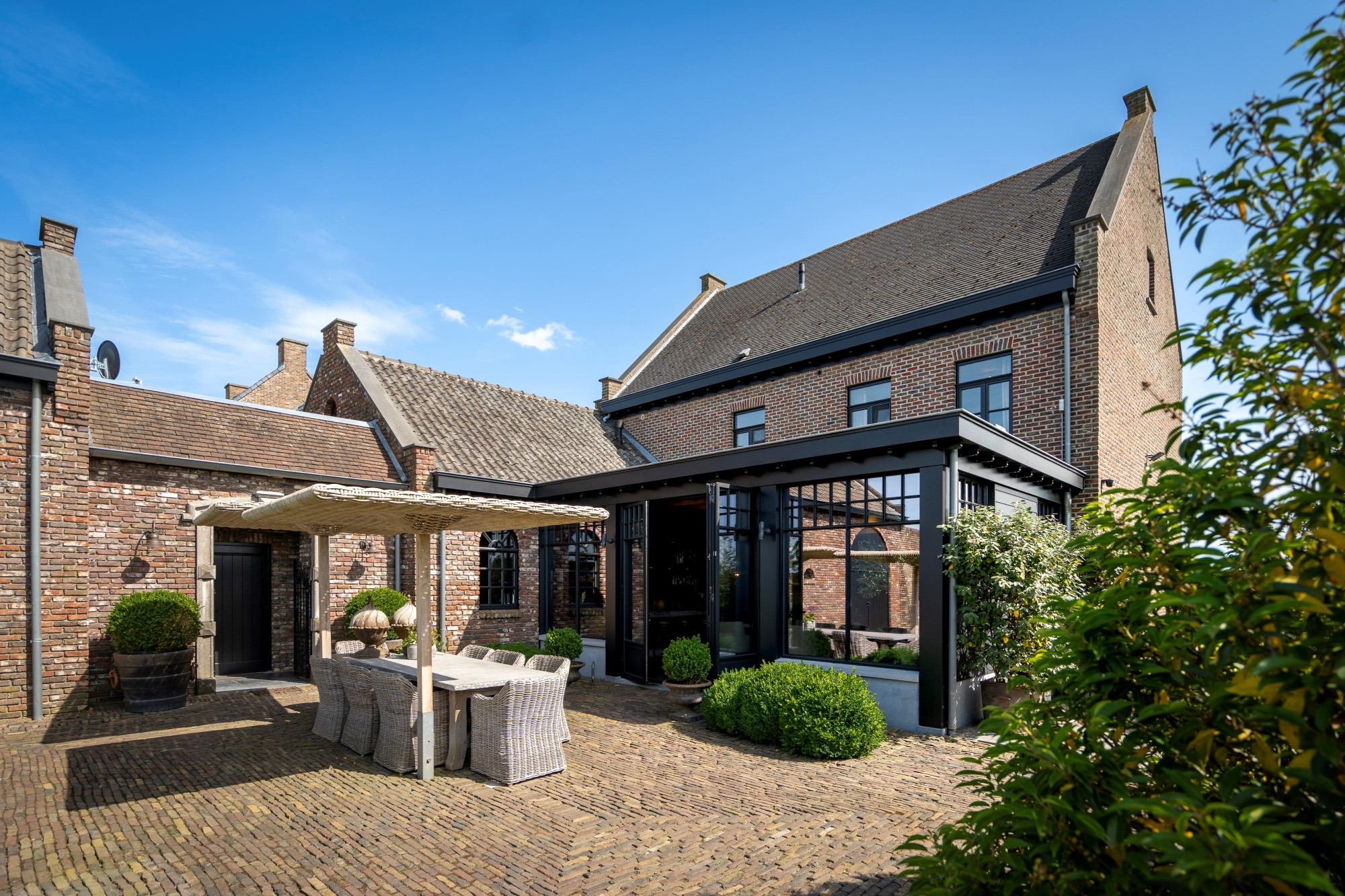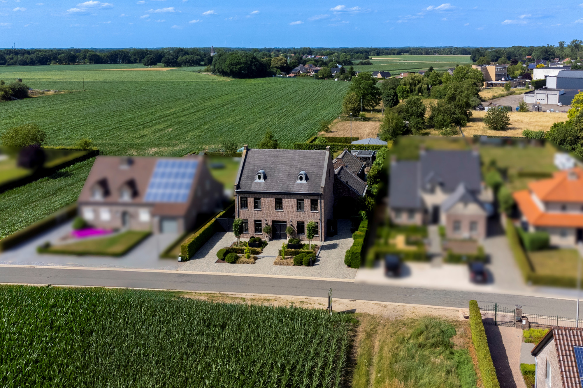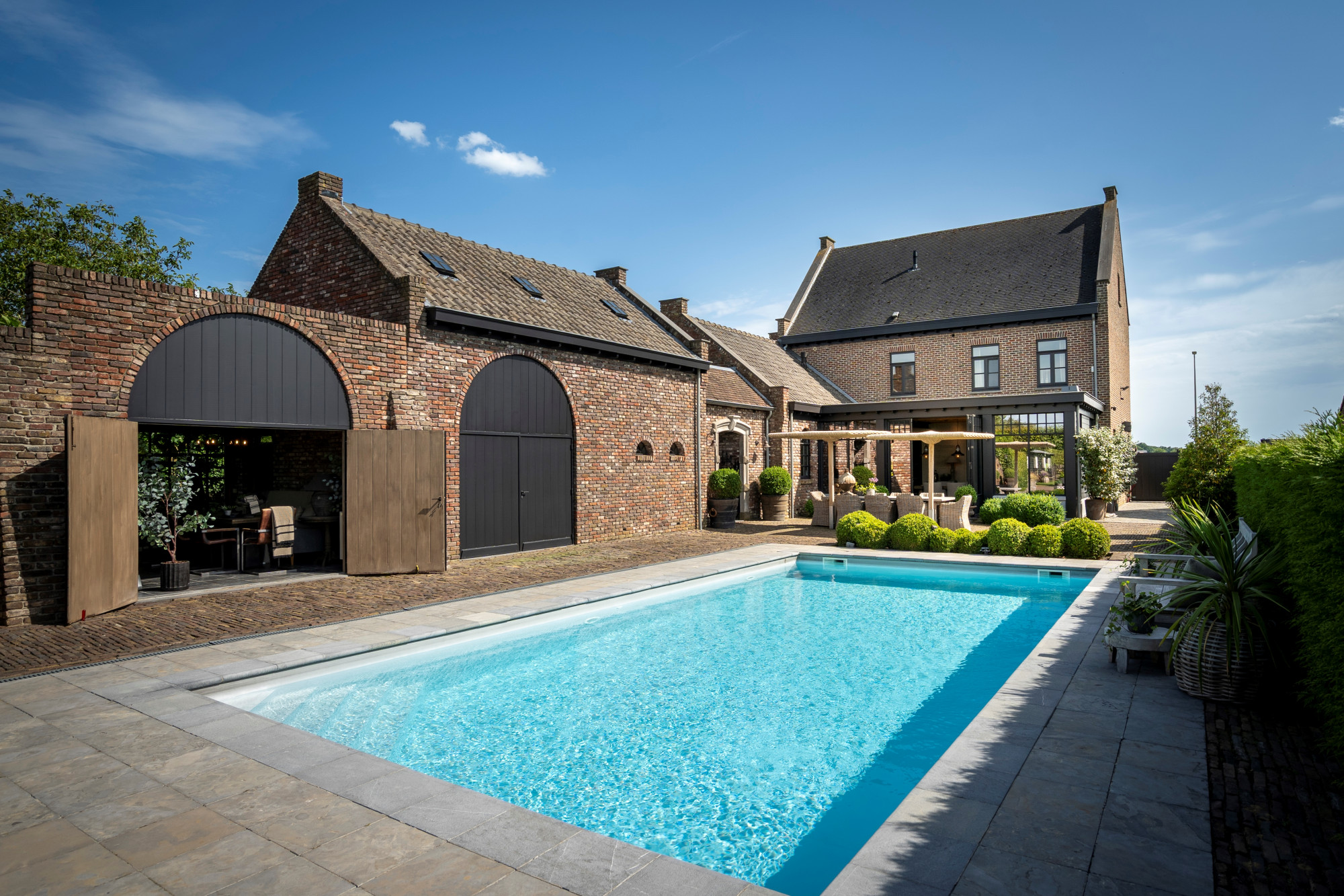 This stylishly decorated manor house, built in 2001, is located in a quiet, rural setting in Kessenich, a sub-municipality of Kinrooi, just a stone’s throw from the Dutch border. The home is situated on a 4,026 m² plot and offers a generous living area of 533 m². The main building includes, among other features, 5 bedrooms, 2 bathrooms, and a cozy garden room with a bar. The extension on the right side is multifunctional and perfectly suited as a practice space, care unit, or guest accommodation. Additional highlights include an outdoor swimming pool, an atmospheric winter garden, and a rear meadow with horse stables.