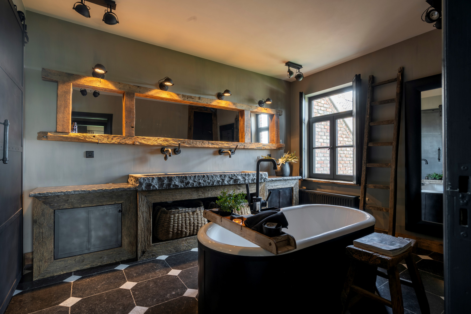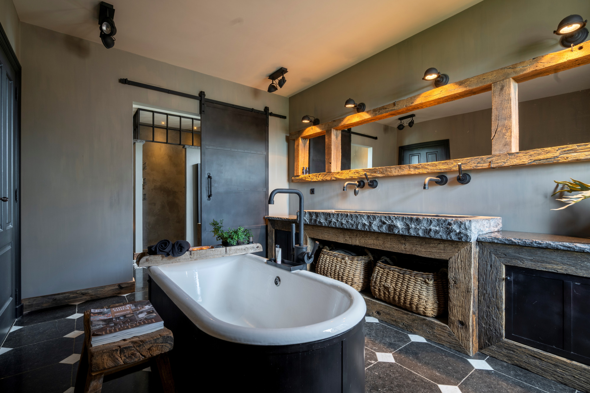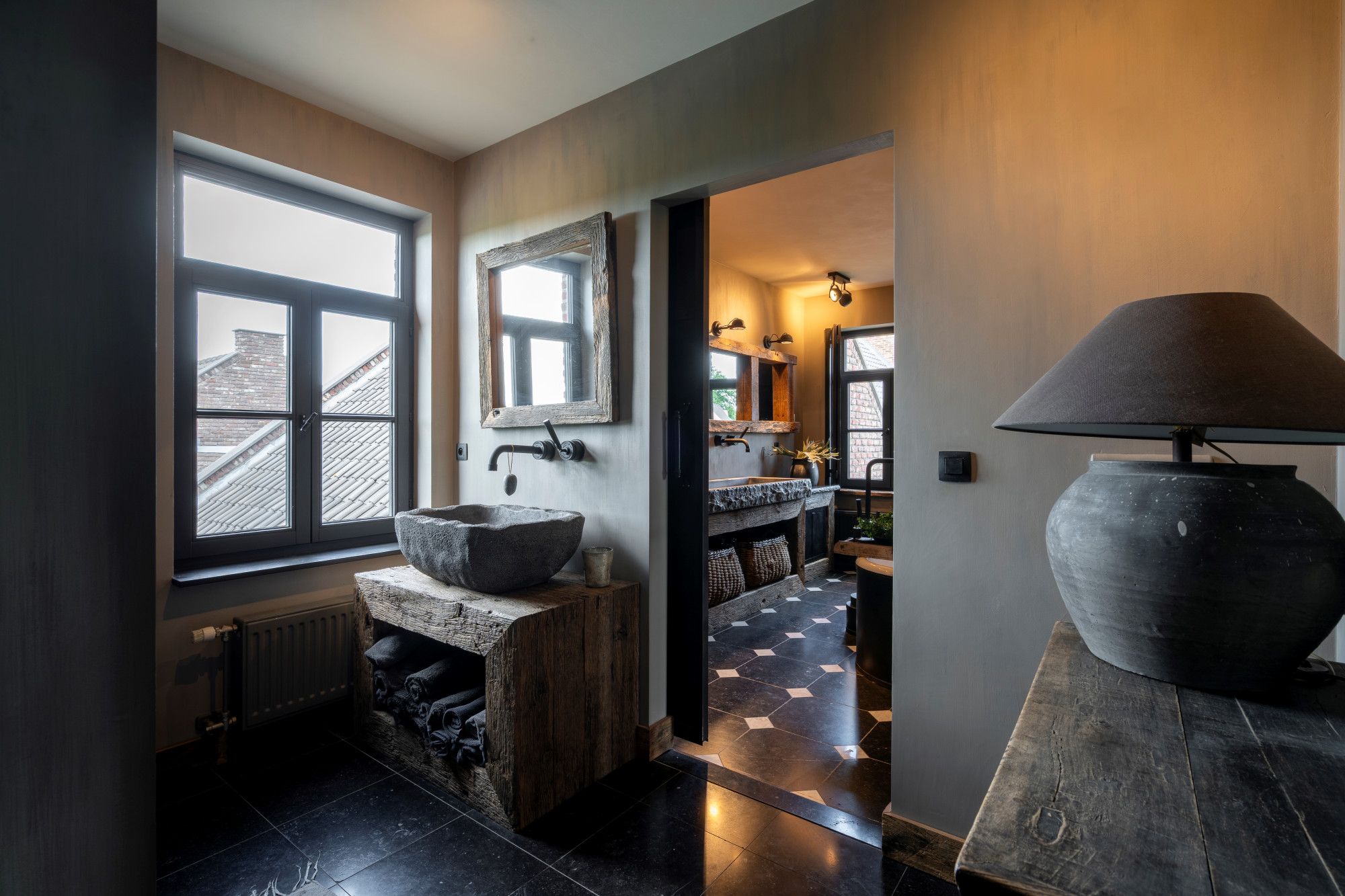 The first floor houses three spacious bedrooms, a separate toilet, and two interconnected bathrooms. One bathroom is fitted with a walk-in shower and double washbasin, while the other features a freestanding bathtub and double washbasin. Both bathrooms are finished with custom-made elements, including blue stone sinks and Jee-O fixtures.