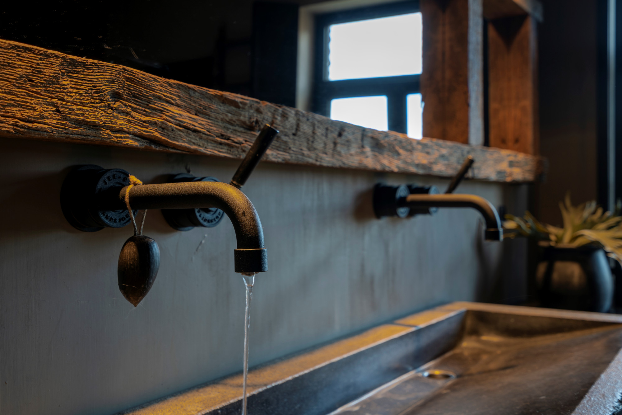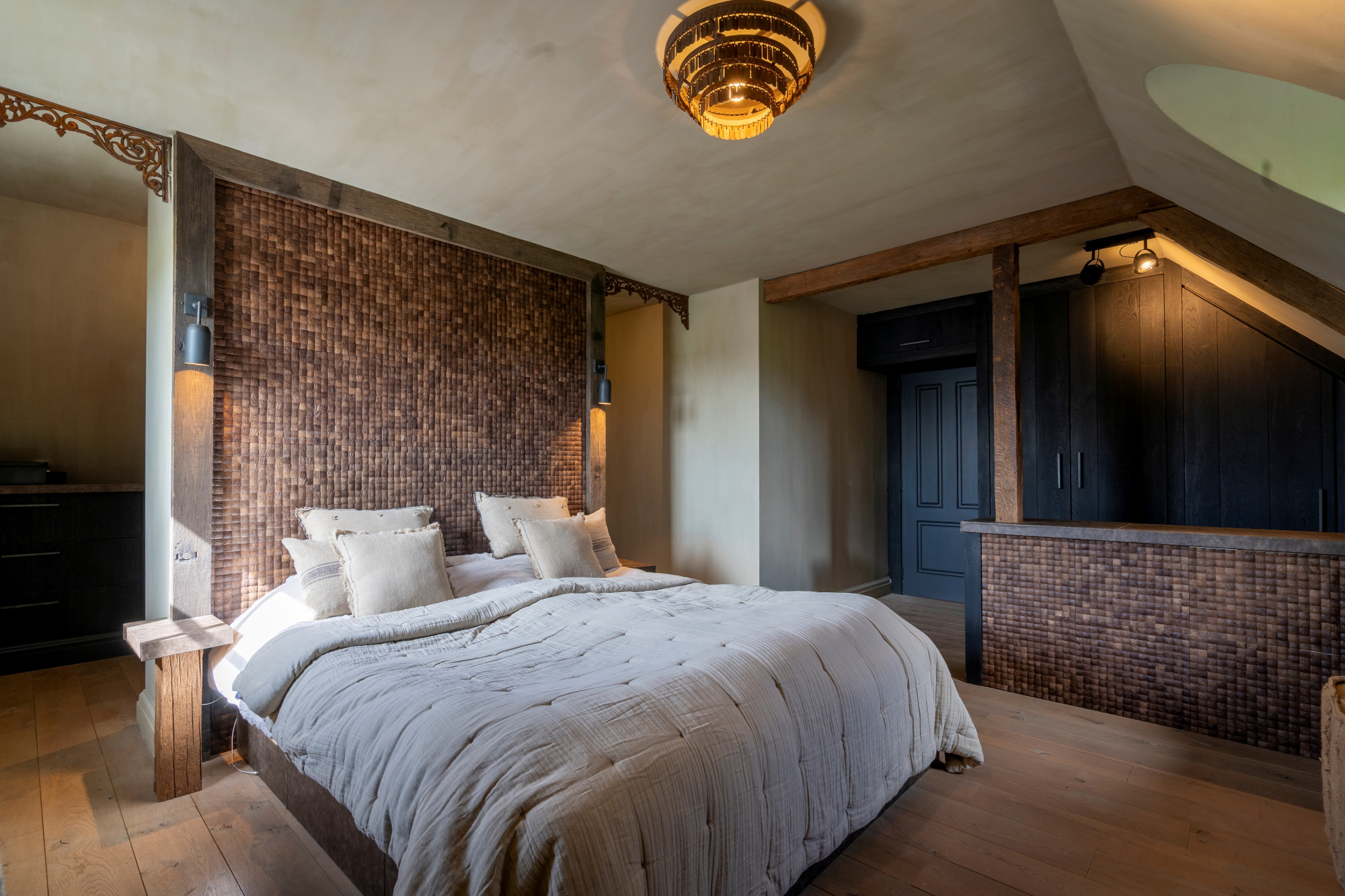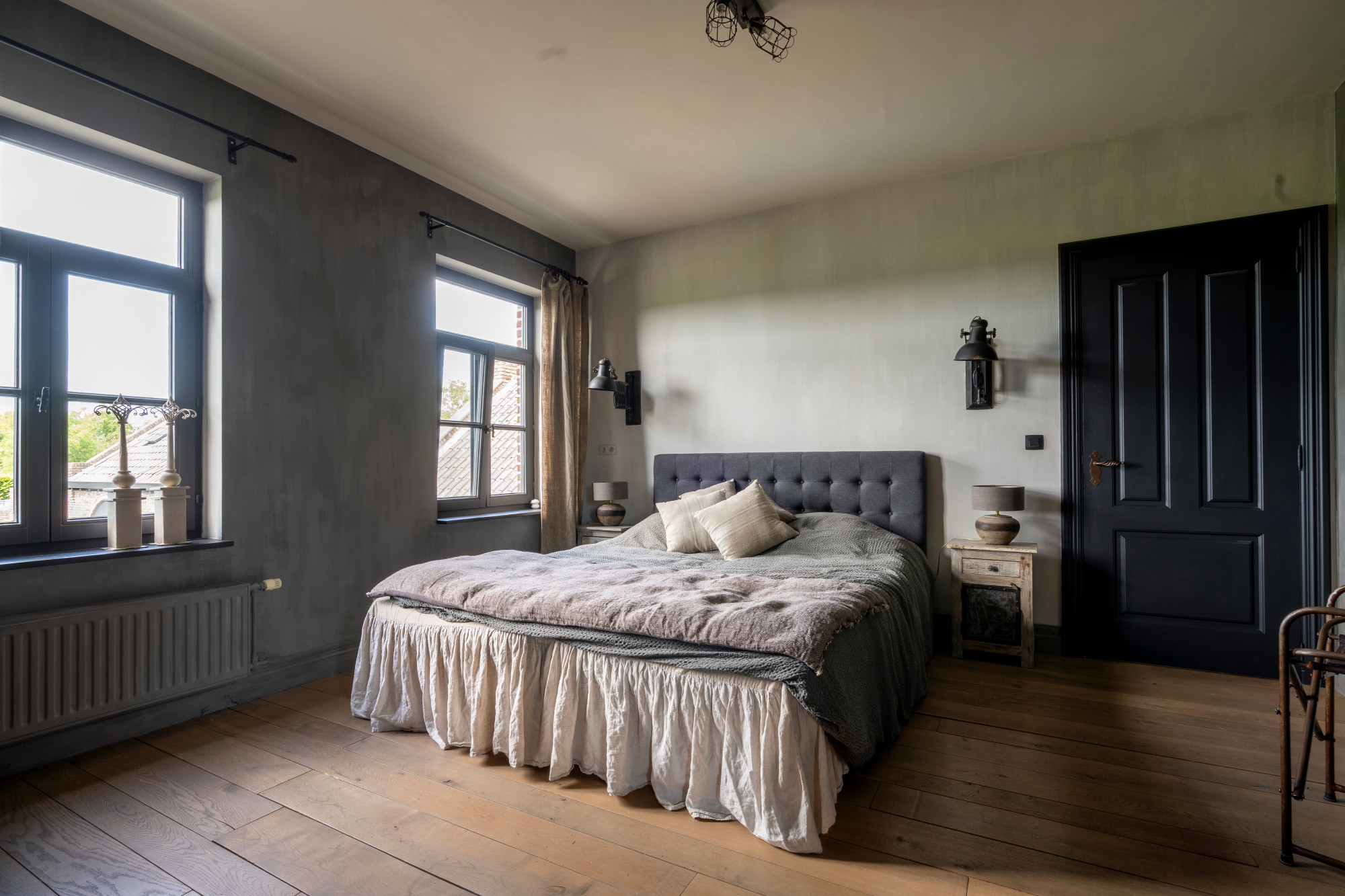 The first floor houses three spacious bedrooms, a separate toilet, and two interconnected bathrooms. One bathroom is fitted with a walk-in shower and double washbasin, while the other features a freestanding bathtub and double washbasin. Both bathrooms are finished with custom-made elements, including blue stone sinks and Jee-O fixtures.