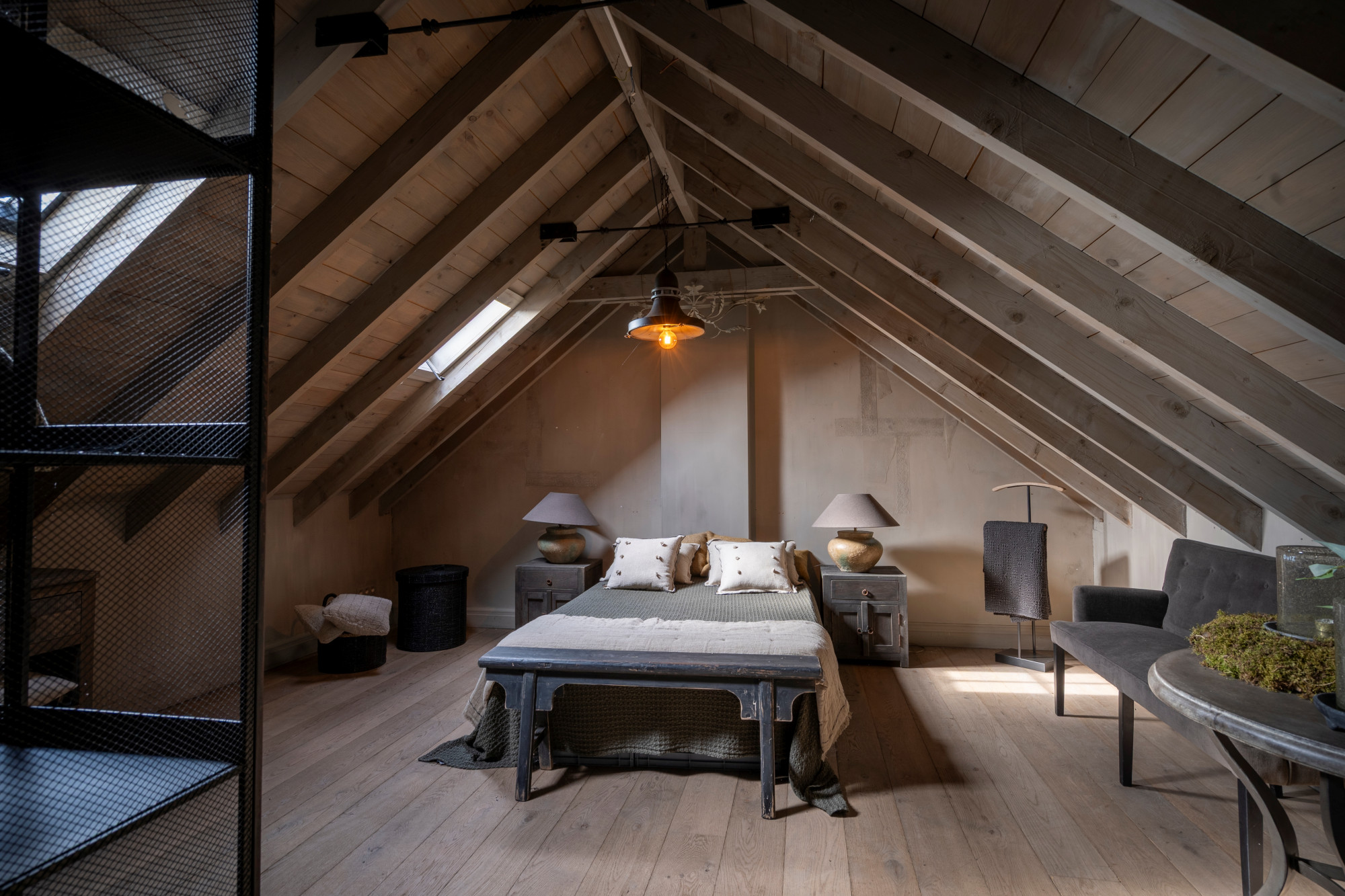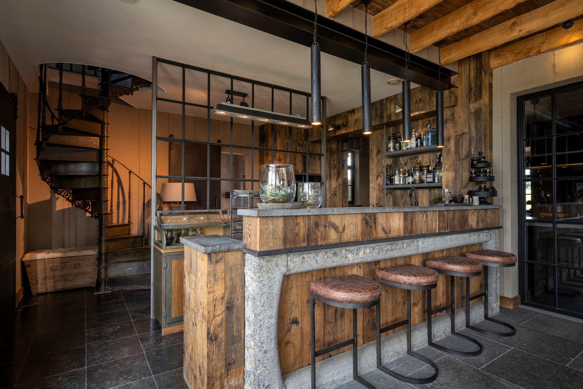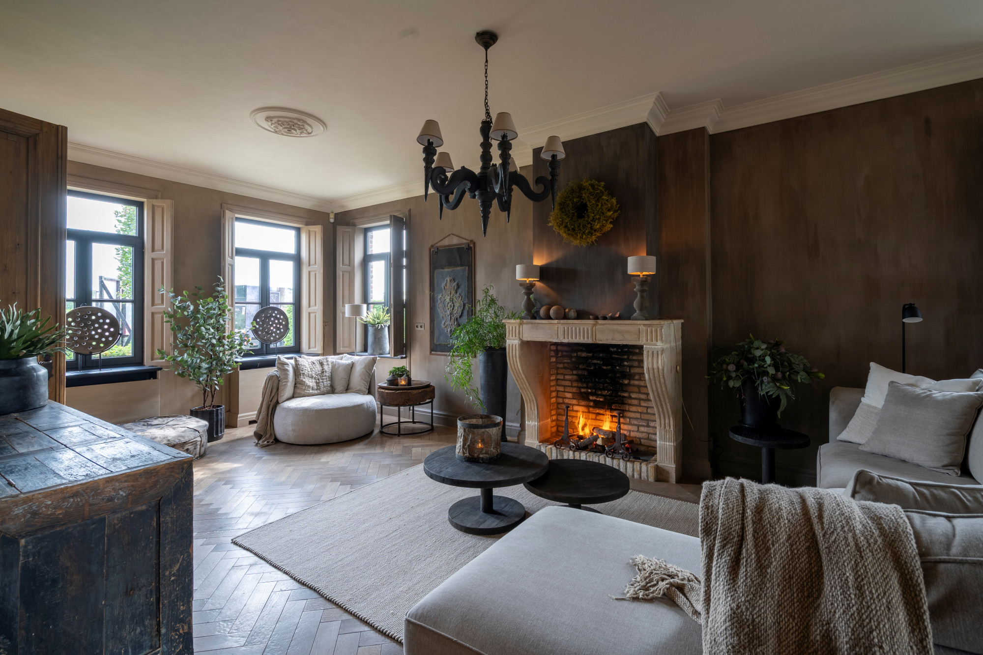 On the ground floor, you are welcomed by a spacious entrance hall with a cloakroom and guest toilet. This hallway provides access on one side to a generous office space, and on the other to the expansive living area with a gas fireplace. Adjacent is the fully equipped kitchen, handcrafted and custom-designed to blend seamlessly with the style of the home. Both the kitchen and living area open onto the garden room with bar, which also features a cozy gas fireplace.