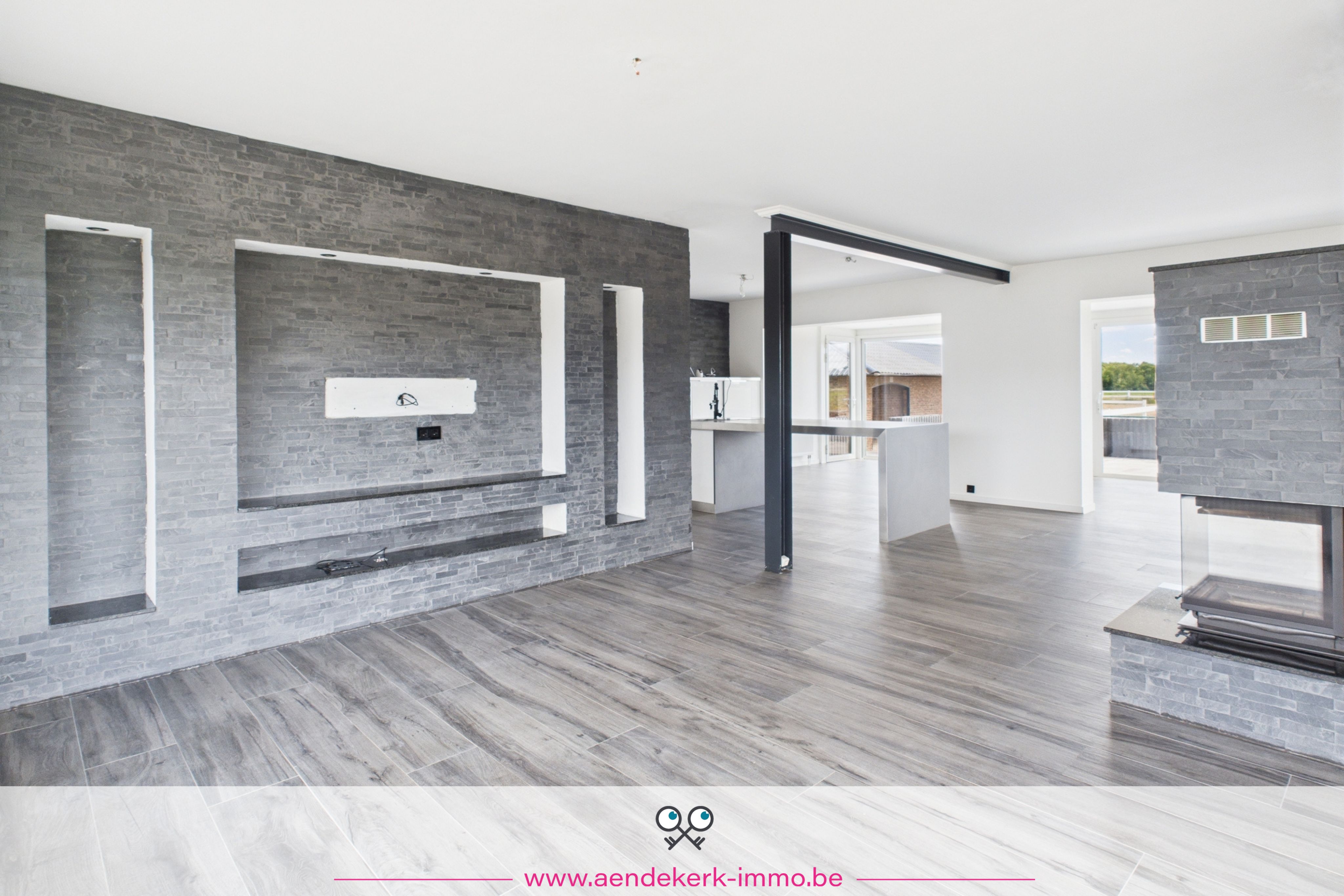 Bij binnenkomst valt meteen de speelse indeling op dankzij het splitlevelconcept. De leefruimtes zijn zeer lichtrijk, met een gezellige tuinkamer met een indrukwekkende raampartij van 8 meter breed, die uitkijkt op de achterliggende velden.