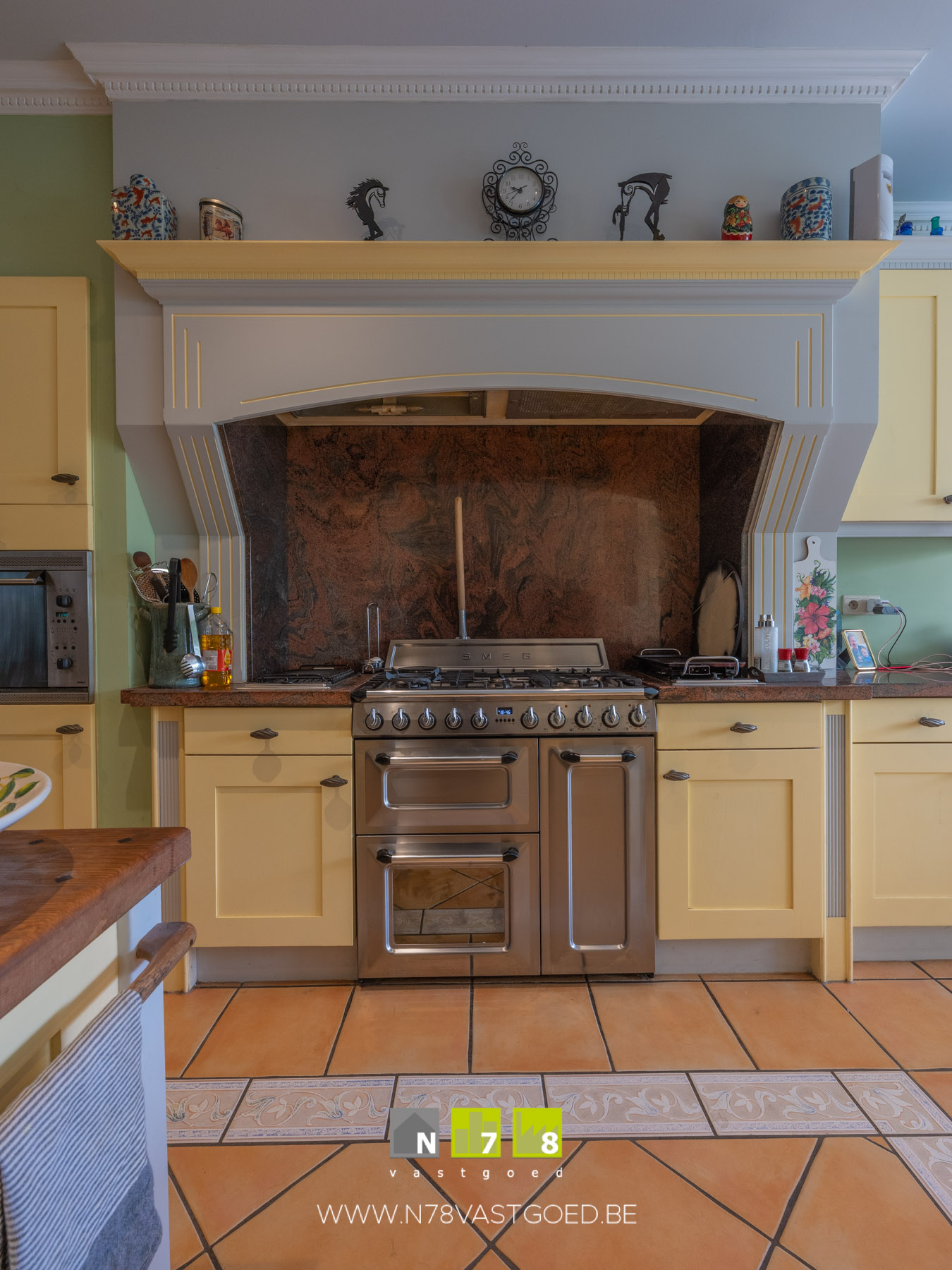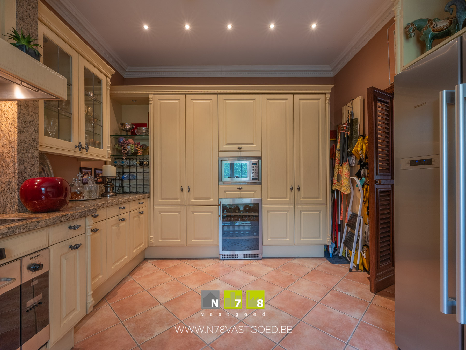 - Keuken: volledig ingerichte aanbouwkeuken in landelijke stijl, oven (Miele), elektrische kookplaat, dampkap, wijnkoelkast, micro (Siemens), vaatwasser, koelkast niet inbegrepen, tegelvloer.