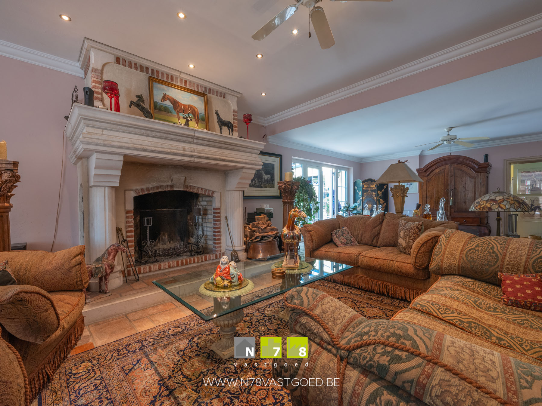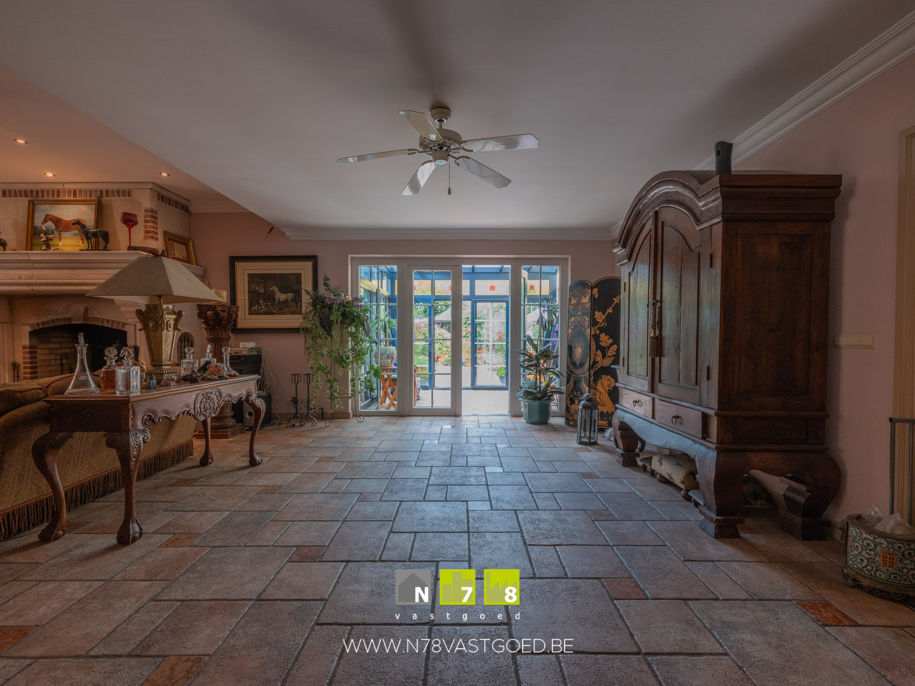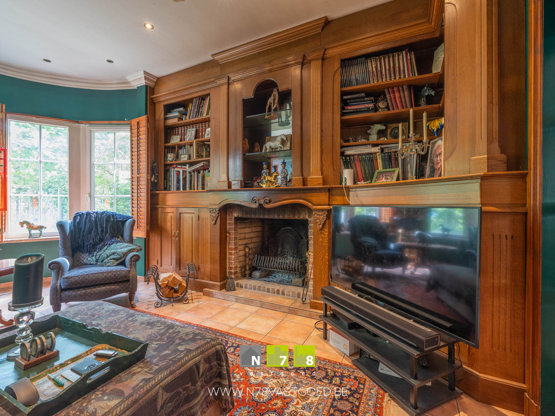- Woonkamer: imposante houthaard, deur naar veranda, tegelvloer.