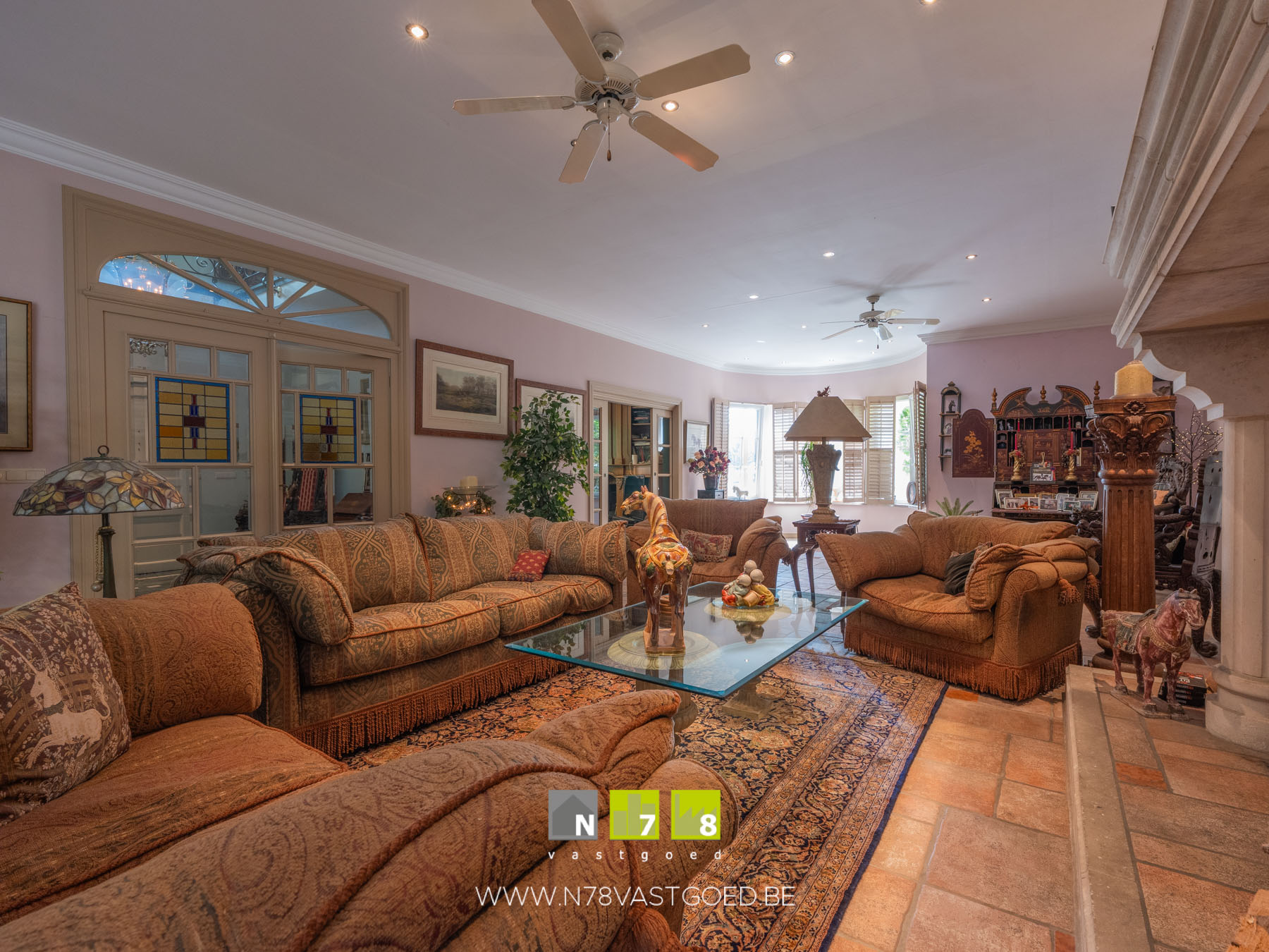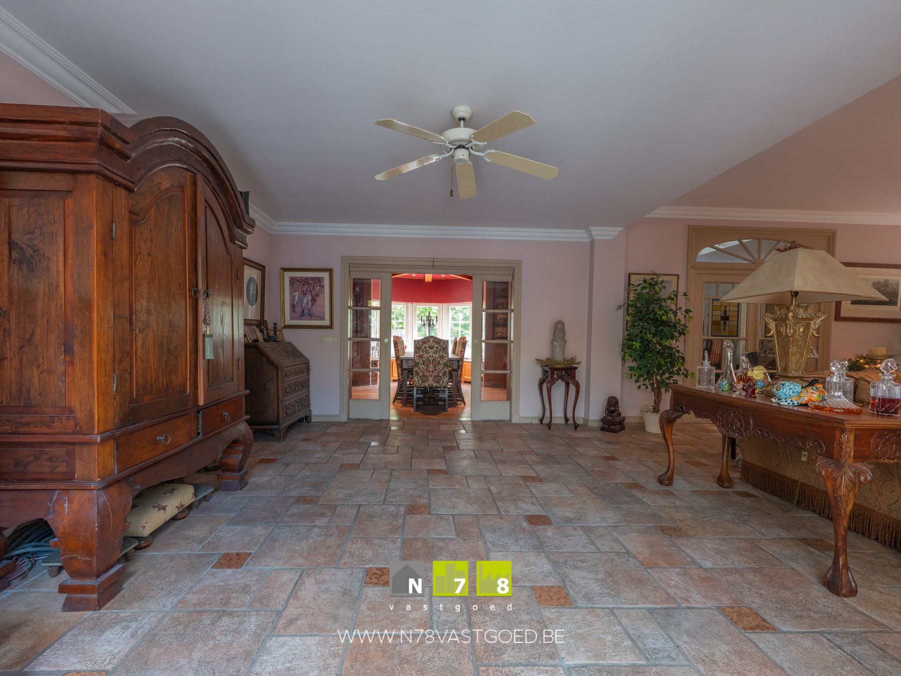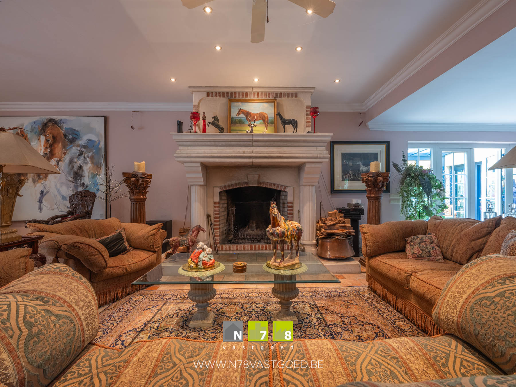 - Woonkamer: imposante houthaard, deur naar veranda, tegelvloer.