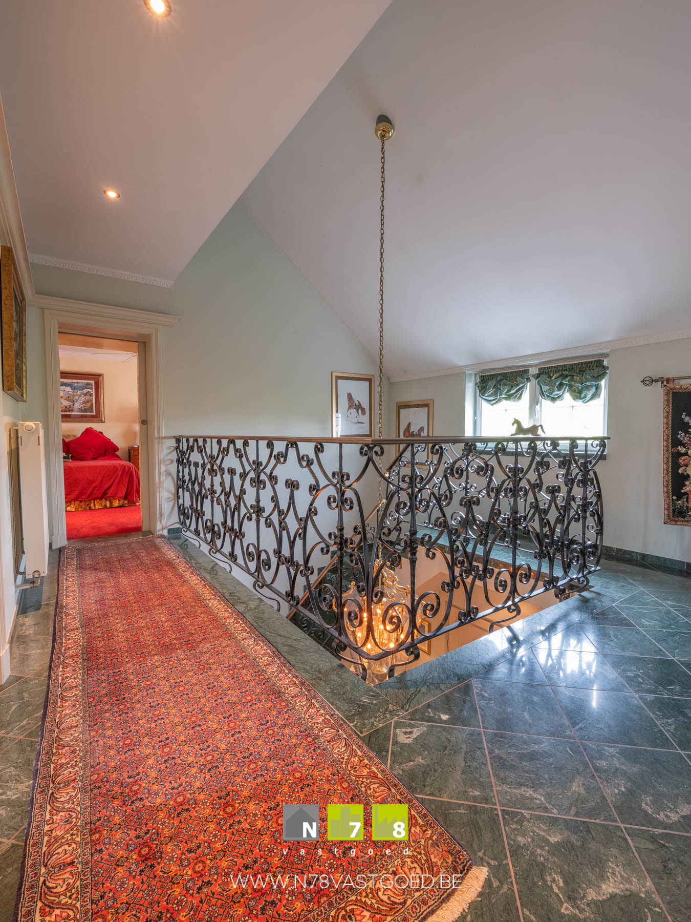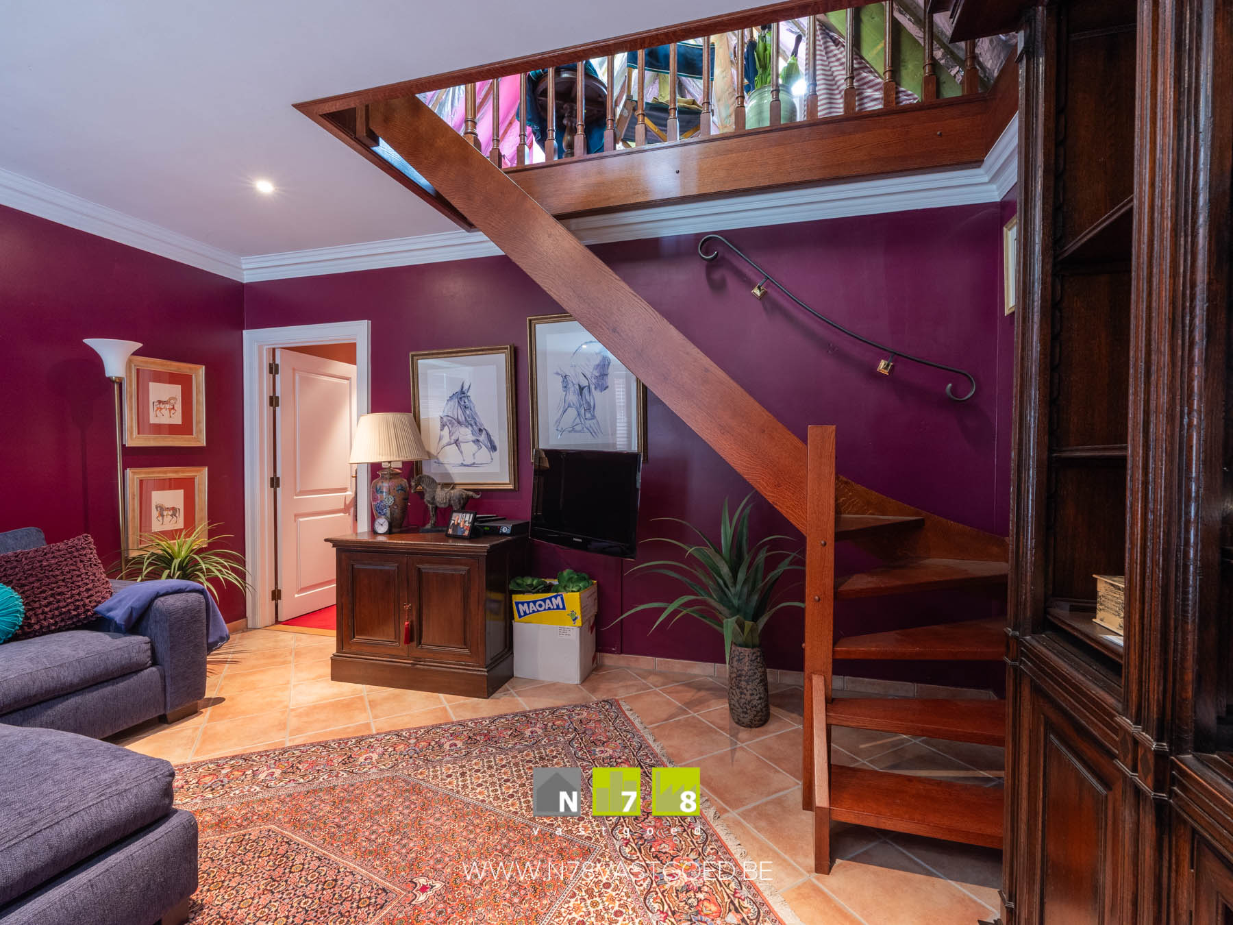 - Overloop: eiken trap naar het gelijkvloers, vloerkleed.