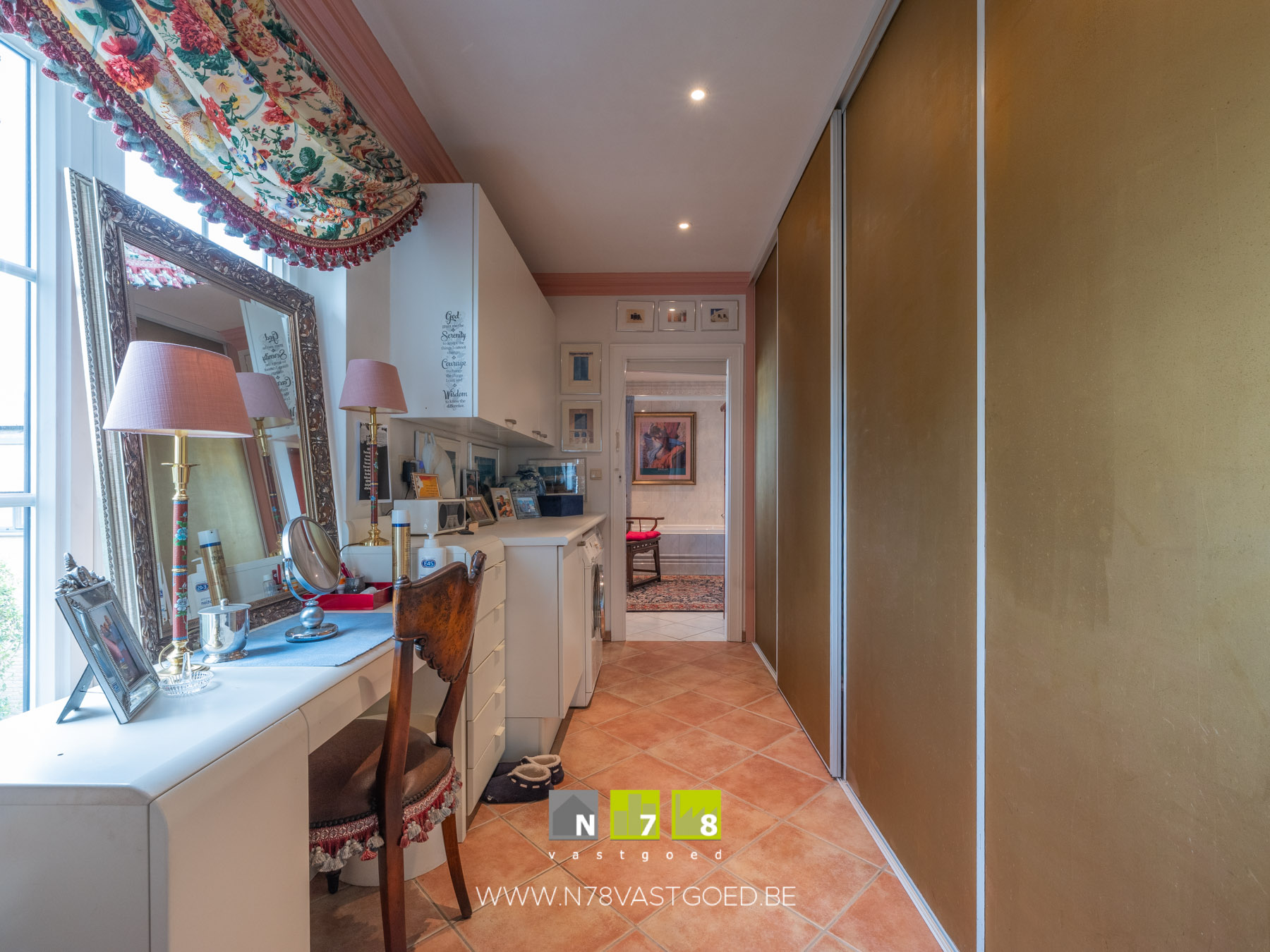 - Dressing: aansluiting wasmachine/droogkast, kitchenette, inbouwkasten, doorgang naar de badkamer, tegelvloer.