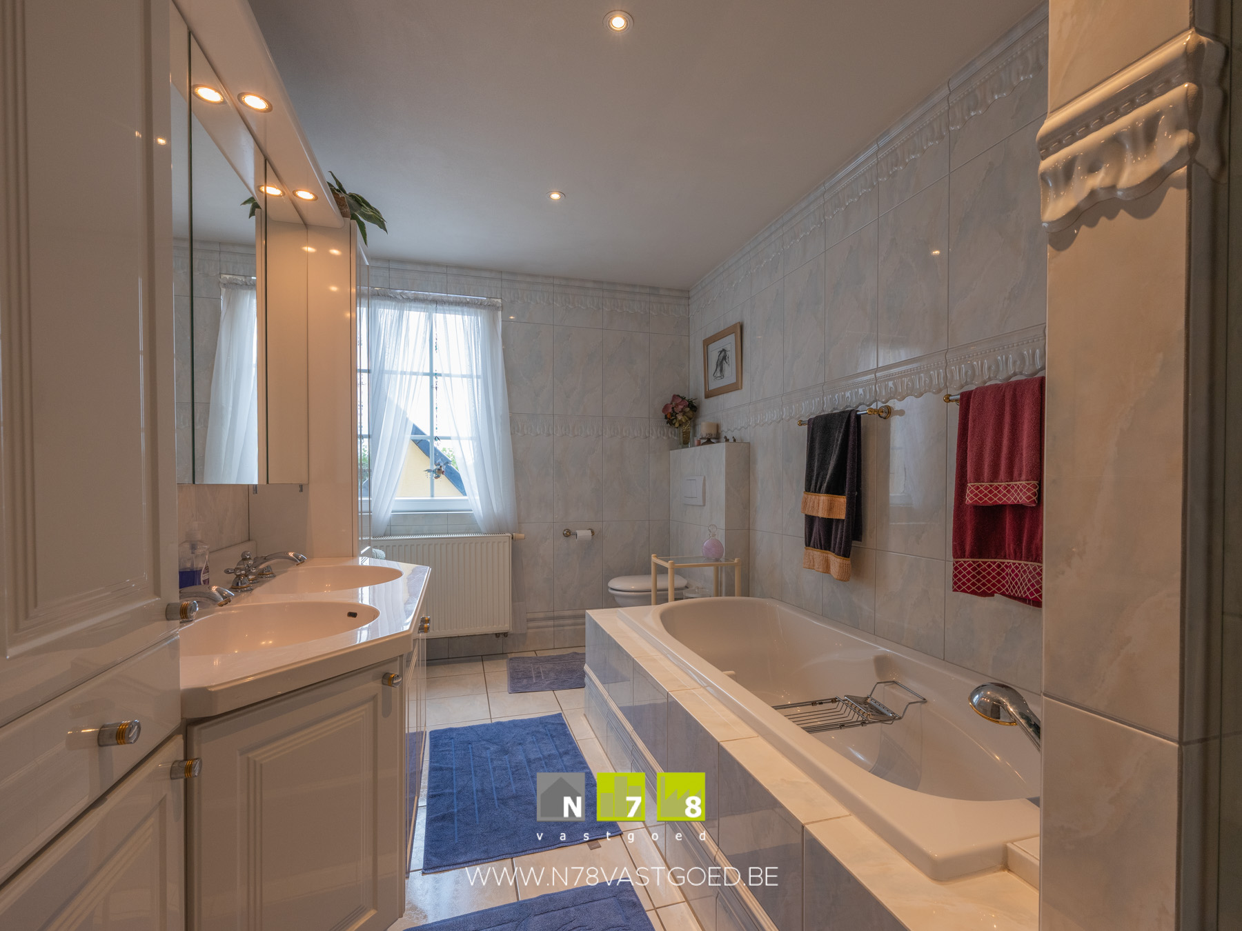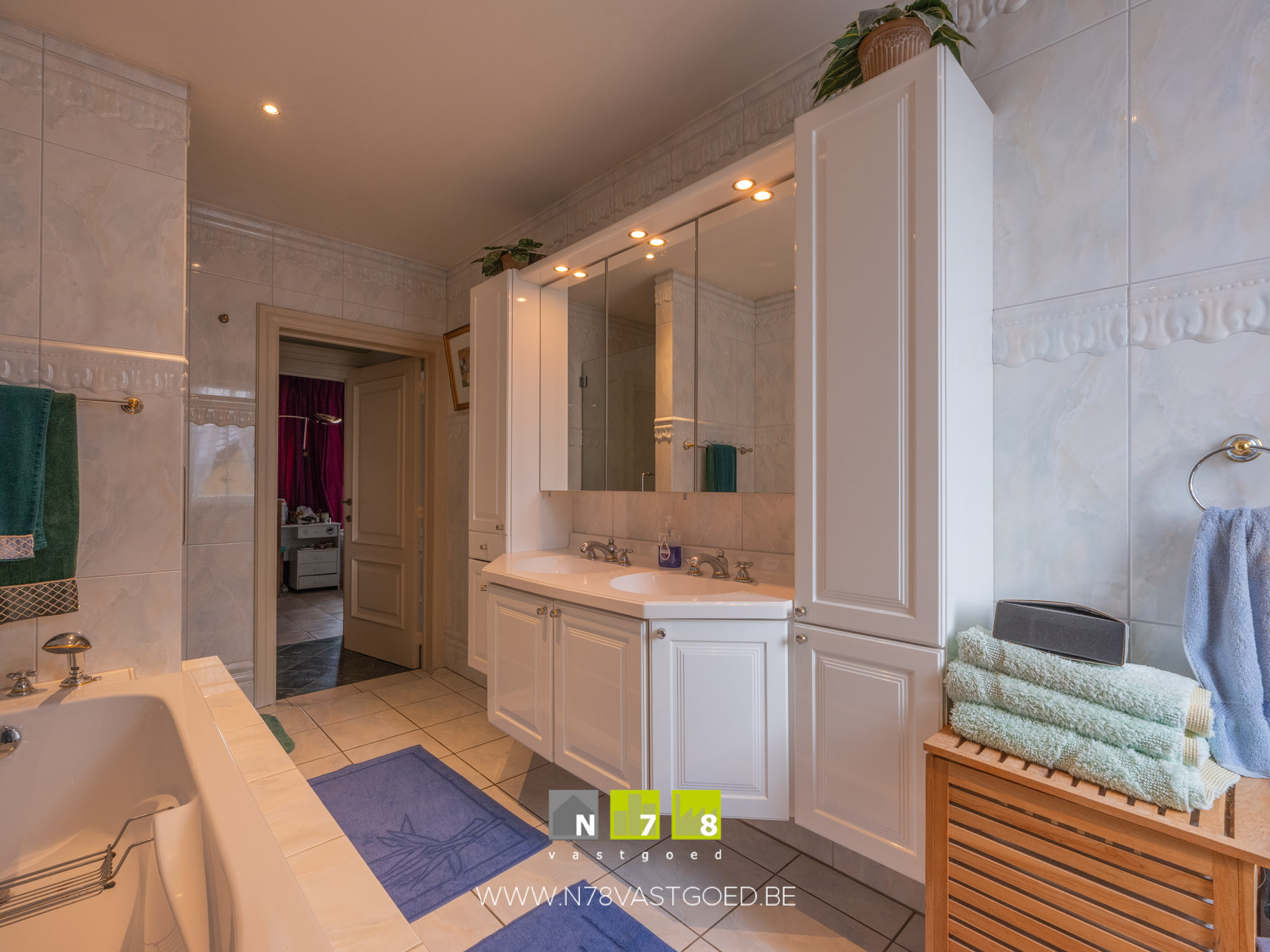 - Badkamer 1: ingericht badmeubel met dubbele lavabo, kolomkasten,spiegelkasten; ligbad, hangtoilet, inloopdouche, wandbetegeling, tegelvloer.