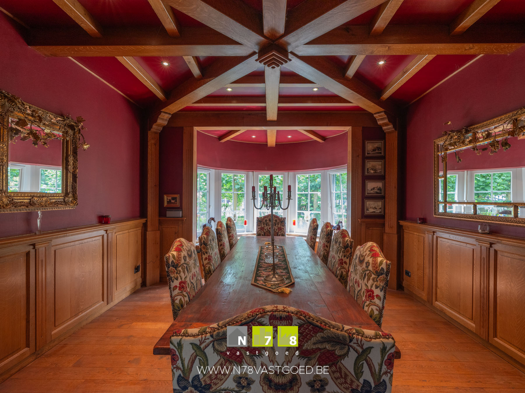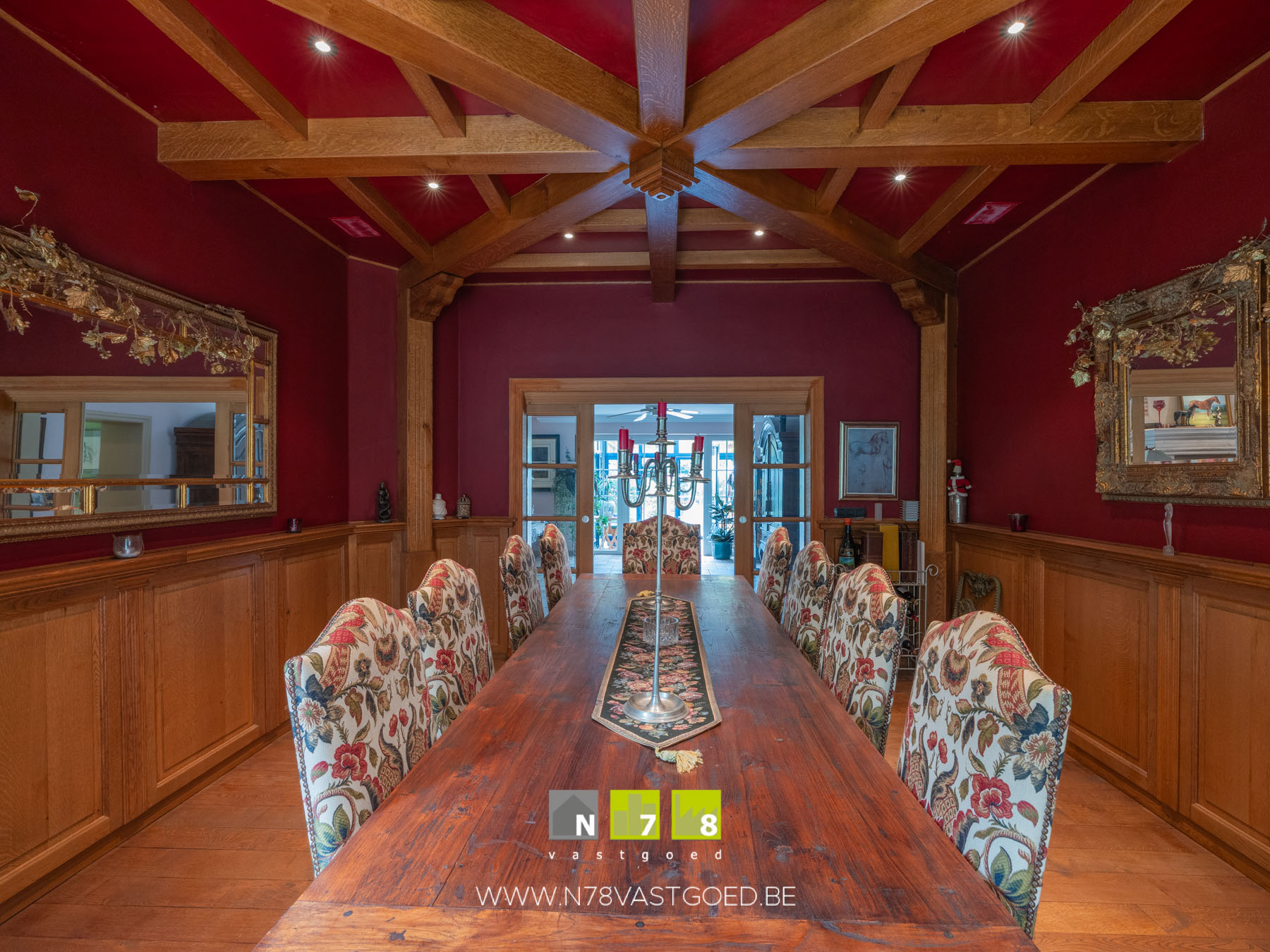 - Aparte eetkamer: afgewerkt met houten plafond, houten vloer.