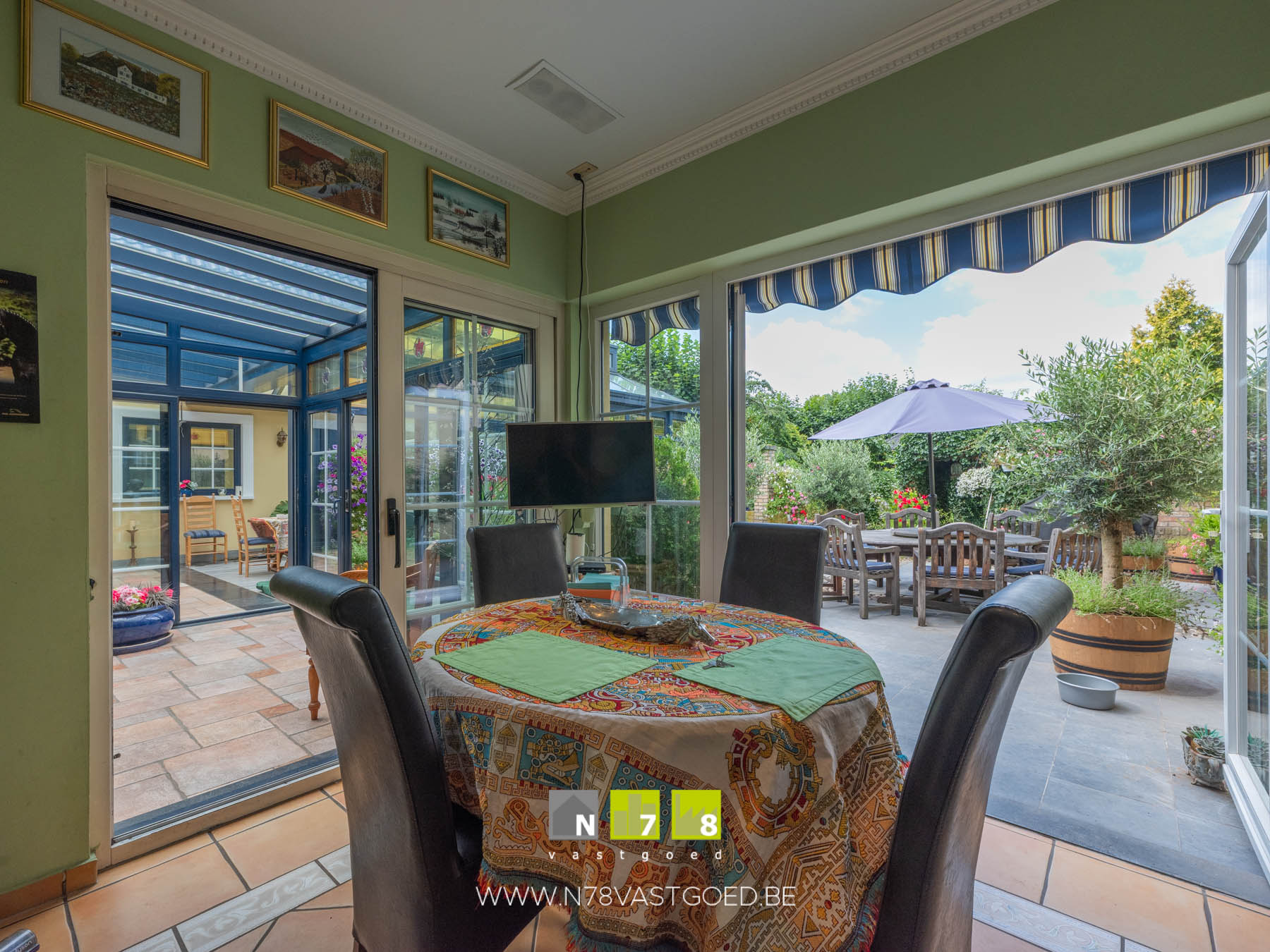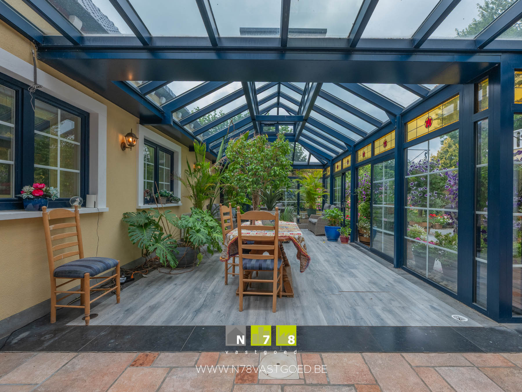 - Ruime veranda: veel lichtinval, barbecue, tegelvloer.
