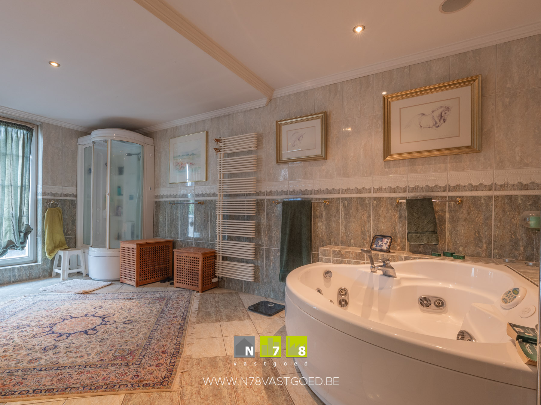 - Badkamer 2: landelijk ingericht badmeubel met dubbele lavabo, inbouwkasten; douche, hoek bubbelbad, wandbetegeling,tegelvloer.
