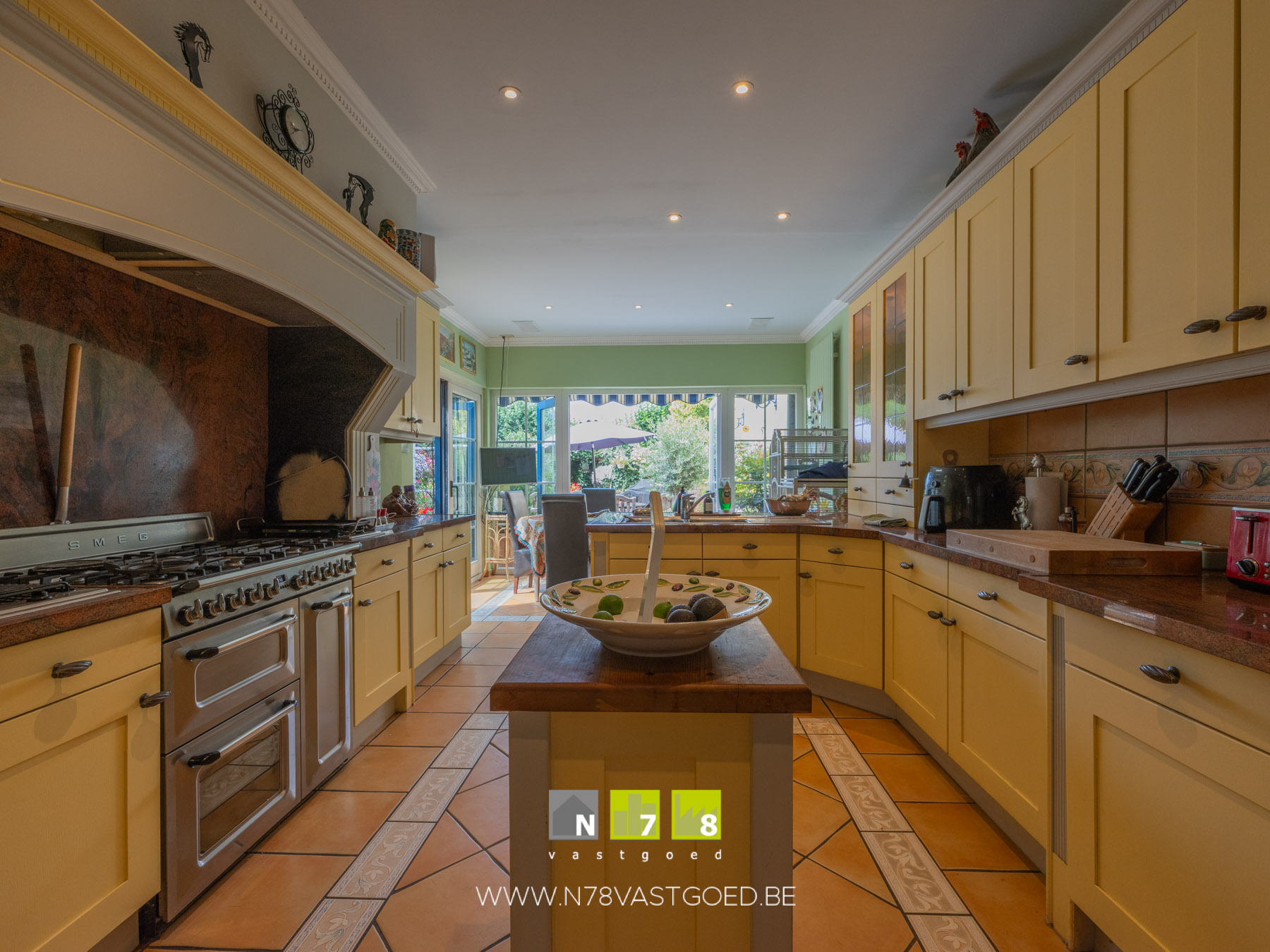 - Keuken: ruimte aanbouwkeuken inclusief gasfornuis (6 pits), grote oven, dampkap, grill, steengrill, speakers, schuifraam naar de veranda, deur naar het terras, tegelvloer.