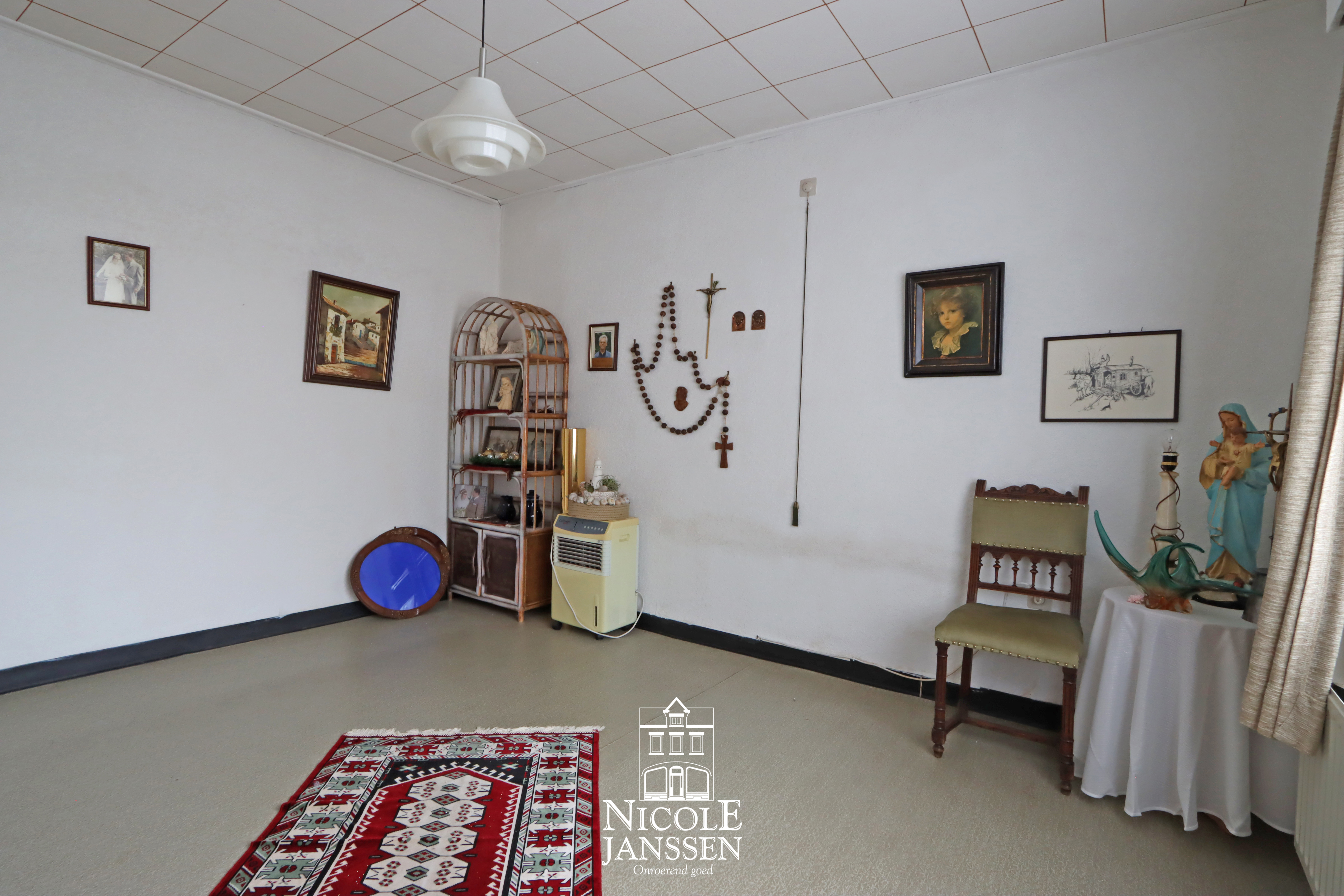 - Gelijkvloers: inkomhal, woonkamer, keuken met aparte eetplaats, veranda, achterinkom, badkamer, apart toilet