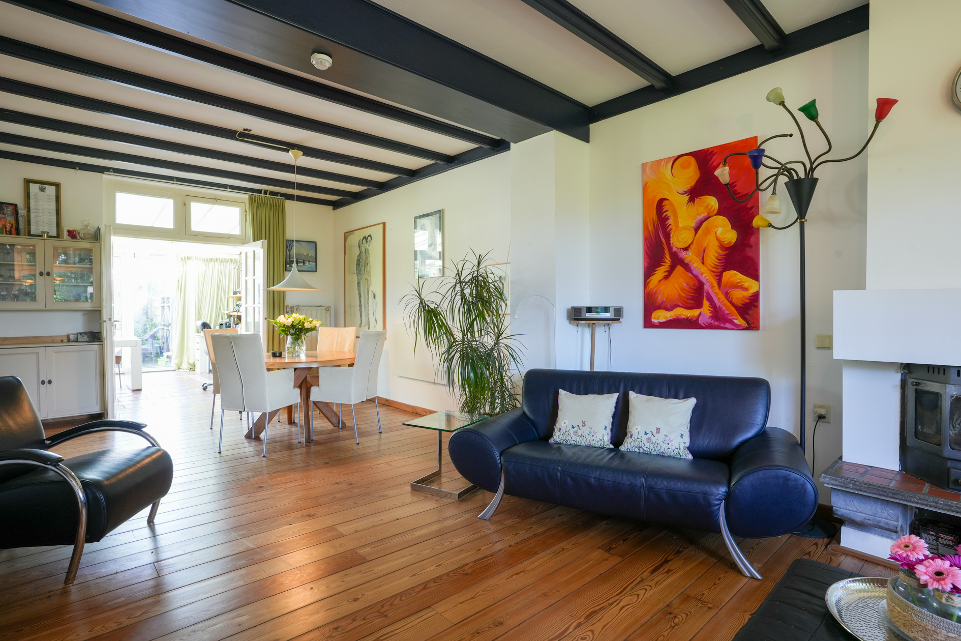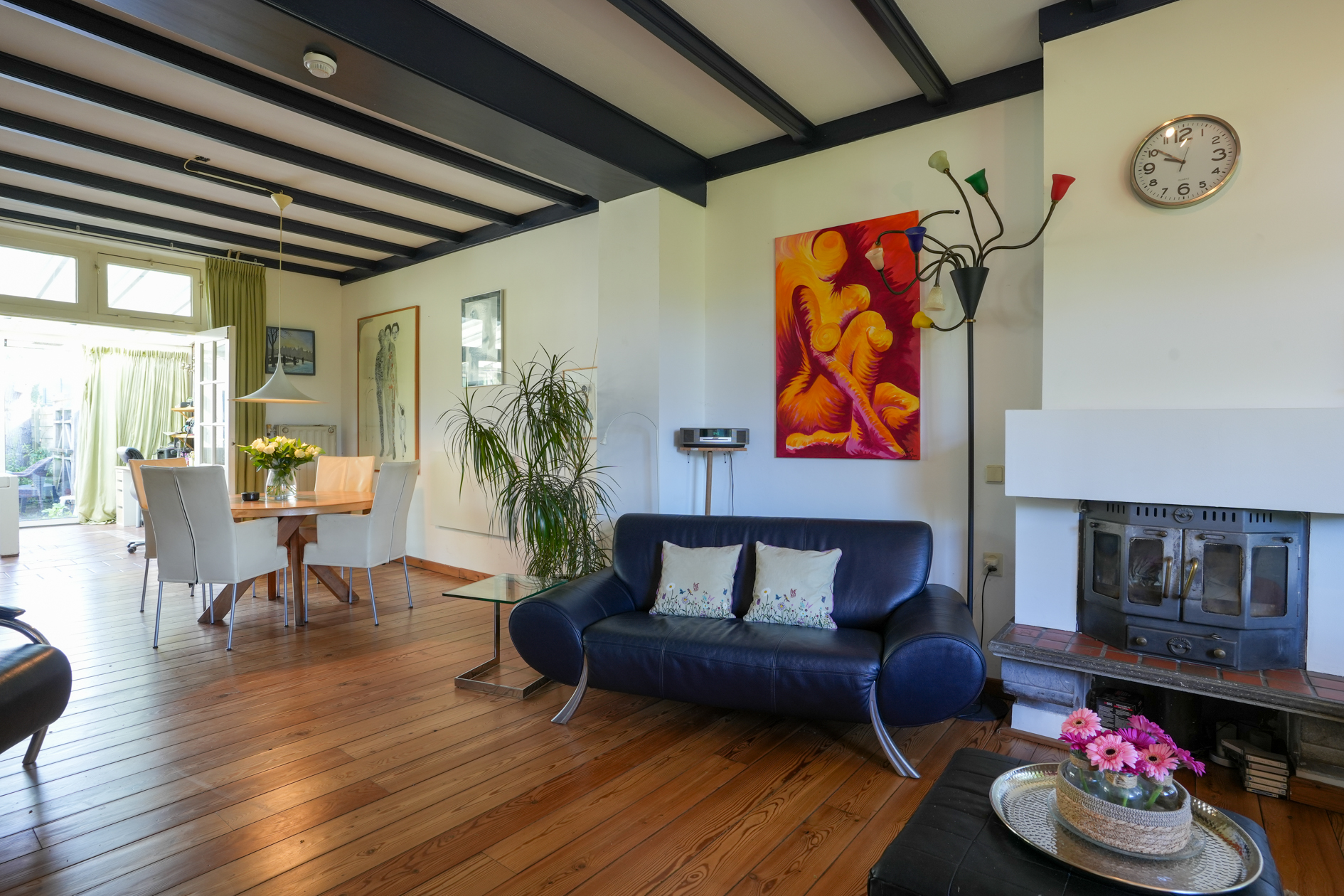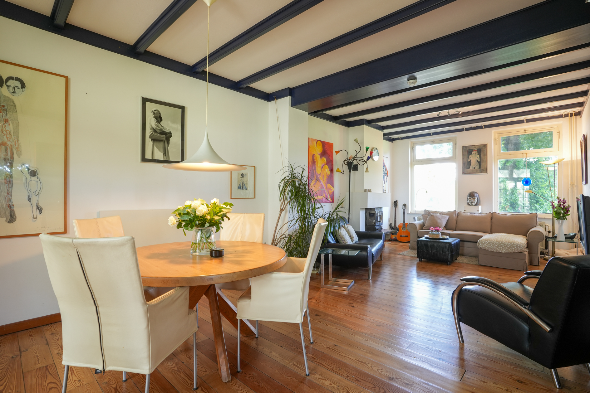 De woonkamer is voorzien van een parketvloer en een houtkachel (dient gerenoveerd te worden), aangrenzend eetkamer/open keuken met inbouwapparatuur.