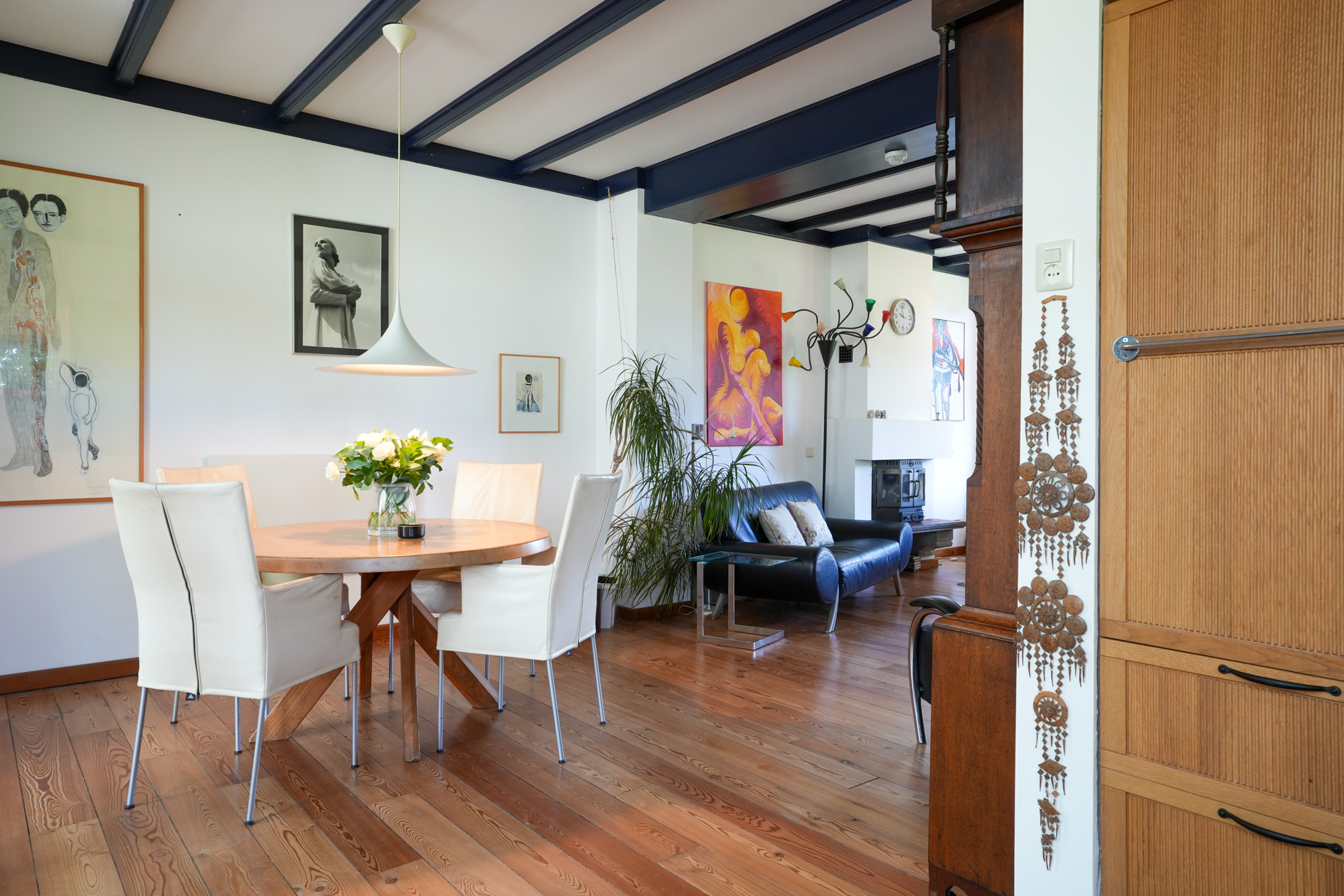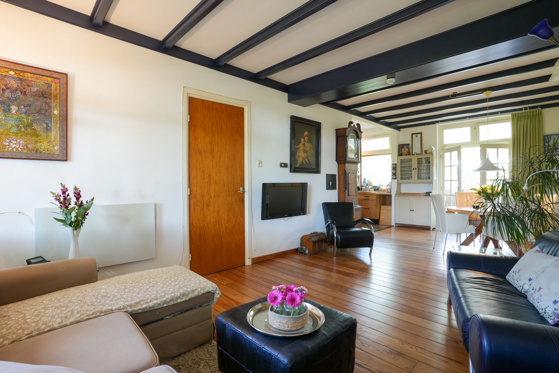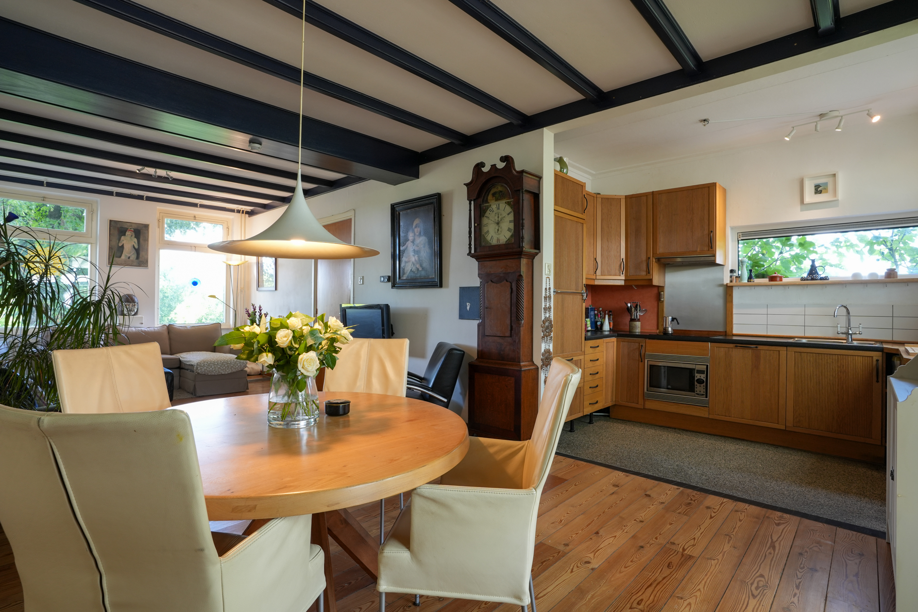 De woonkamer is voorzien van een parketvloer en een houtkachel (dient gerenoveerd te worden), aangrenzend eetkamer/open keuken met inbouwapparatuur.