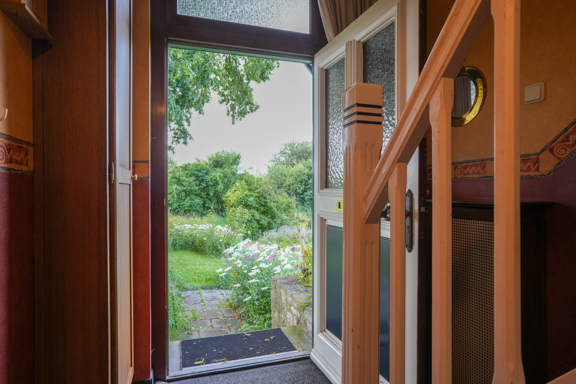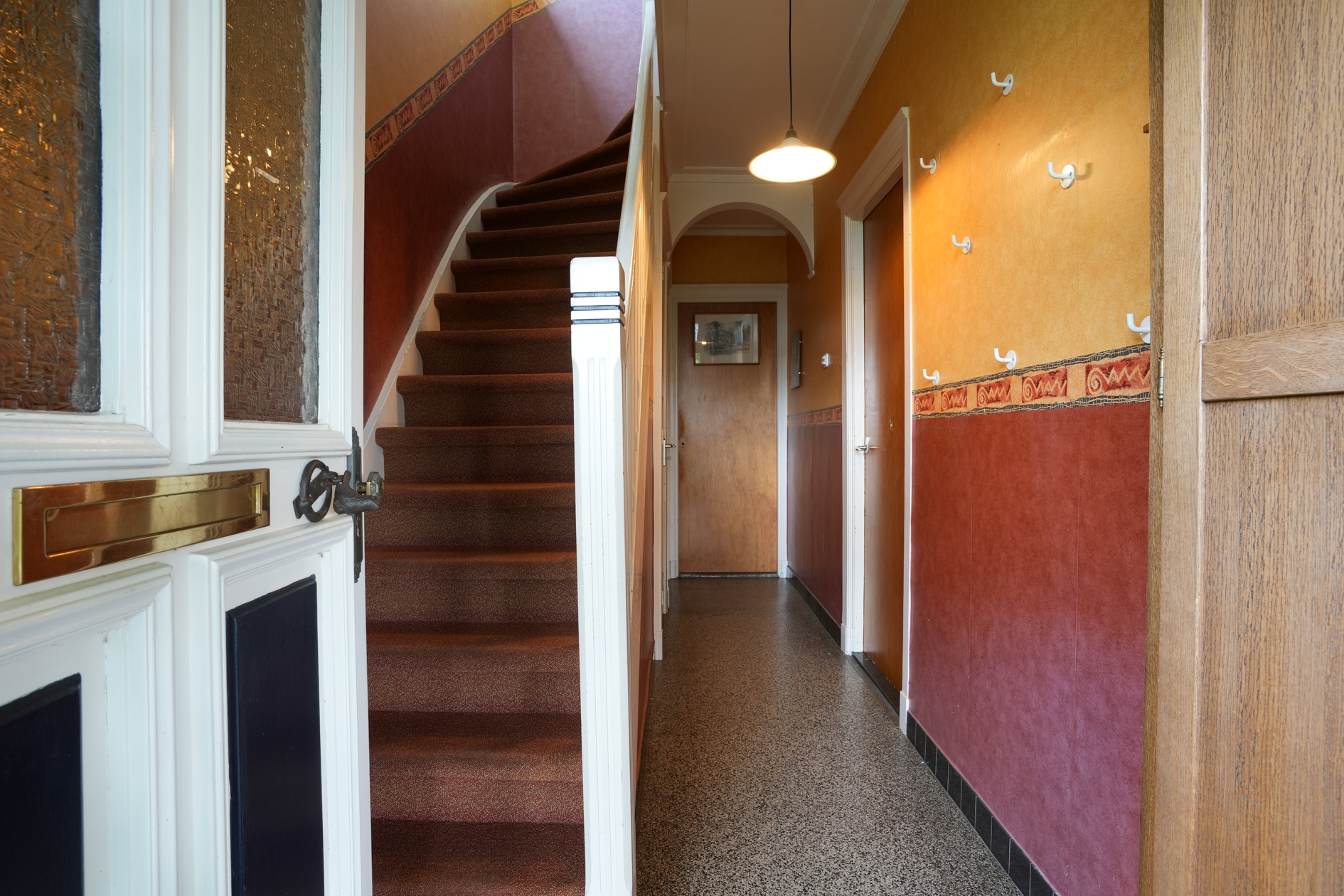 Entreehal met authentieke terrazzovloer, deze vloer is ook aanwezig in de keuken.