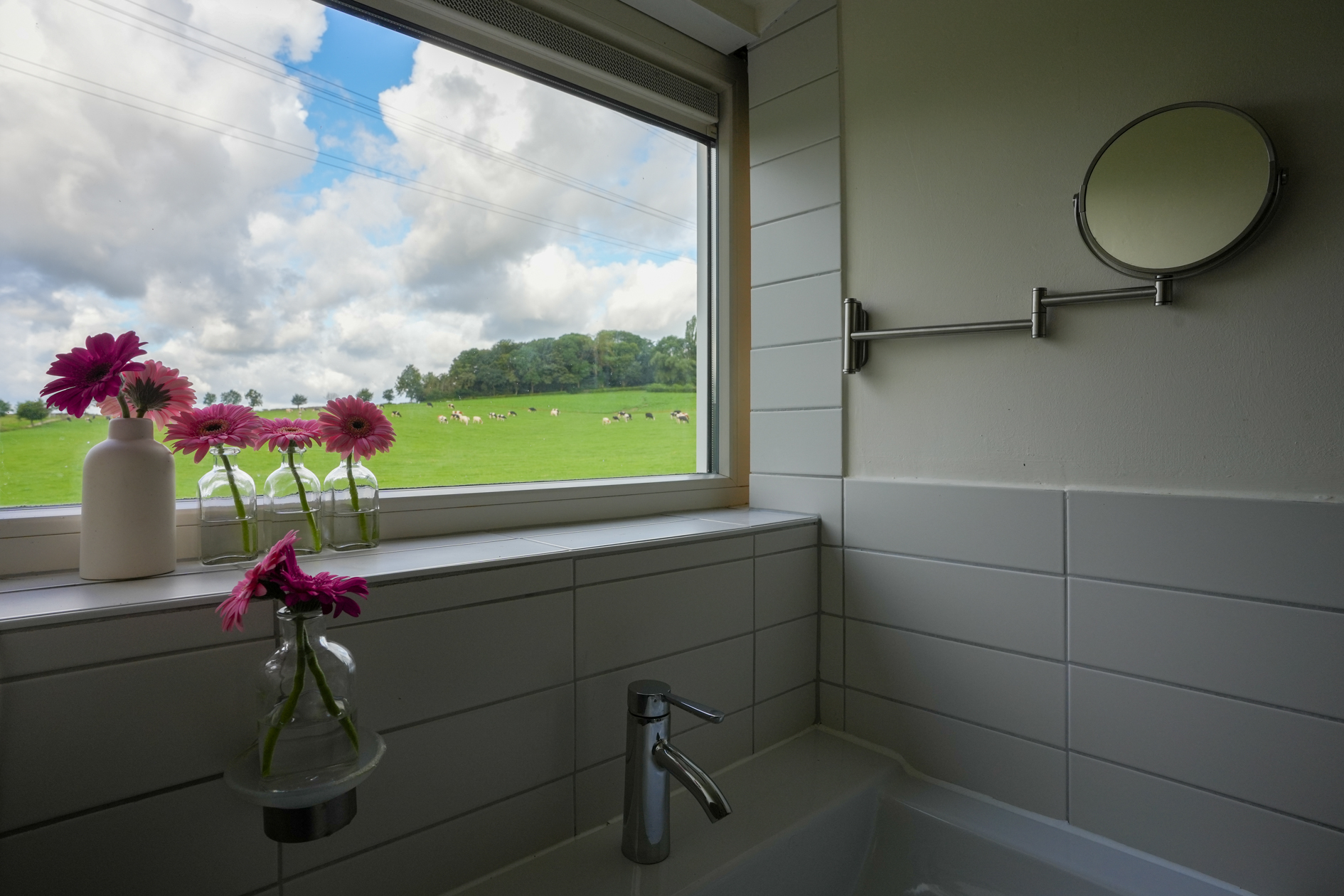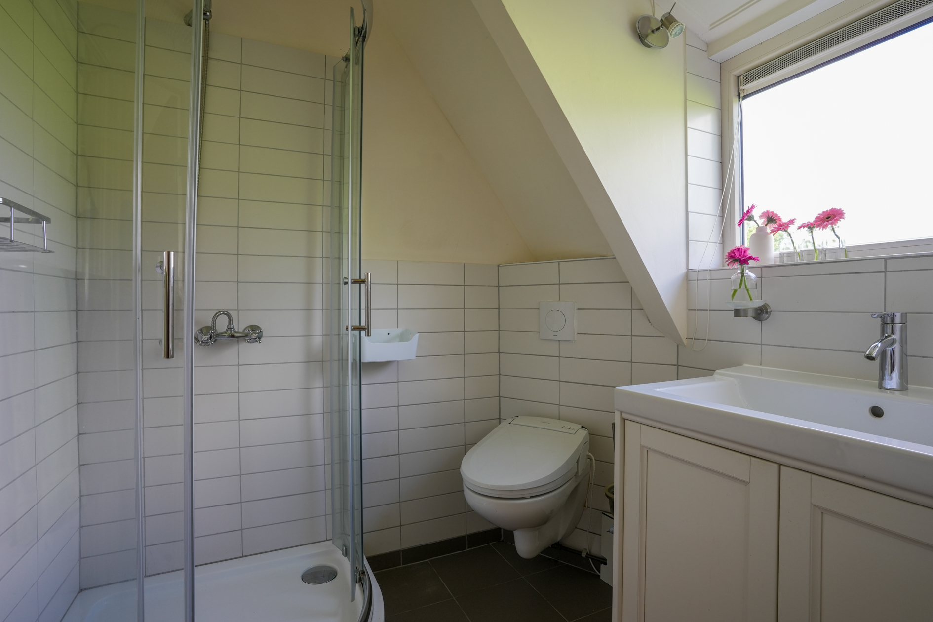 Middels een elektrisch doorstroomapparaat (Thermoflow, 2014) is er 24/7 warm water in de douche.