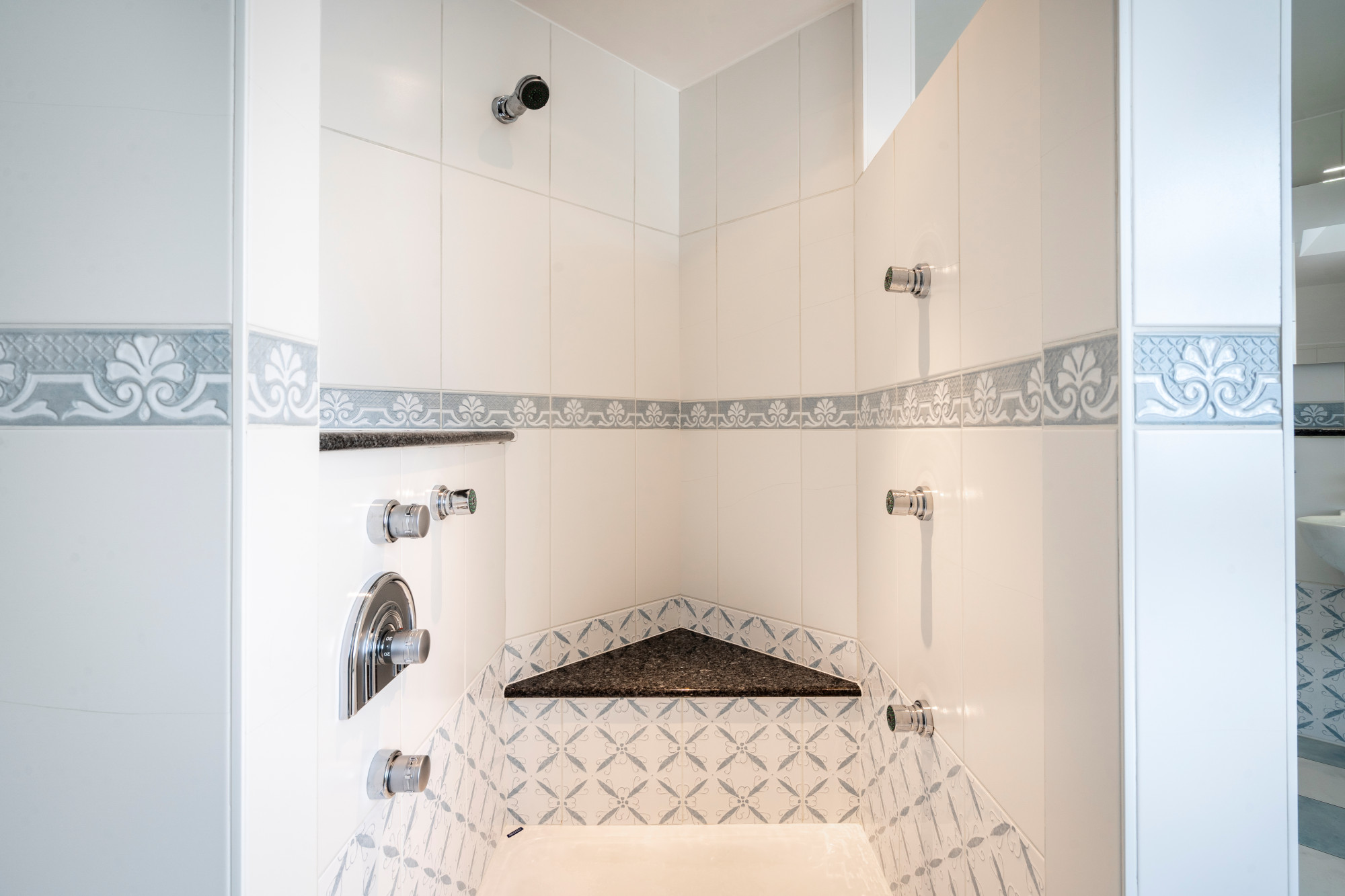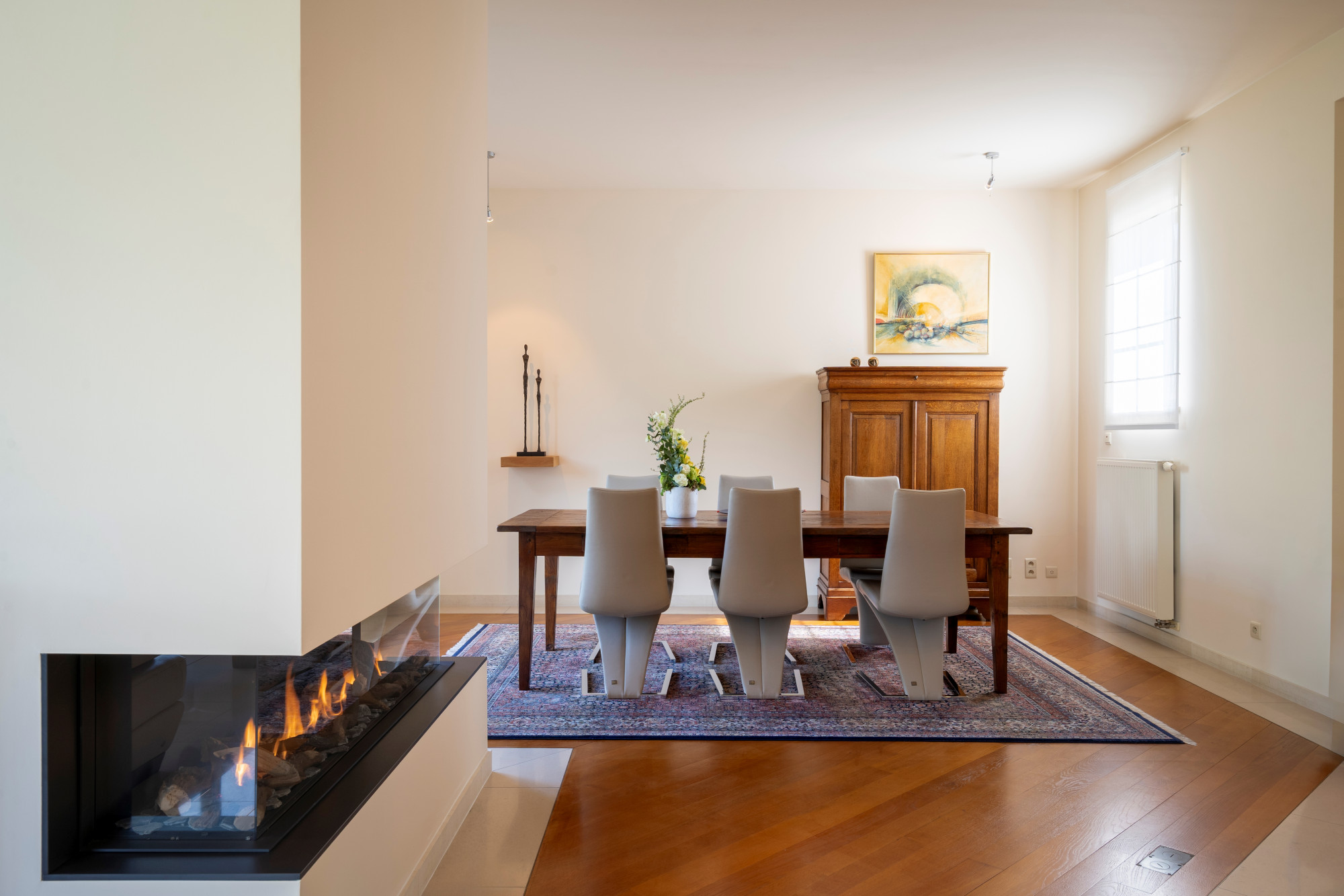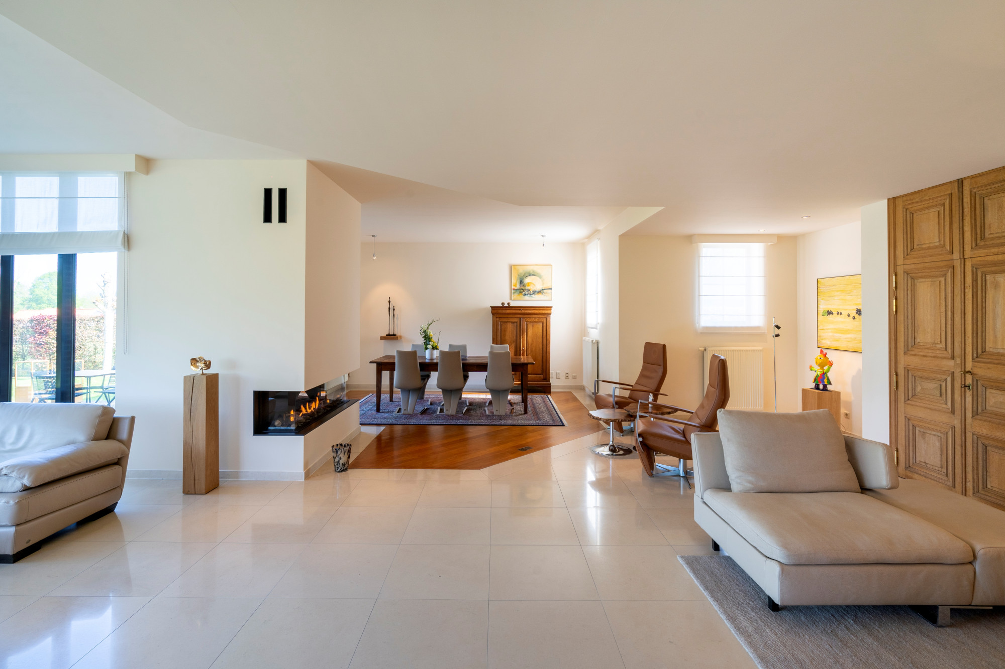 On the ground floor there is a spacious entrance hall, guest toilet, checkroom and laundry room. The open living space with dining and sitting area is equipped with a cozy gas fireplace and underfloor heating. Large windows, with screens, provide an abundance of natural light and create a direct connection to the beautifully landscaped garden. Inside and outside flow seamlessly together here. Adjacent is the spacious custom kitchen with cozy breakfast nook. There is also an indoor garage with space for three cars.