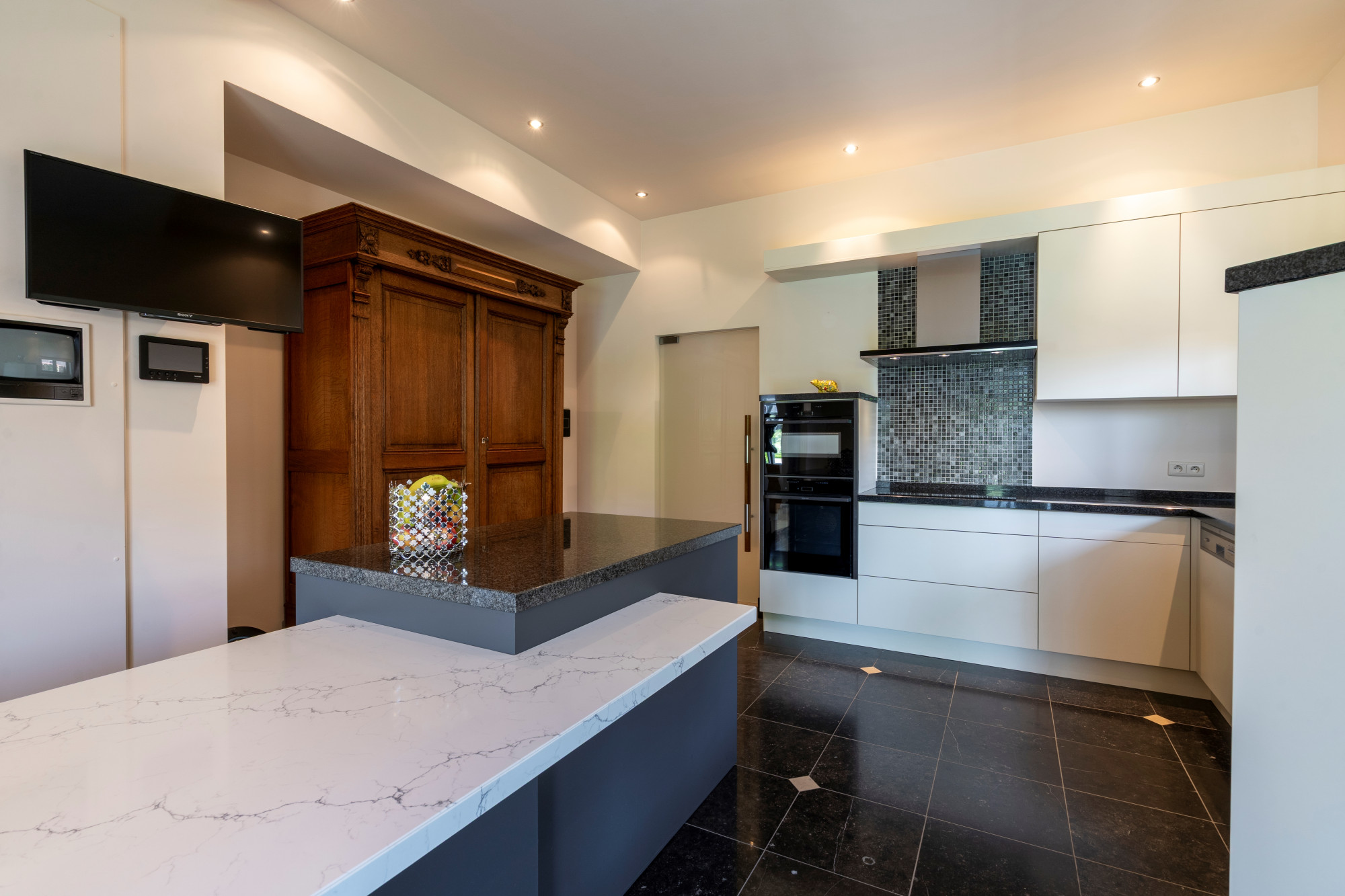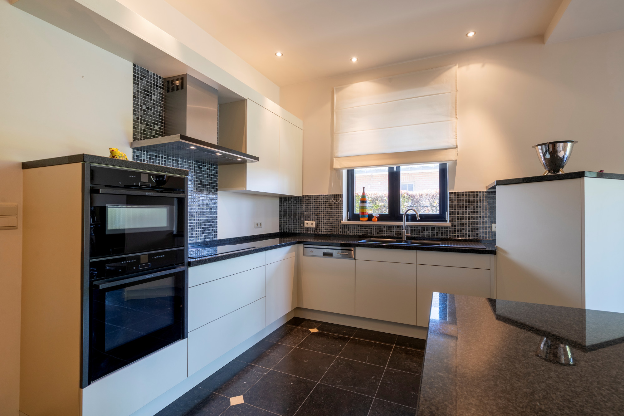 The kitchen is equipped with an induction hob, extractor fan, fridge, oven, combination oven, dishwasher and double bowl sink.