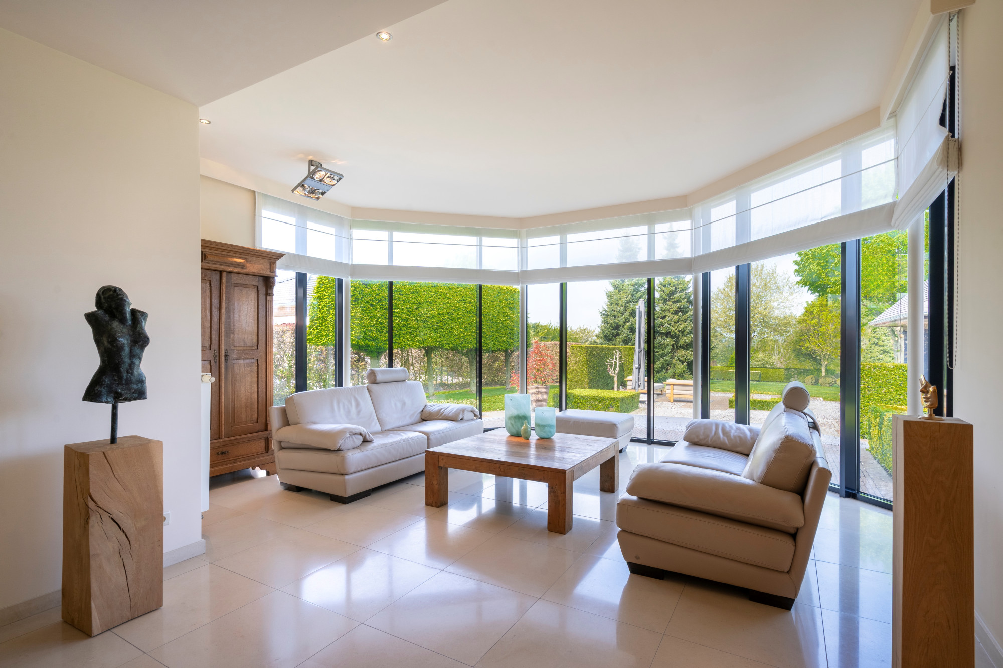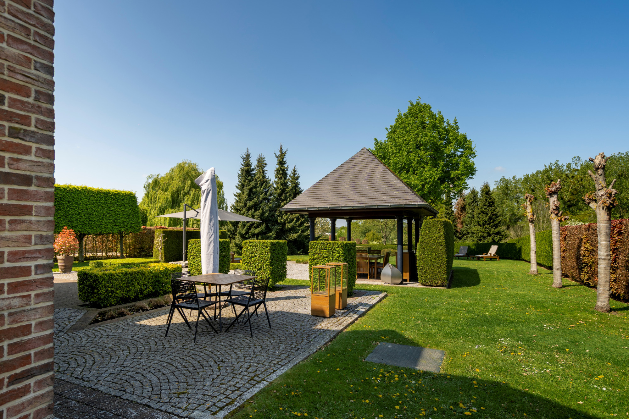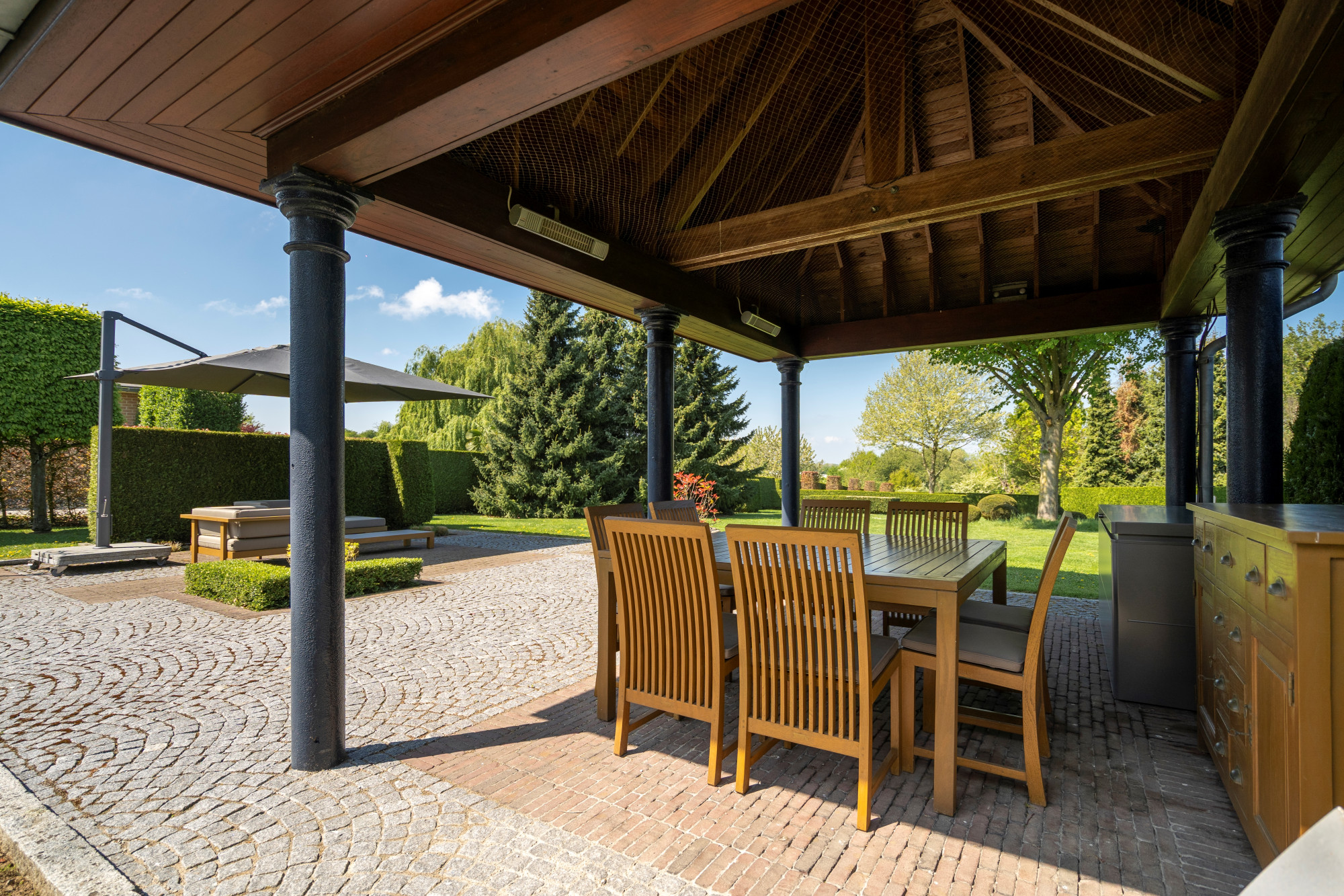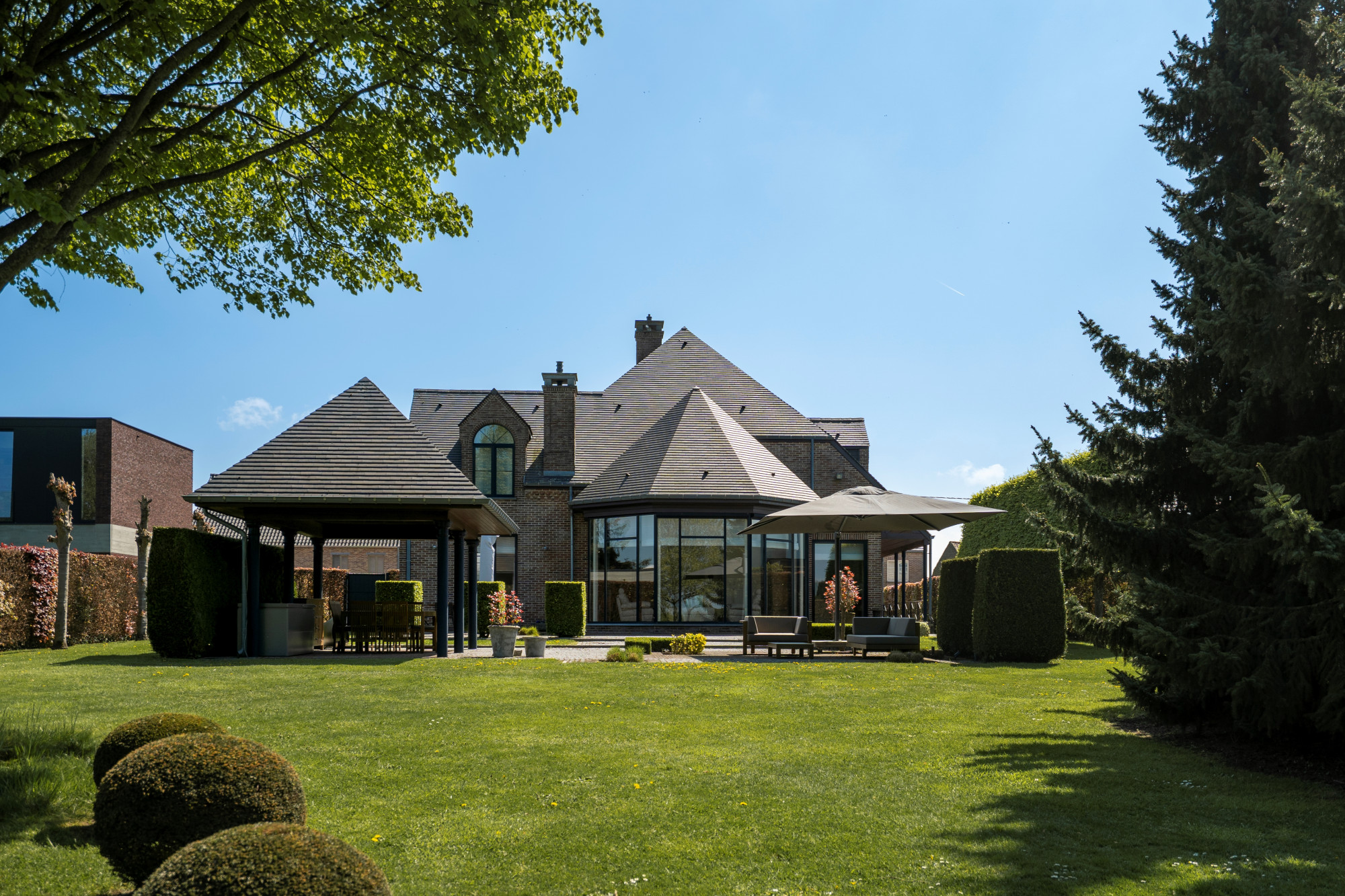 The garden is fully fenced and equipped with an automatic gate. It is beautifully landscaped with a paved terrace and a covered terrace with 2 heaters. There is also a grass robot.