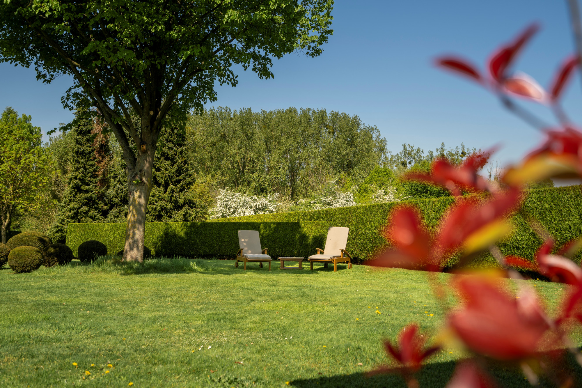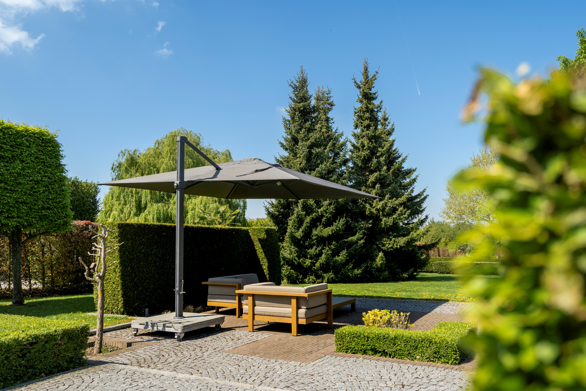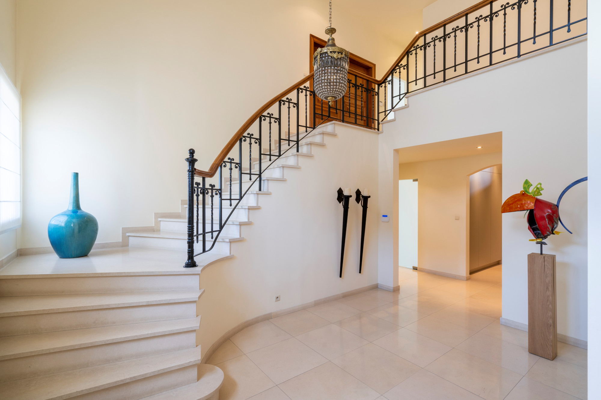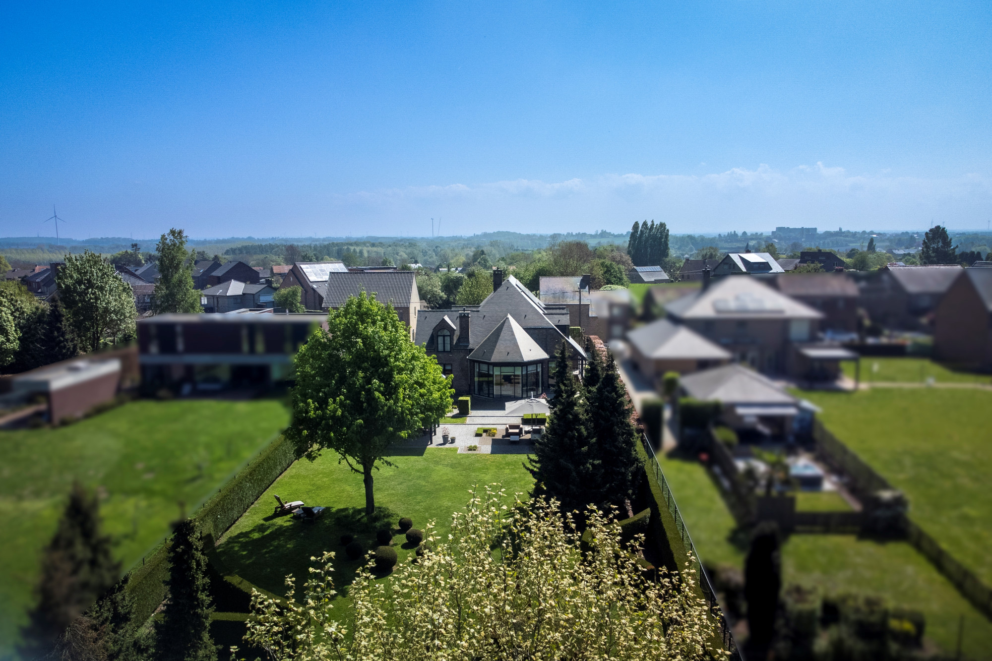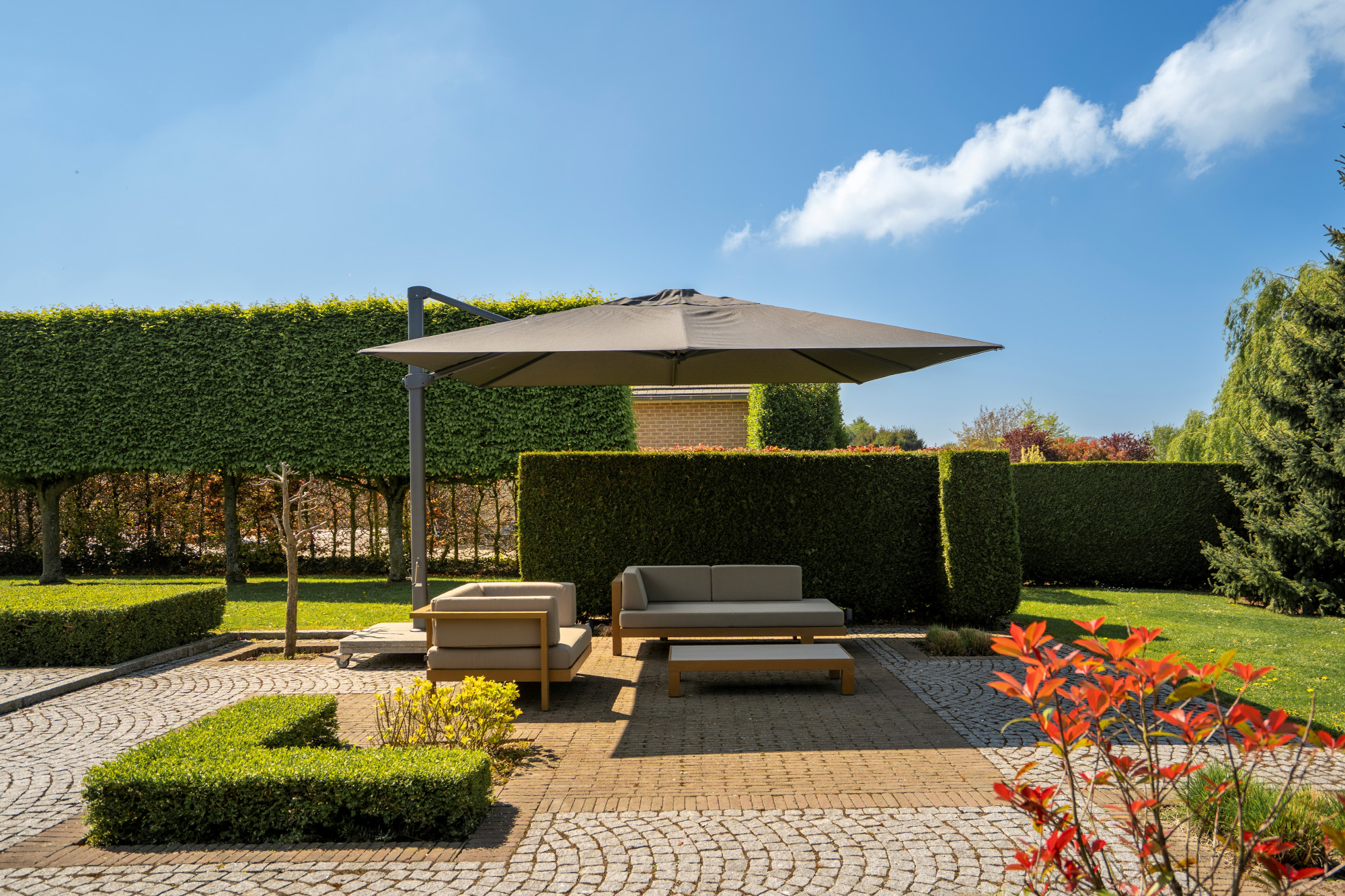 The garden is fully fenced and equipped with an automatic gate. It is beautifully landscaped with a paved terrace and a covered terrace with 2 heaters. There is also a grass robot.