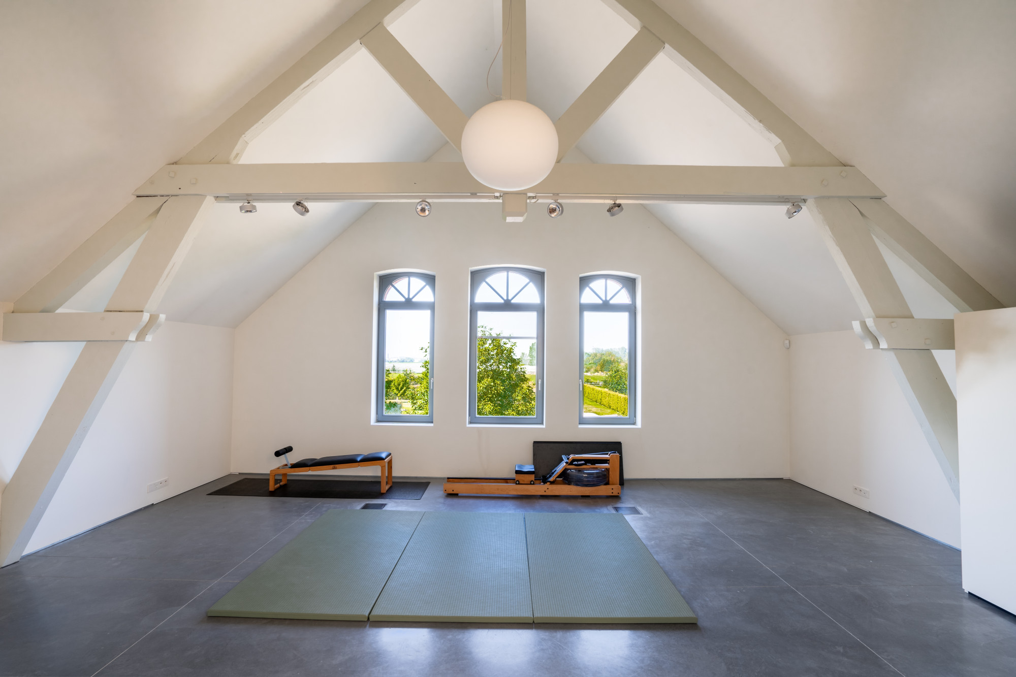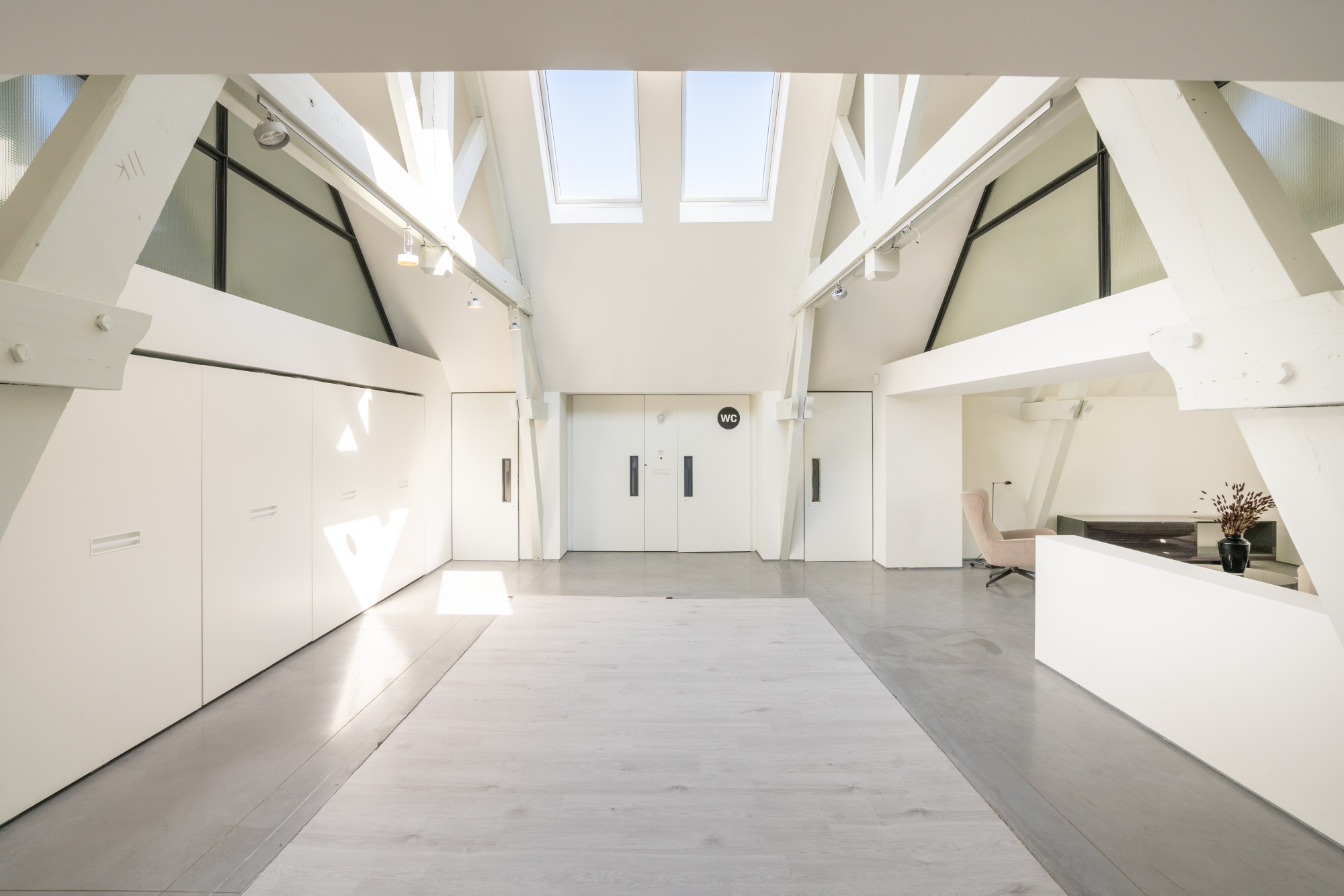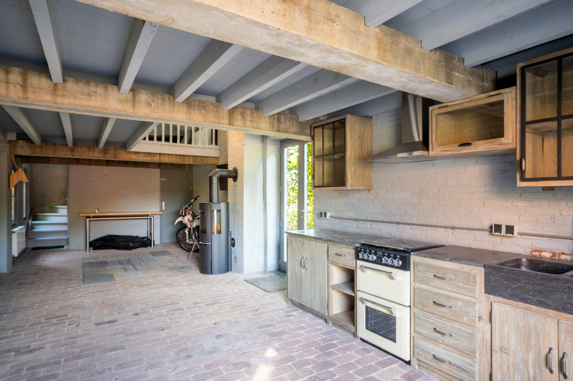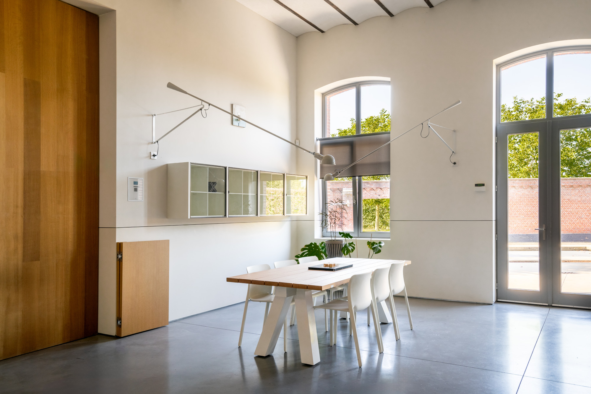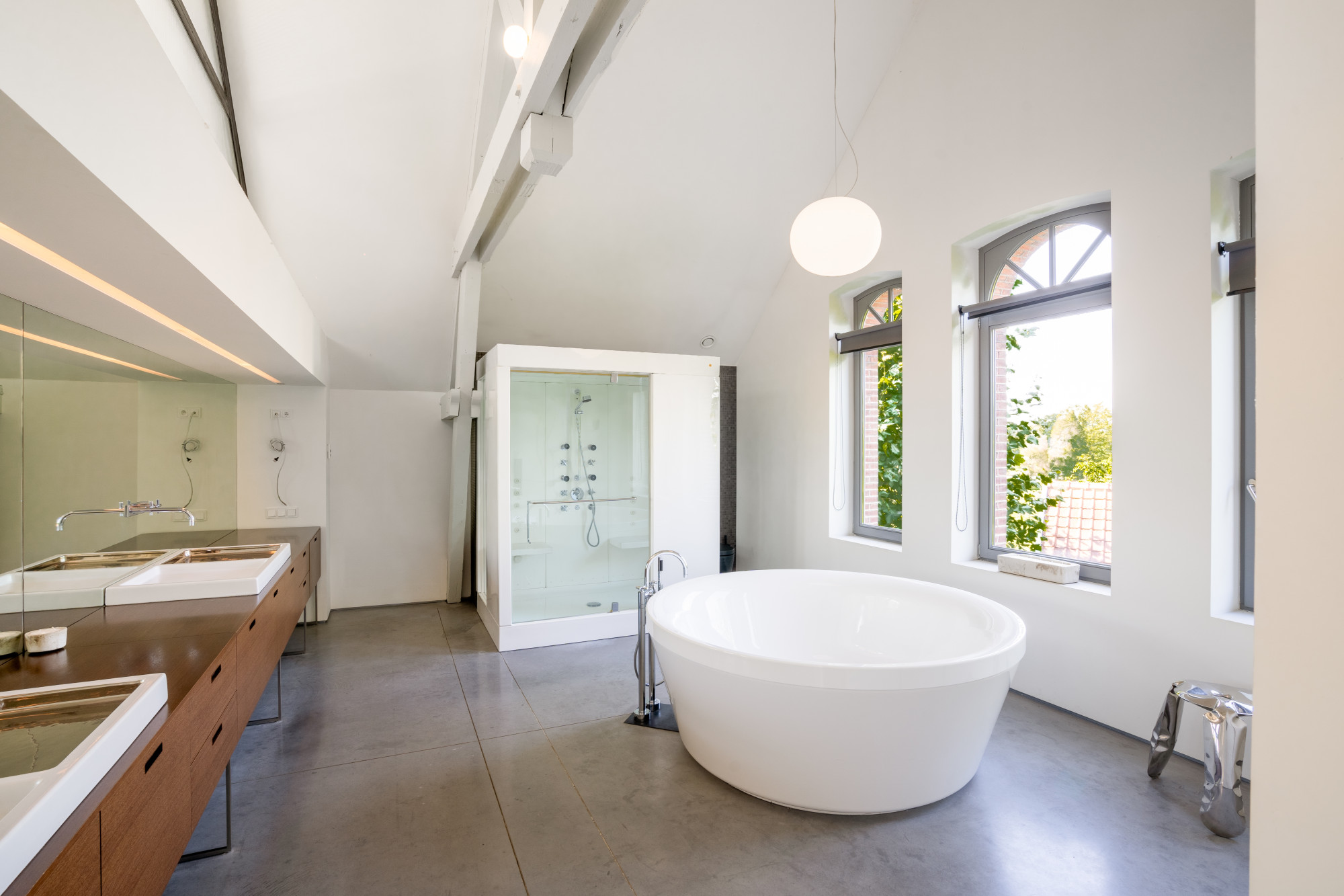 De leef/werkkamer is een rechthoekige ruimte van 15 x 17.4m met centraal een kern van glas in staal en een design houthaard. Volledig rondom zijn er hoge ramen waardoor de lichtinval maximaal is.