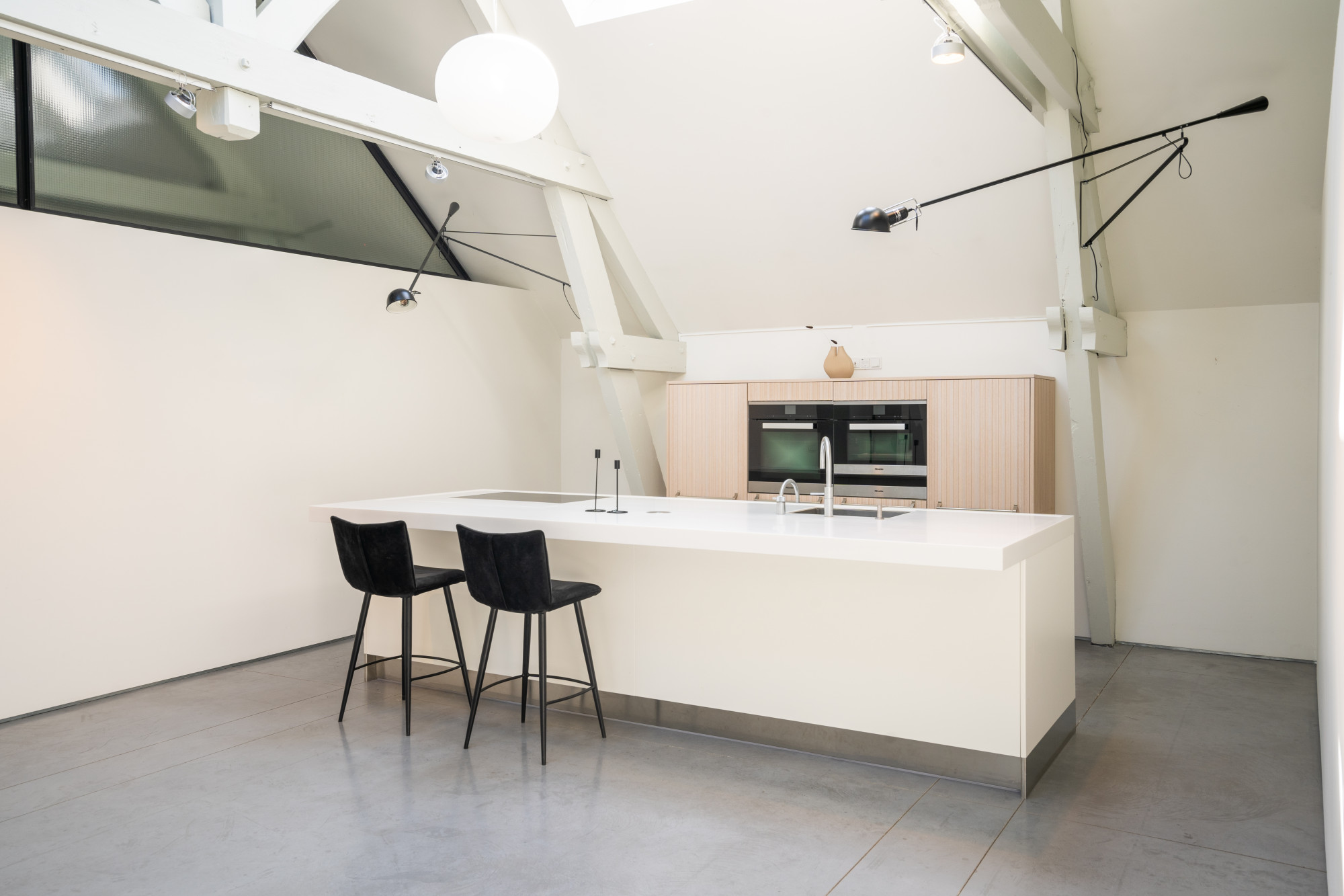 De keuken op de verdieping is een moderne maatwerkkeuken met kookeiland en bar in Corian, voorzien van volgende Miele toestellen; inductiekookplaat, enkele spoelbak, werkblak inbouw afzuiging, oven, stoomoven, warmhoudlade, koelkast en vaatwasser.