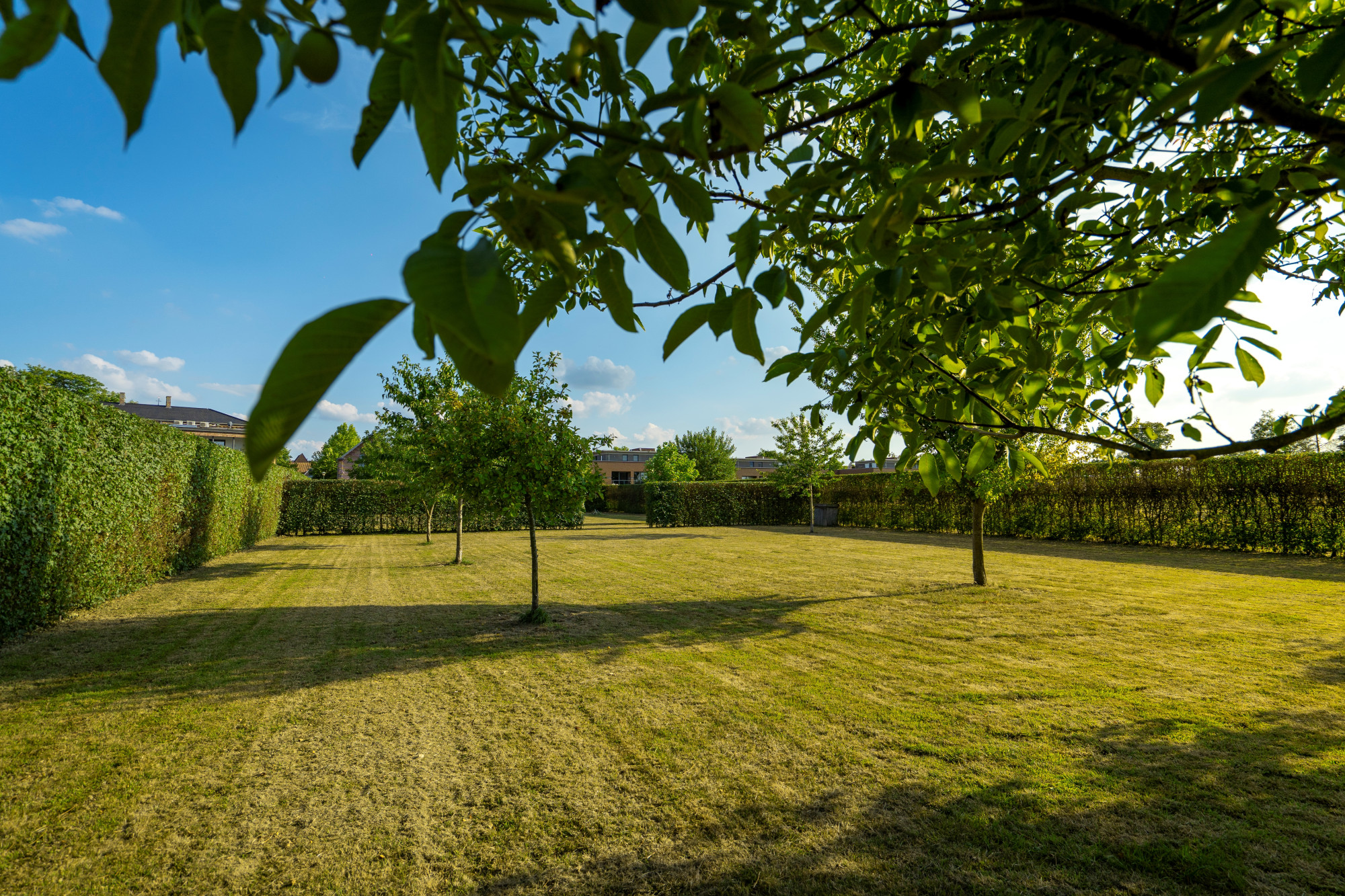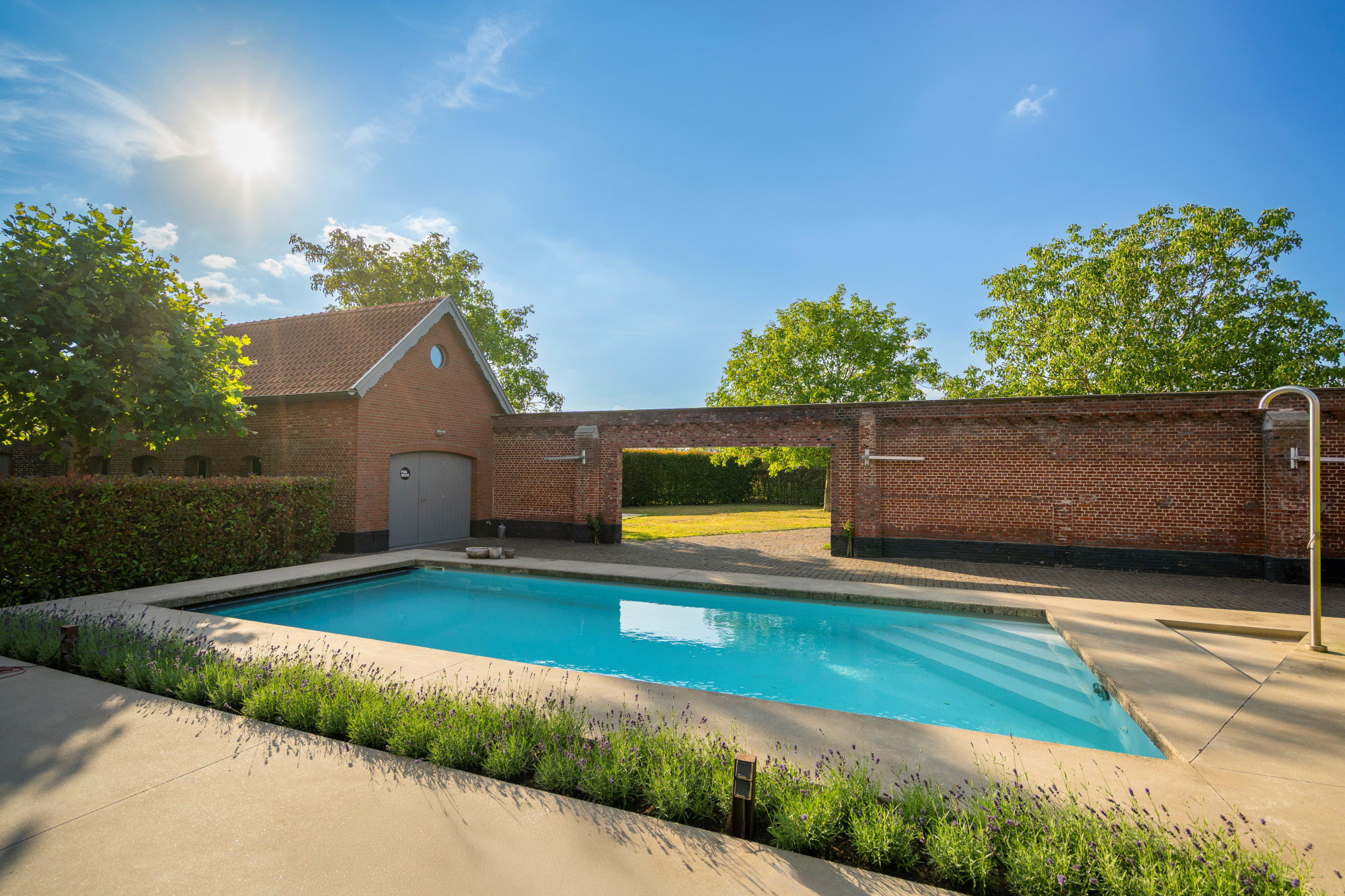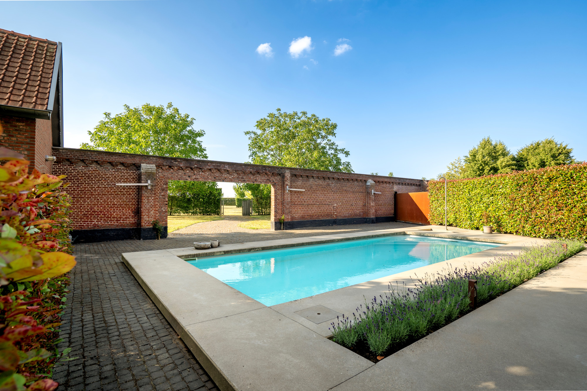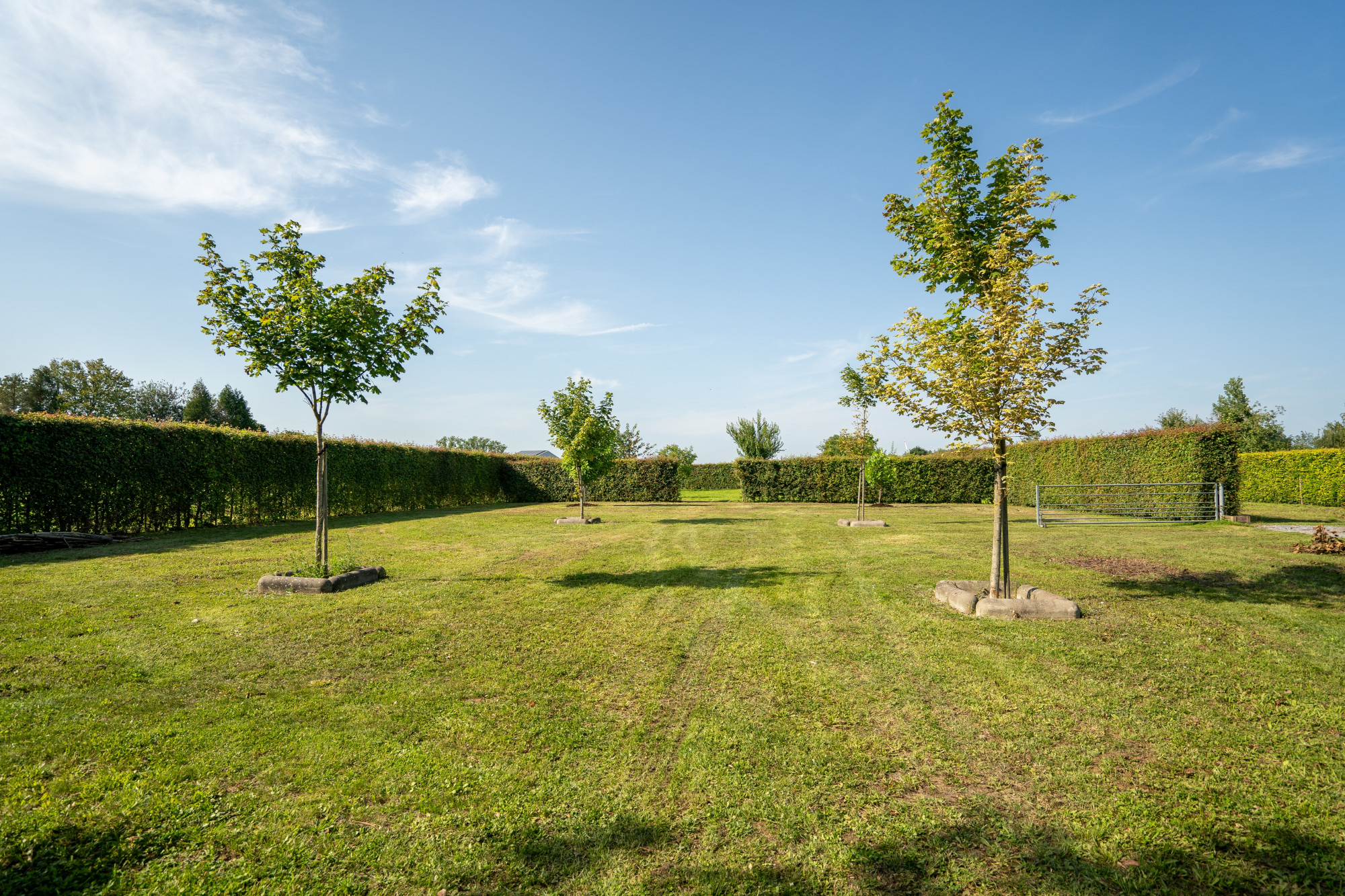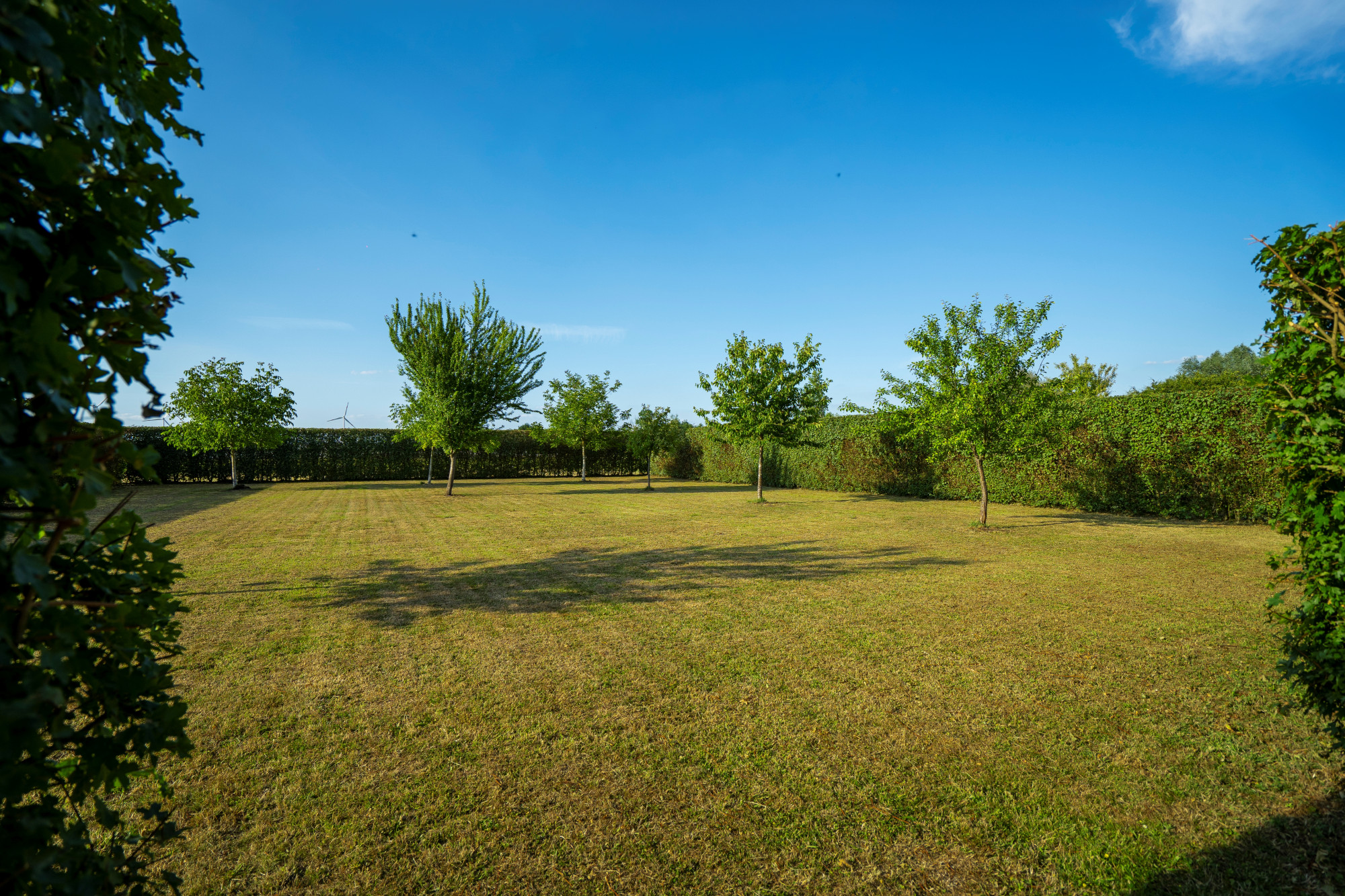Het terrein is volledig aangelegd, omheind met een draad- en haagafsluiting en voorzien van een automatische poort. De tuin, die noordelijk georiënteerd is, ligt in een groene zone en omvat een grasweide met bomen en hagen. Het buitenzwembad is verwarmd en voorzien van een solar afdekscherm en buitendouche. Daarnaast is er een bijgebouw, ingericht als gastenverblijf met een keuken, badkamer met douche en een slaapruimte.