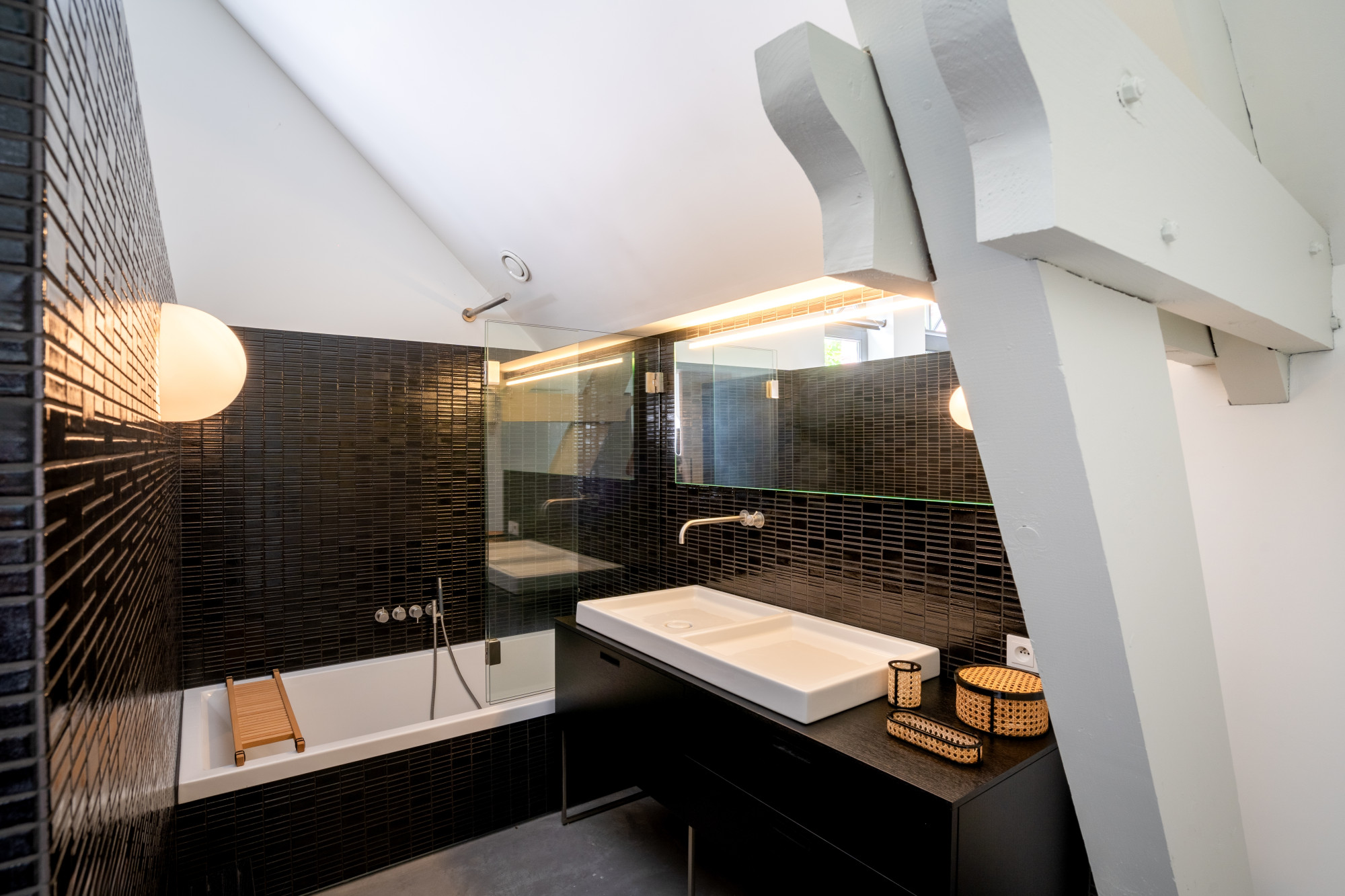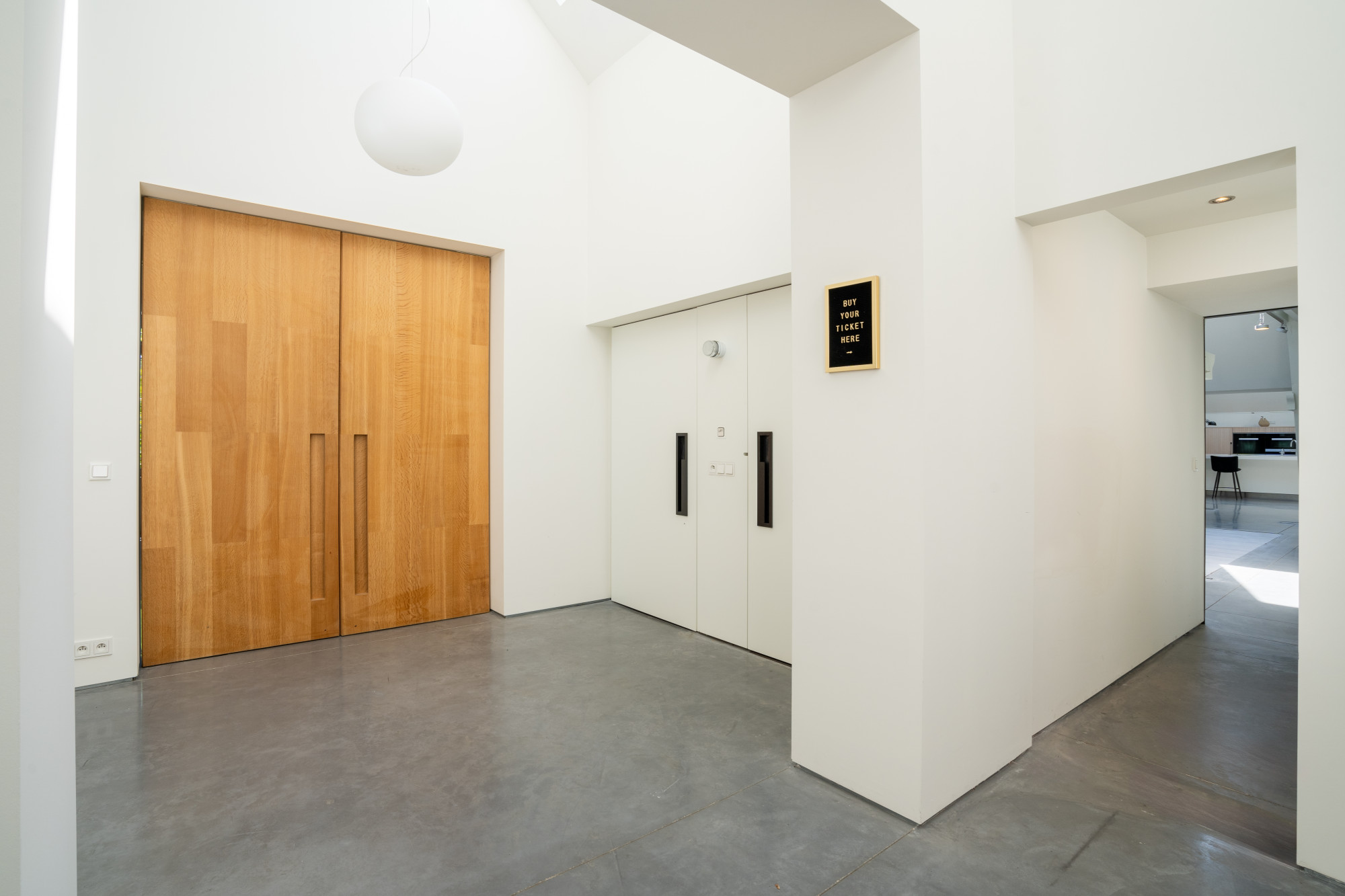 In de imposante inkomhal met een plafondhoogte van 4,4 meter, pronkt de autentieke gietijzeren trap met een moderne lift van kelder naar verdieping 1. Een glasplaat in de vloer herinnert eraan hoe de goederen vroeger tussen de verdiepingen werden getransporteerd. Er is een gastentoilet en twee hoge pivoterende eikendeuren met toegang tot de woonruimte of de leefkeuken. Deze is hyper uitgerust en voorzien van een eetruimte met design houthaard en toegang tot de tuin.