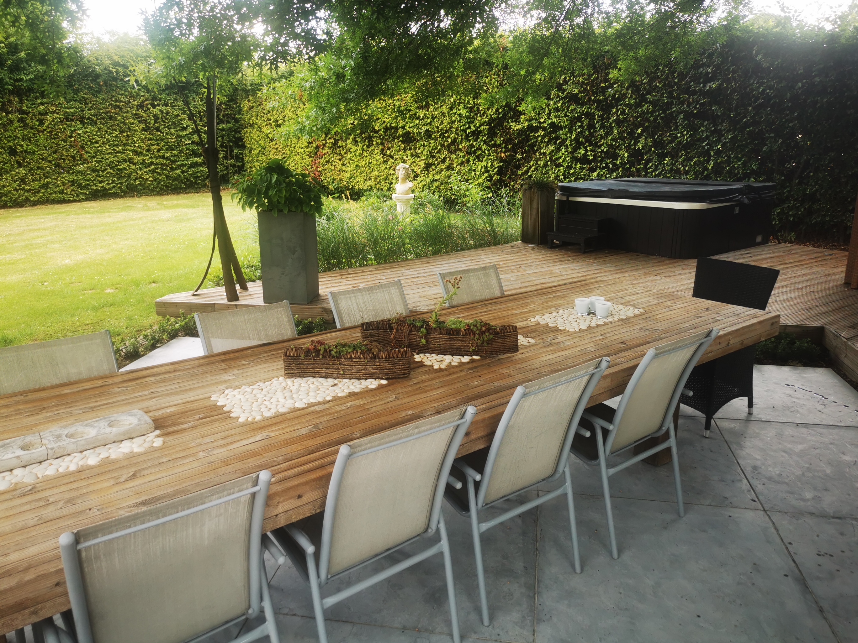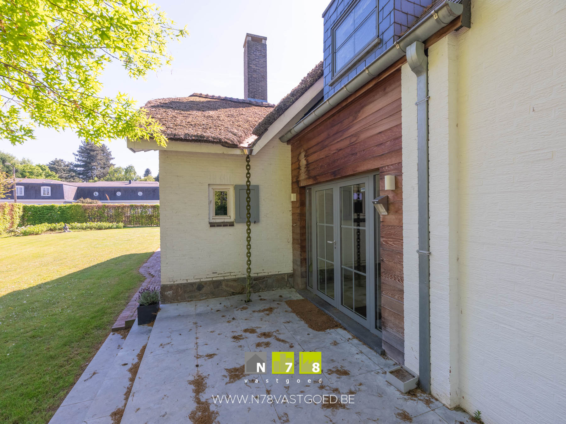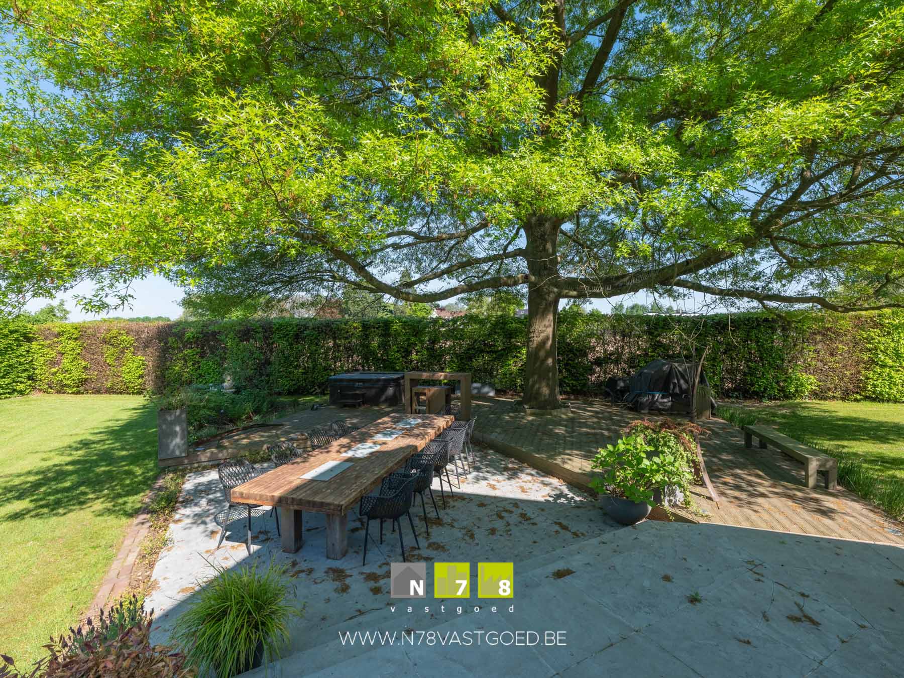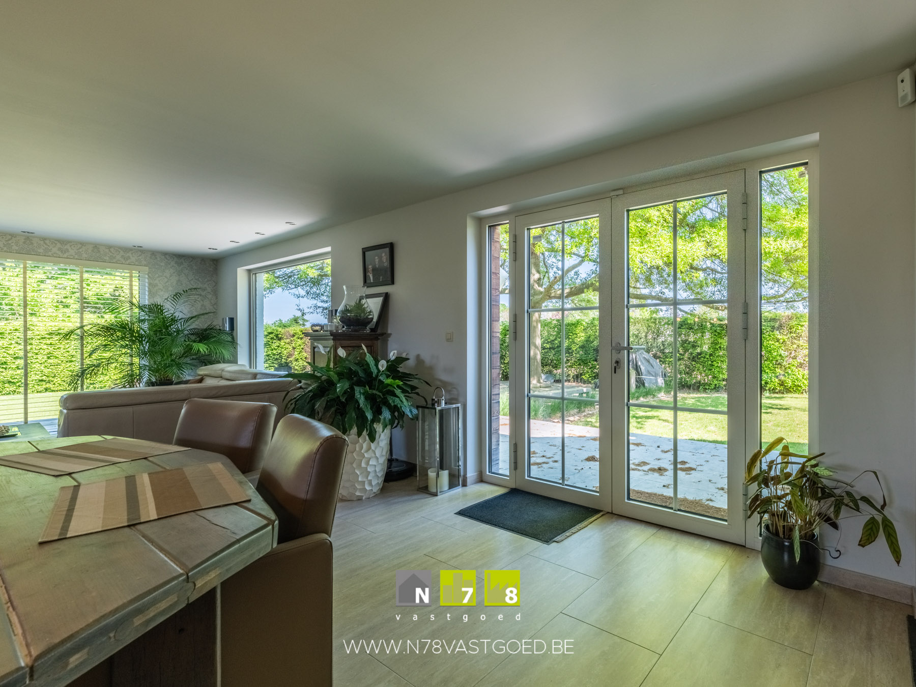 - Terras 1 ((3,30m x 9,00m) + (3,20m x 10,00m) = 61,70m²): volledig rondom de woning, prachtig uitzicht naar de tuin, tegelvloer.