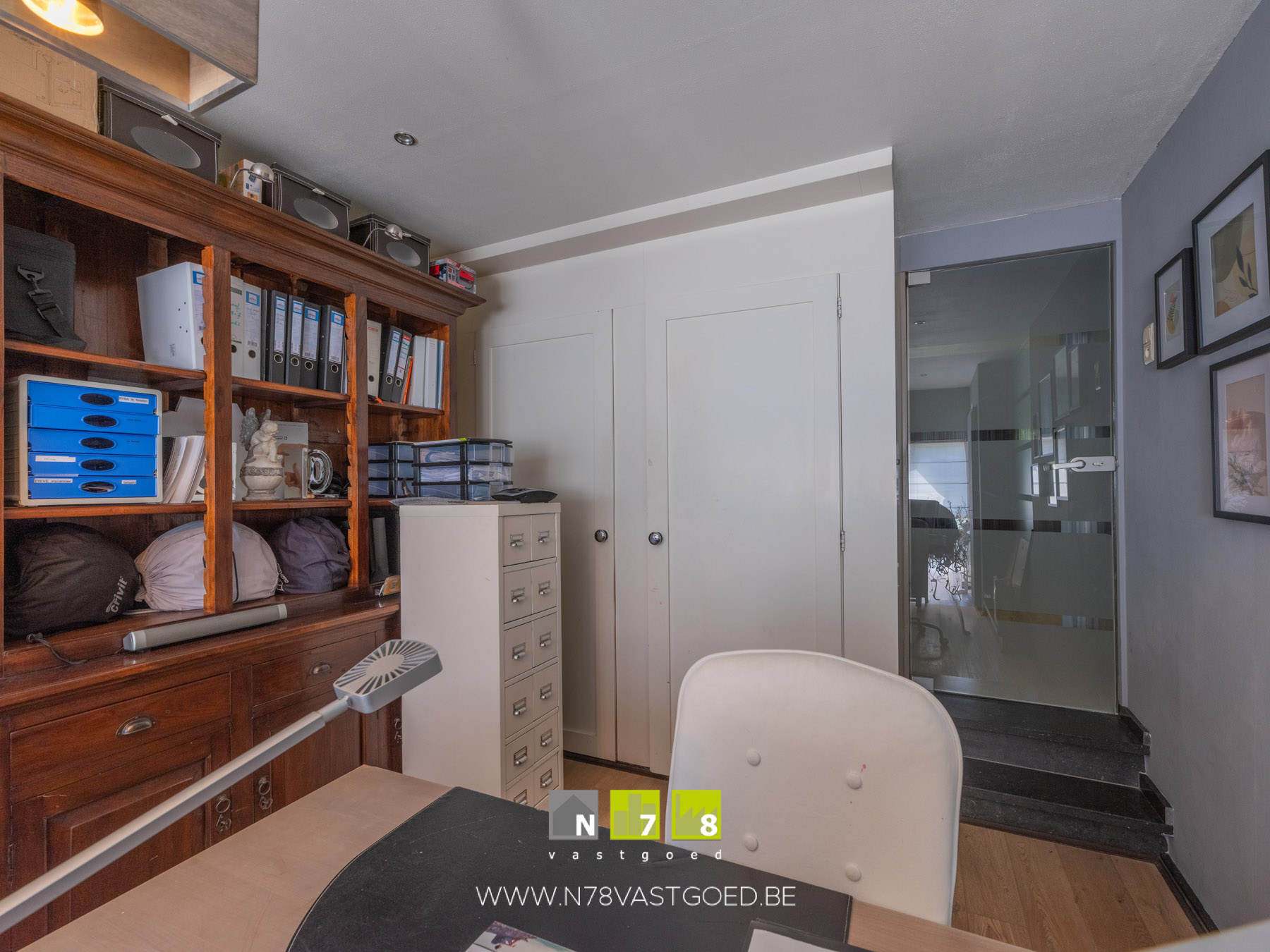 - Bureau 2/traphal (4,10m x 3,10m = 12,71m²): bureau met onderkasten, trap naar de kelder (leefkelder), tegelvloer.