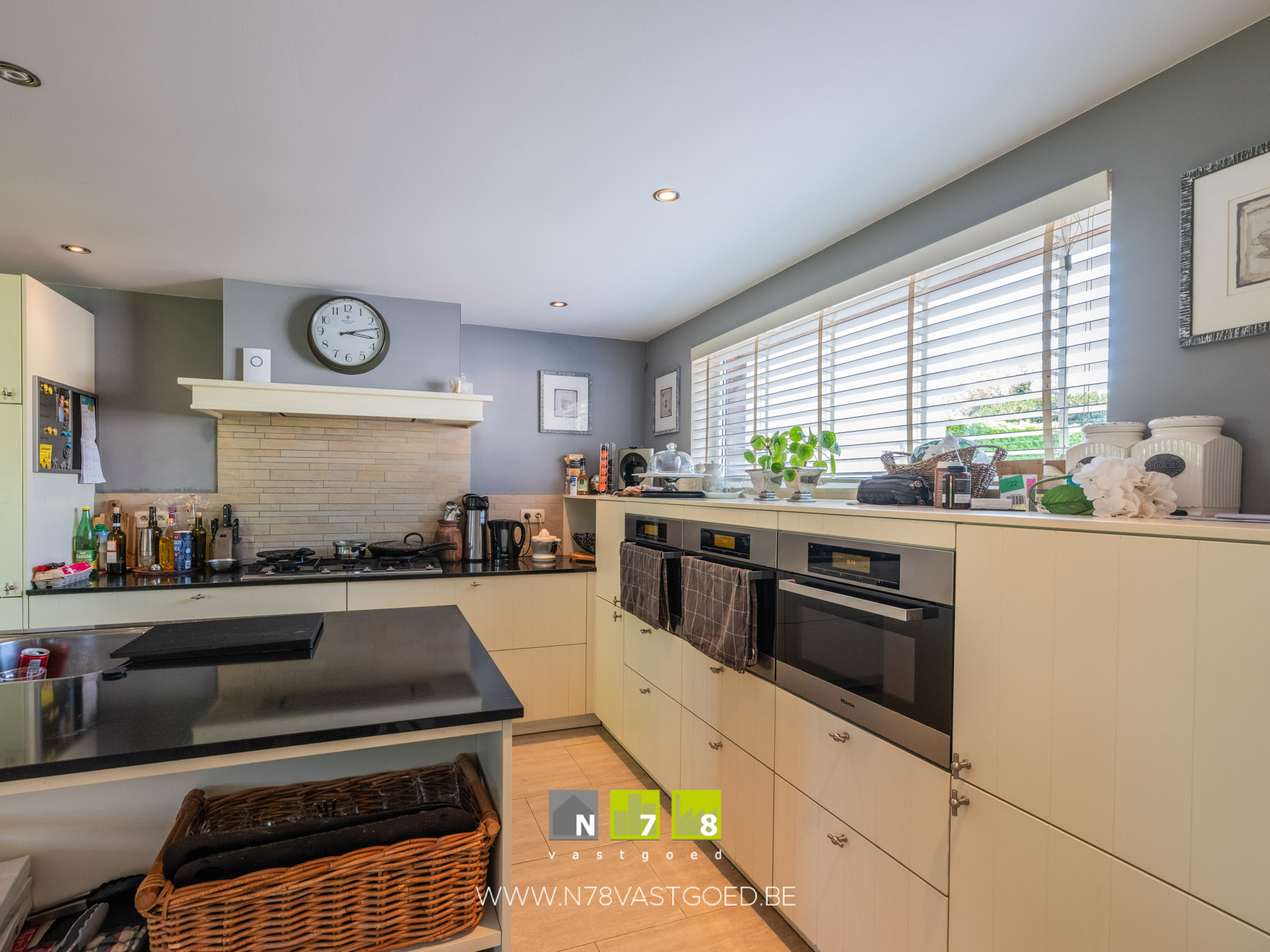 - Keuken (3,60m x 3,70m = 13,32m²): ingericht met onderkasten, bovenkasten, koelkast, gasfornuis, 2x combi-oven,stoomoven; keukeneiland met spoeltafel, vaatwasser, lades, werkblad in natuursteen; tegelvloer.