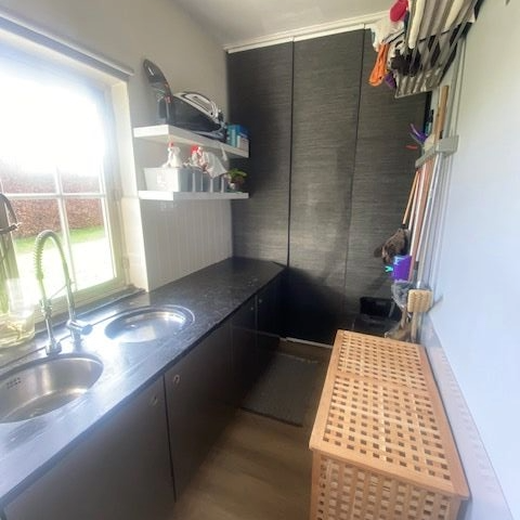 - Berging/wasplaats (5,20m x 1,85m + 0.9m x 2m = 11,42m²): kitchenette met onderkasten, bovenkasten, dubbele spoelbak, vaatwasser, werkblad in natuursteen, lades; aansluiting wasmachine/droogkast,Cv-installatie, laminaat.