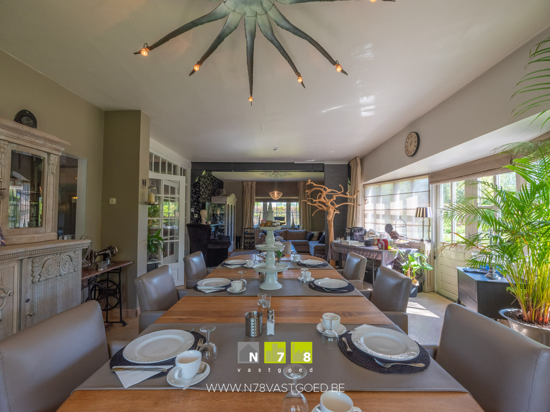 - Ontbijtruimte (5,25m x 11,00m = 57,75m²): deur naar tuin, parketvloer.