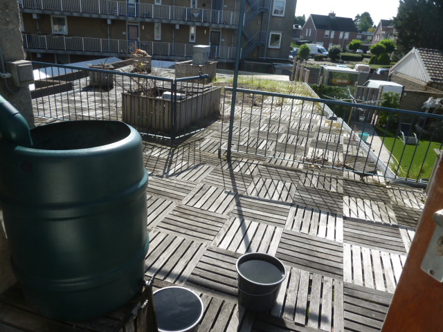 1e Verdieping: overloop, toilet, L- woonkamer met open keuken, dakterras