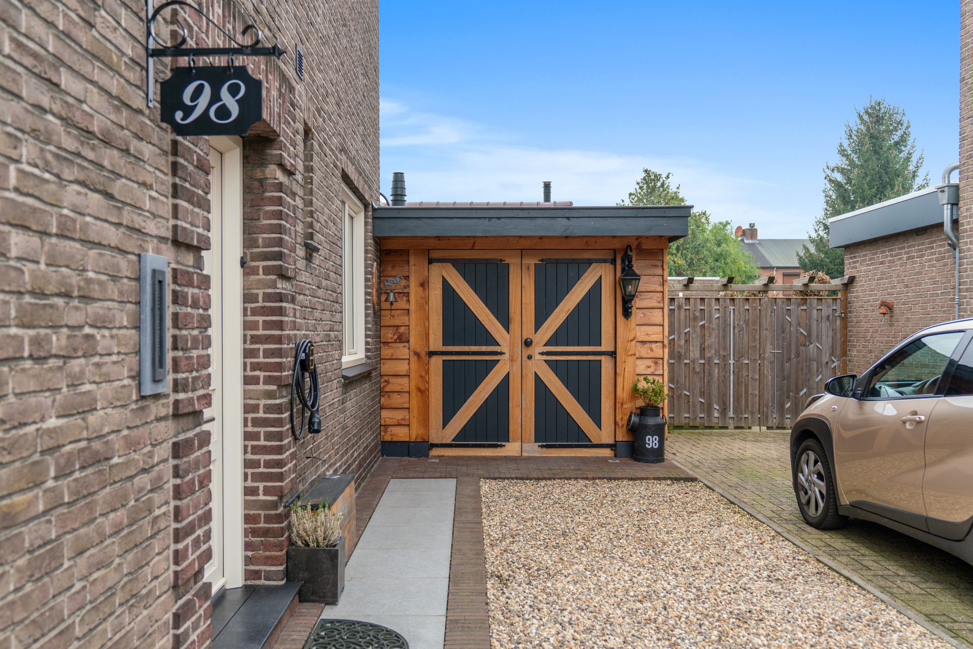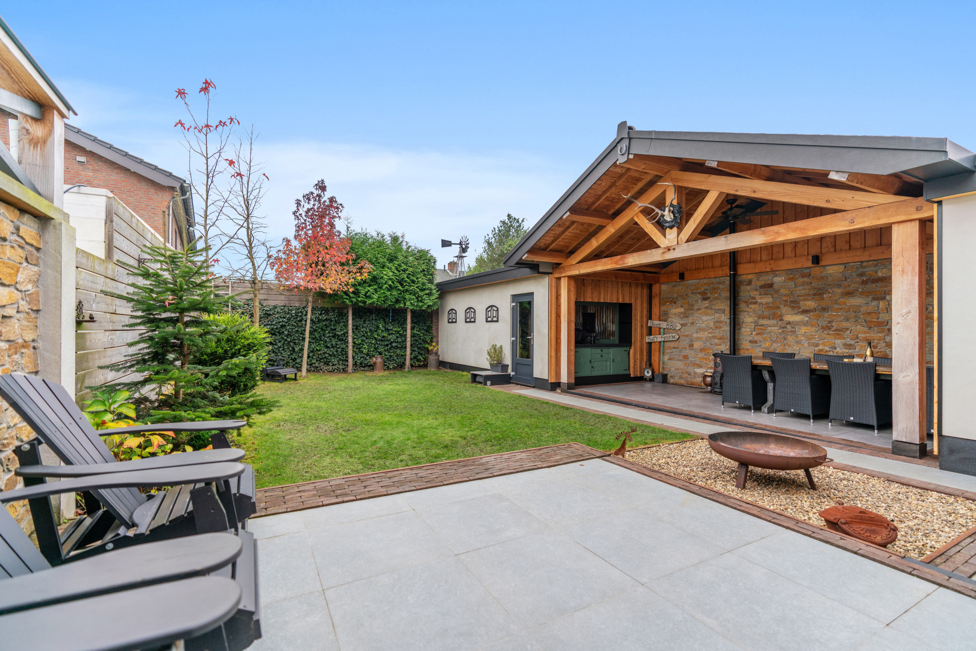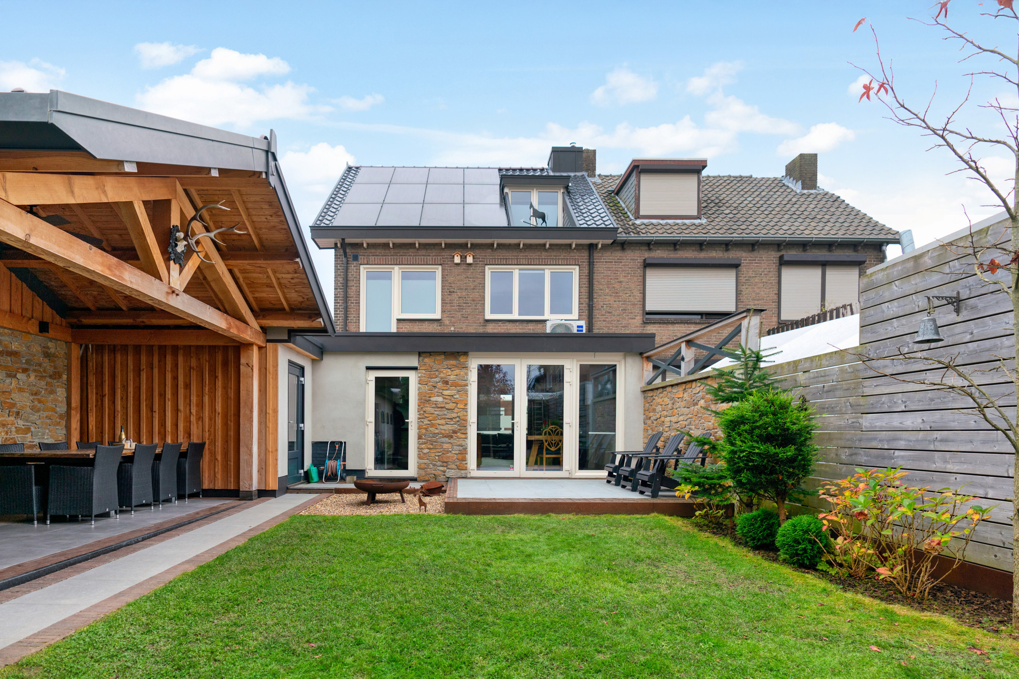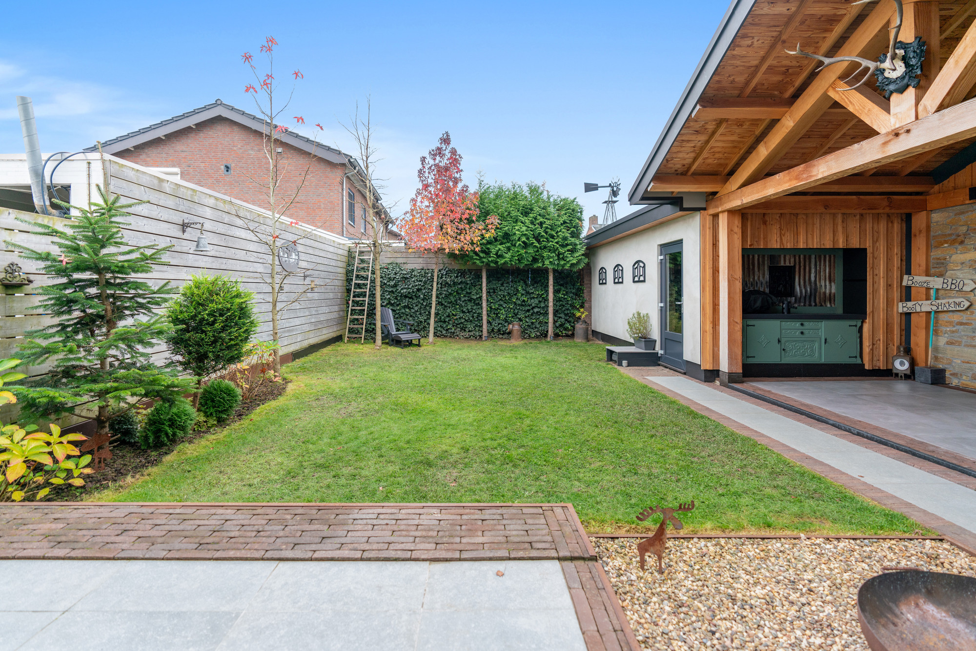 De fraai aangelegde tuin (gelegen op Zuid/westen) is een oase van rust en privacy, met een garage, een multifunctionele ruimte van ca. 17m² en een fantastische houten overkapping.