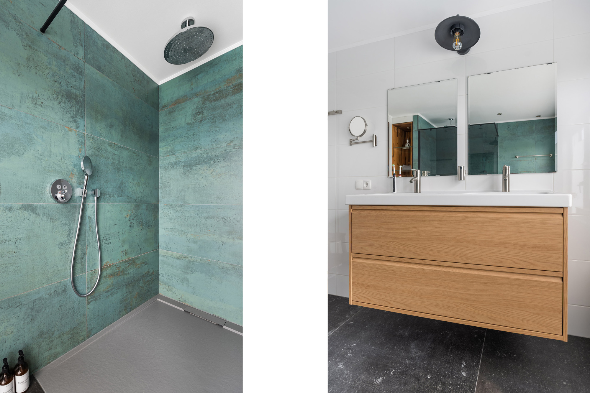 - De moderne badkamer is uitgerust met een inloopdouche, dubbele wastafel met meubel en elektrische vloerverwarming.