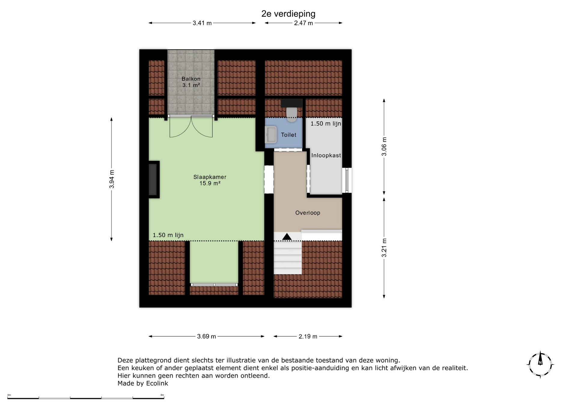 Op de tweede verdieping bevinden zich de overloop met toegang tot de derde slaapkamer (ca. 16m²), apart toilet met hangcloset en wastafel en berging/inloopkast. De slaapkamer is voorzien van een airco, dakkapel, balkon en laminaatvloer.
