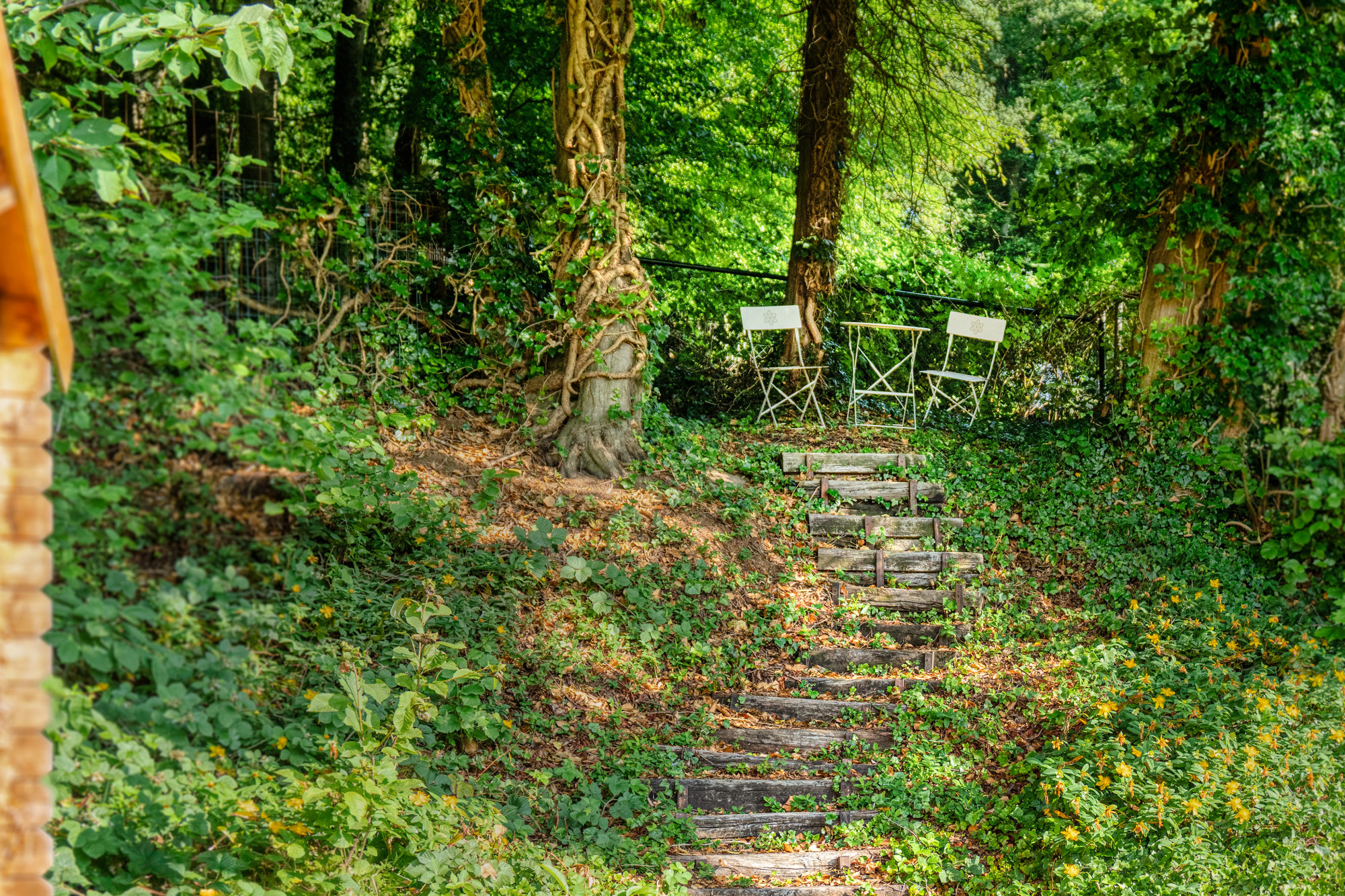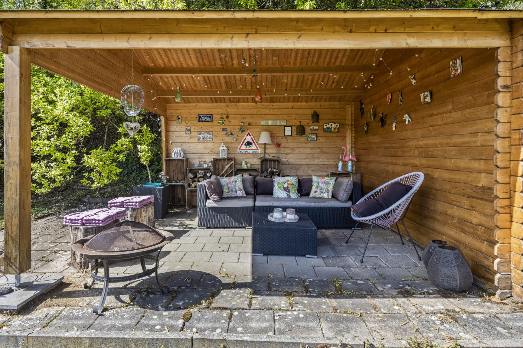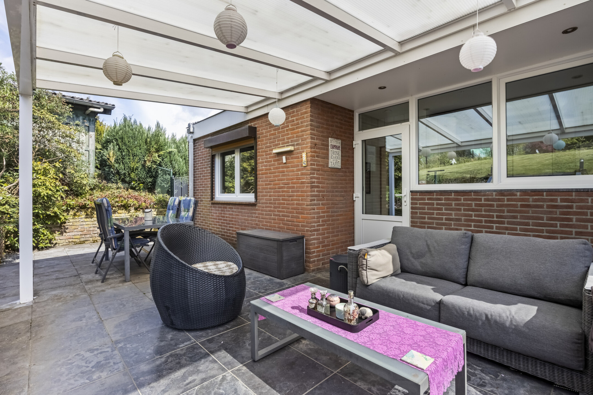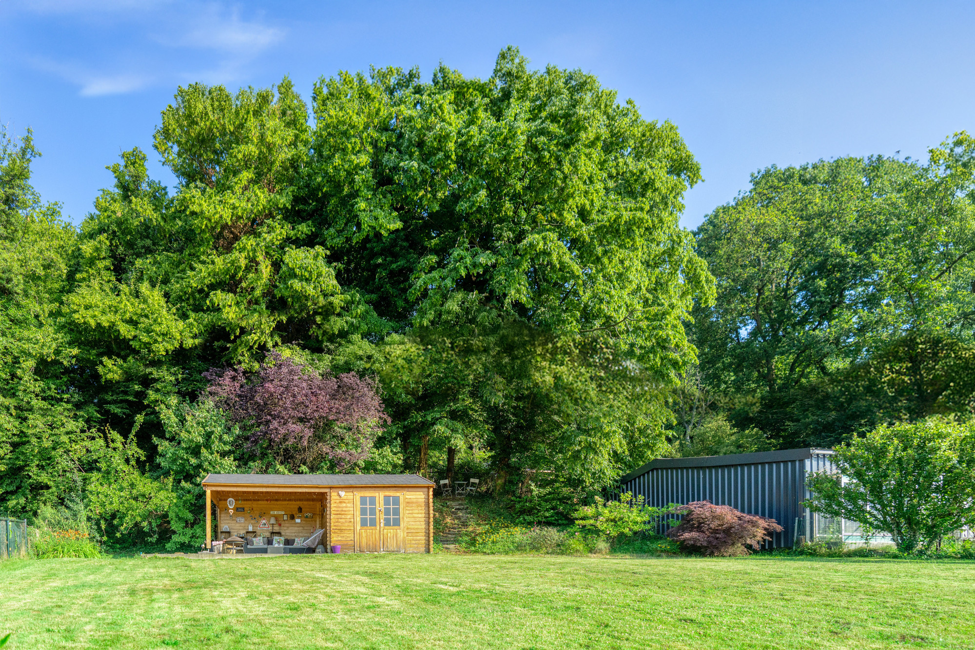 De achtertuin is werkelijk een plaatje: heerlijk ruim, volledig omsloten en voorzien van een betegeld terras, een tuinhuis, extra overdekt terras én een mooie overkapping. Hier geniet je in alle seizoenen van privacy, rust en groen.