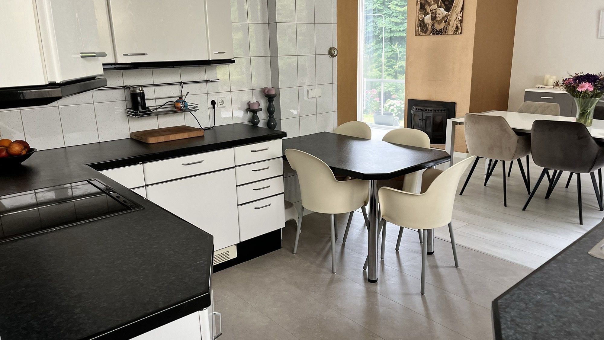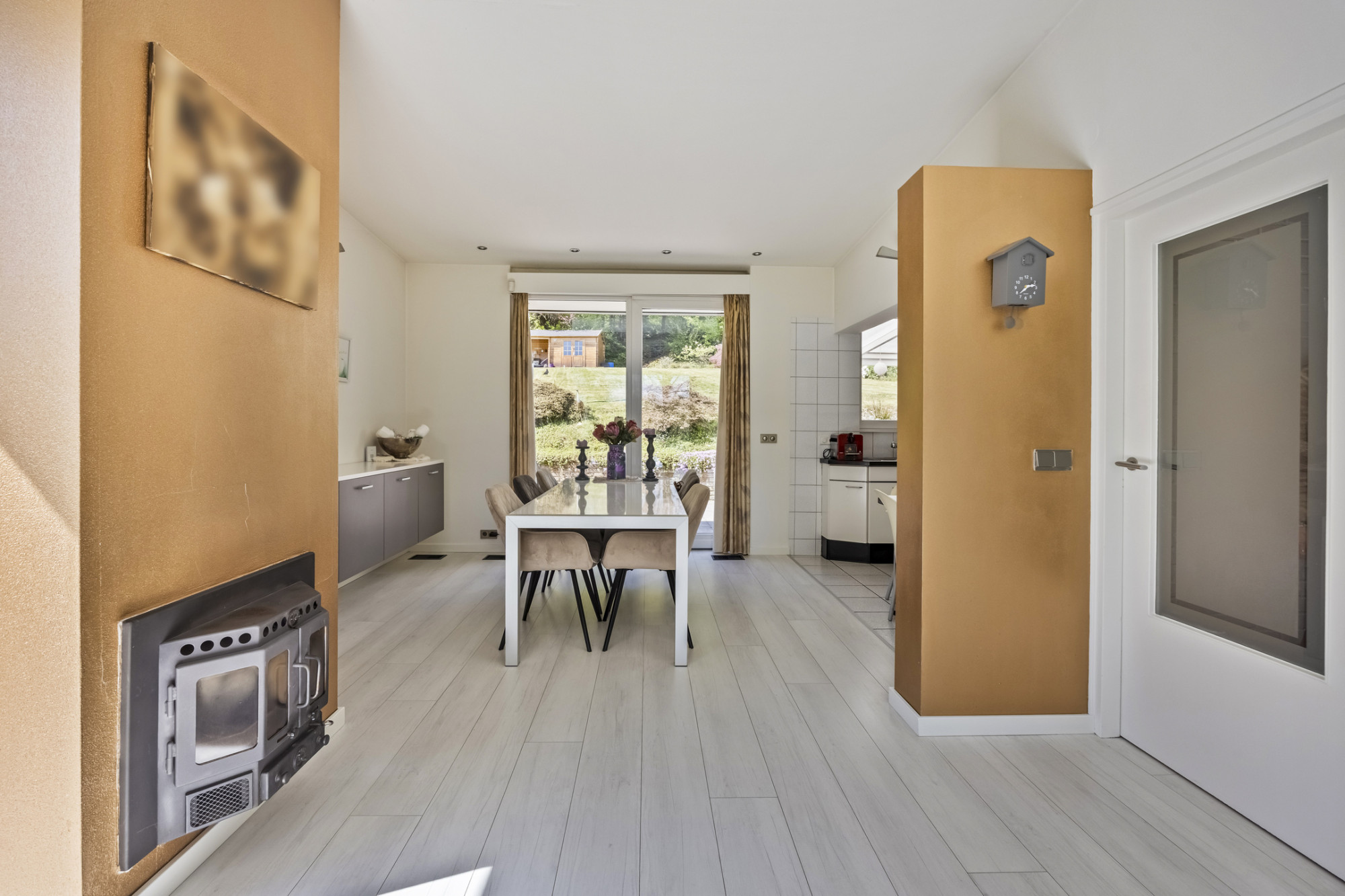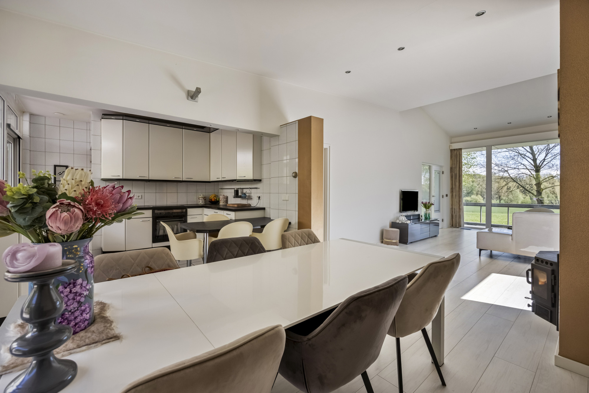 Via een riant bordes met overkapping aan de voorzijde betreed je de woning. In de hal bevinden zich de meterkast en een keurig toilet met wastafel. De royale, lichte woonkamer staat in open verbinding met de eetkamer, waar grote ramen en een slimme indeling zorgen voor een heerlijke sfeer en optimaal lichtinval. De moderne open keuken is voorzien van alle wenselijke inbouwapparatuur: combi oven-magnetron, elektrische kookplaat, koelkast, vaatwasser en afzuigkap.