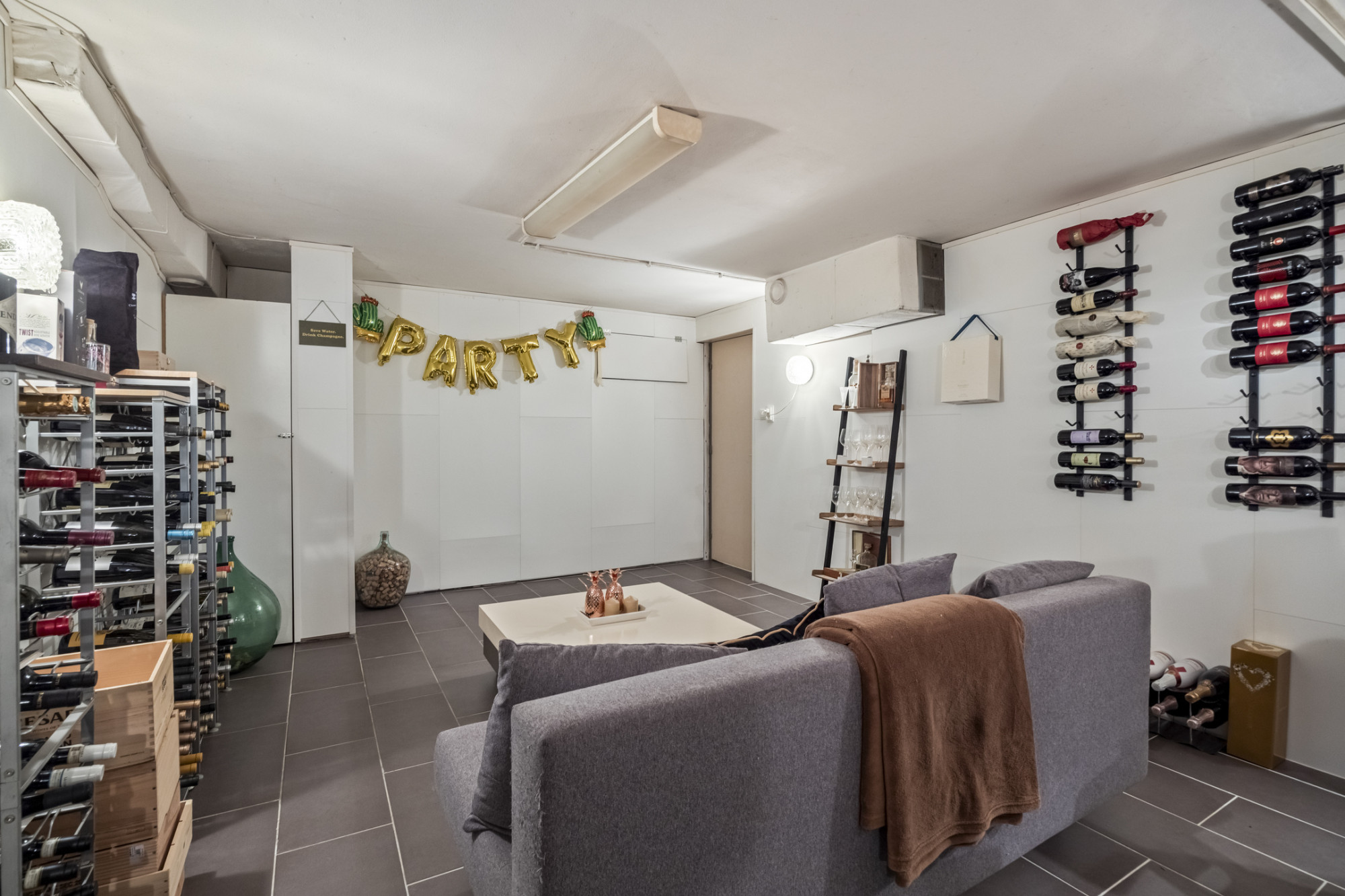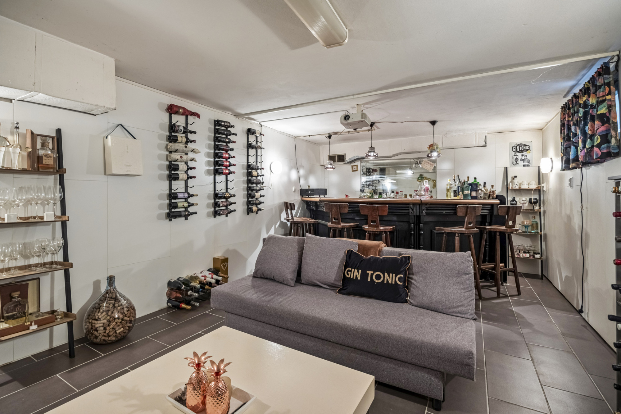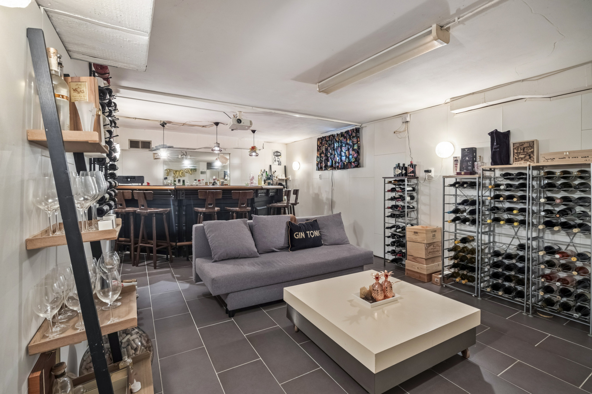 Het souterrain is een waardevolle toevoeging aan deze woning en biedt volop praktische én gezellige ruimte. De inpandige garage is bereikbaar via een elektrische poort en sluit aan op een royale oprit. Hier vind je ook een praktische bijkeuken, ideaal voor wasapparatuur of extra bergruimte. In de stookruimte bevinden zich de verwarmingsinstallatie en boiler. Uniek is de wijnkelder met aparte bar, compleet met beamer – de ideale plek voor een avondje ontspanning met vrienden of familie!