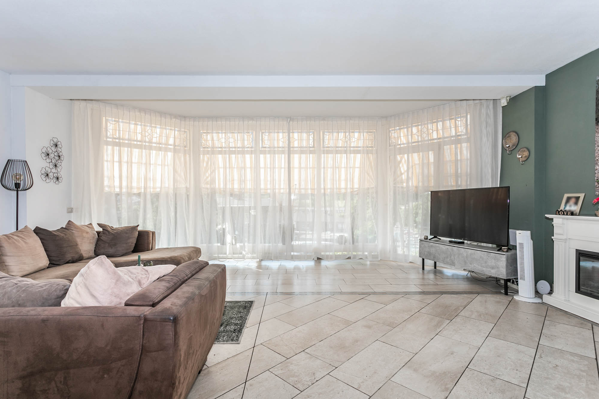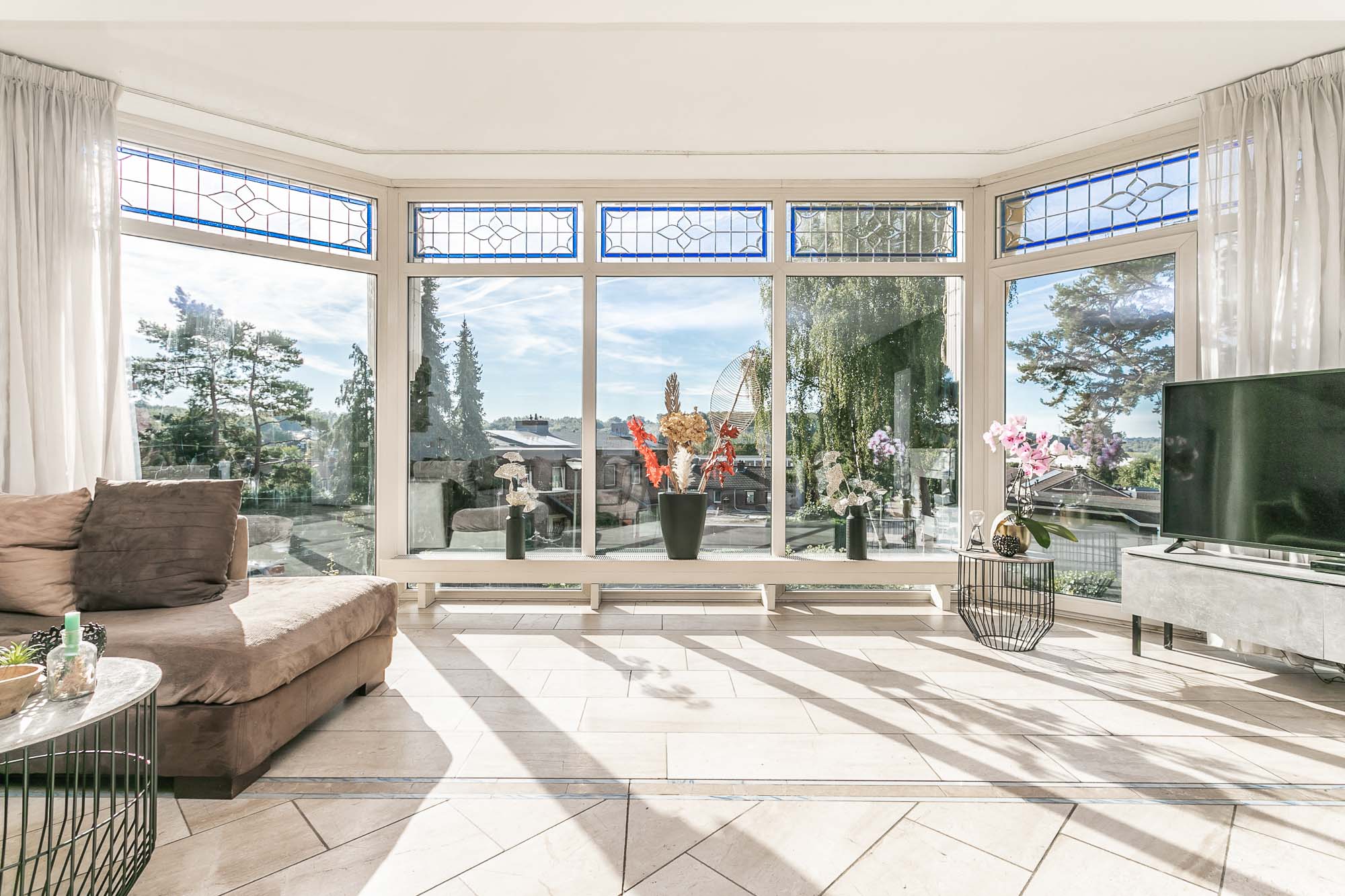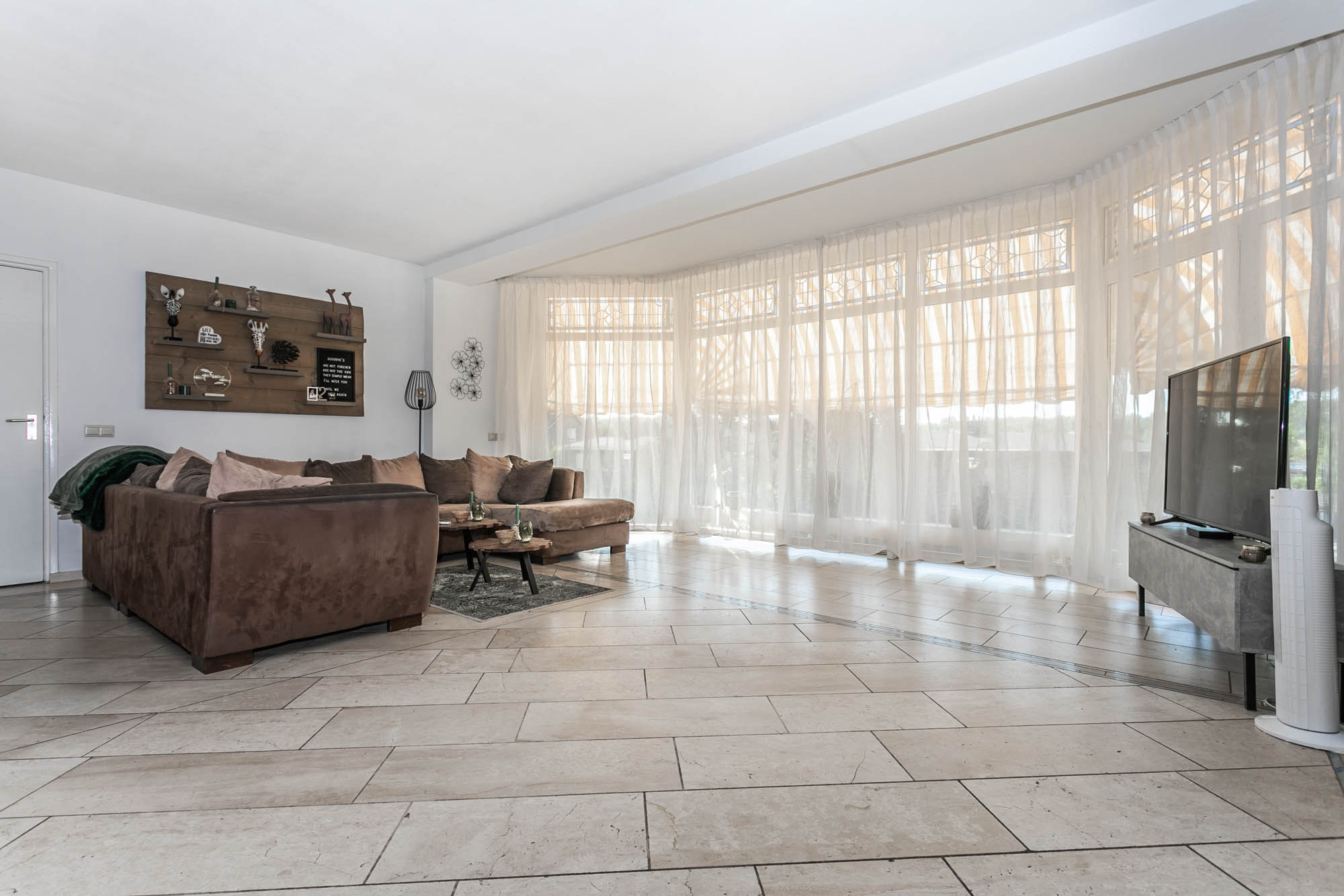 De ruime woonkamer (9.45*6.48/3.35m) met natuurstenen vloer en een mooie erker baadt in het natuurlijke licht.