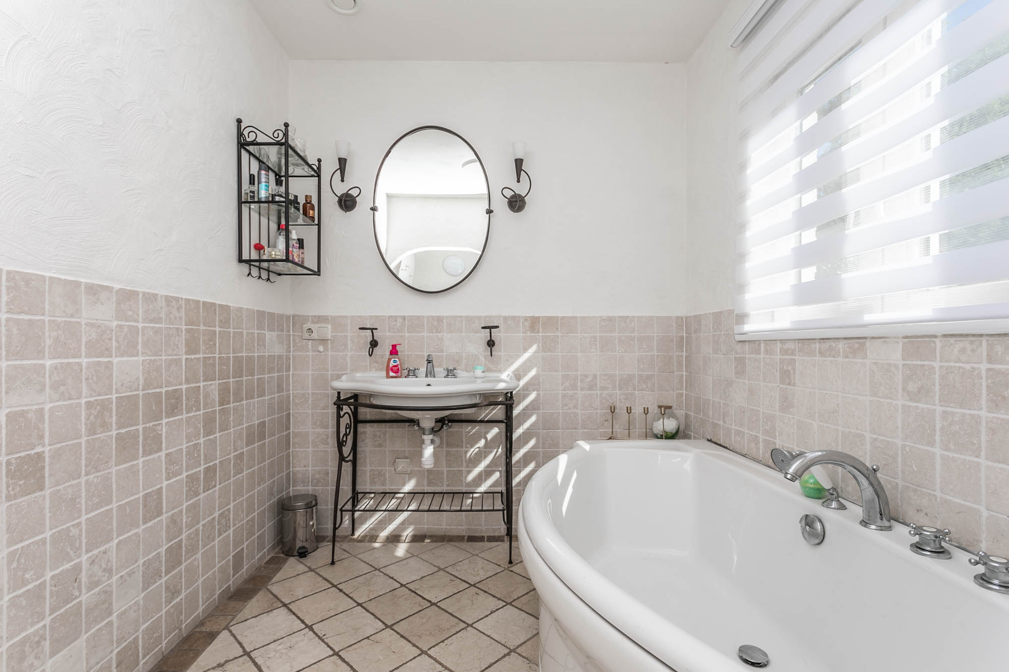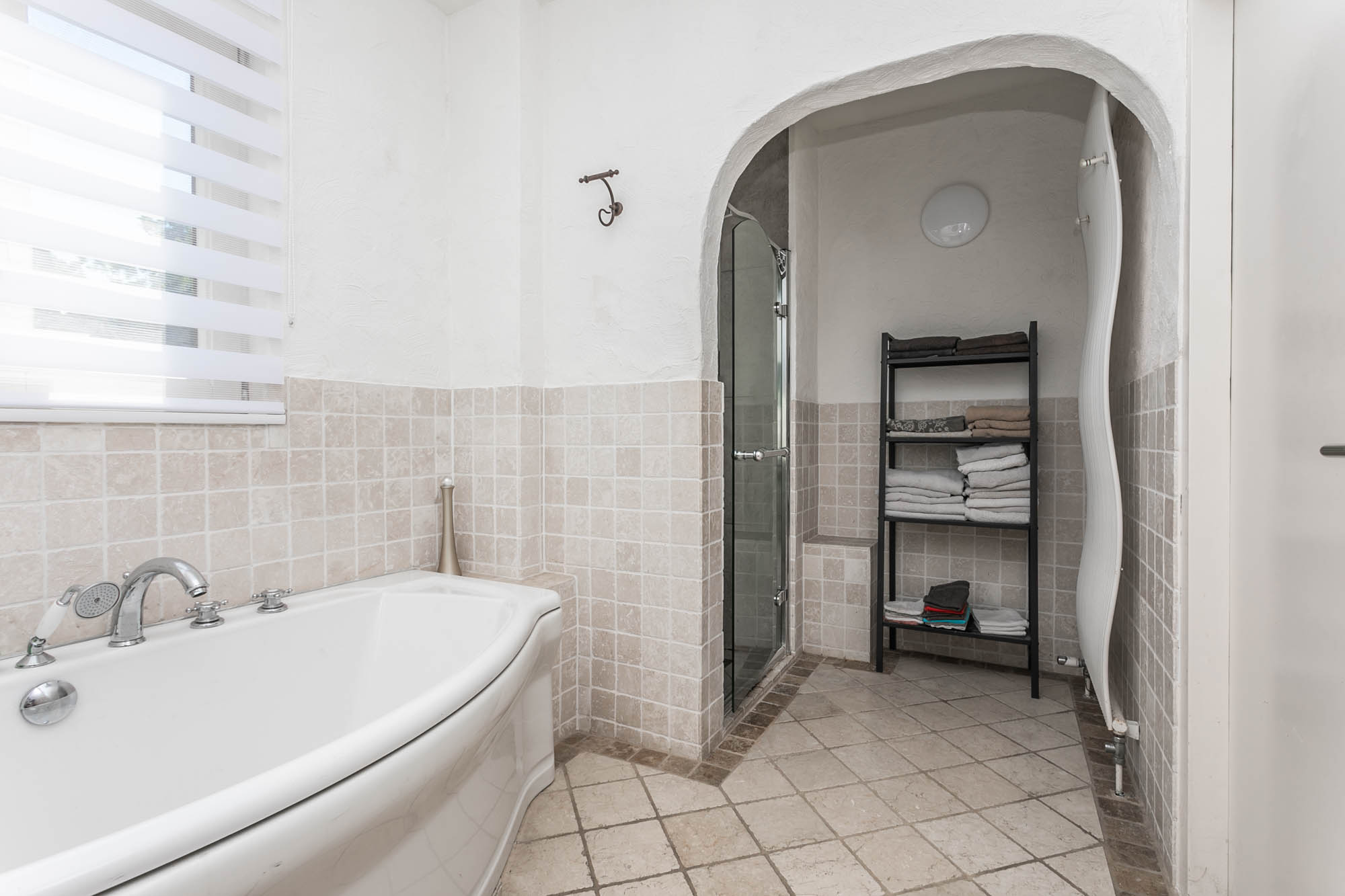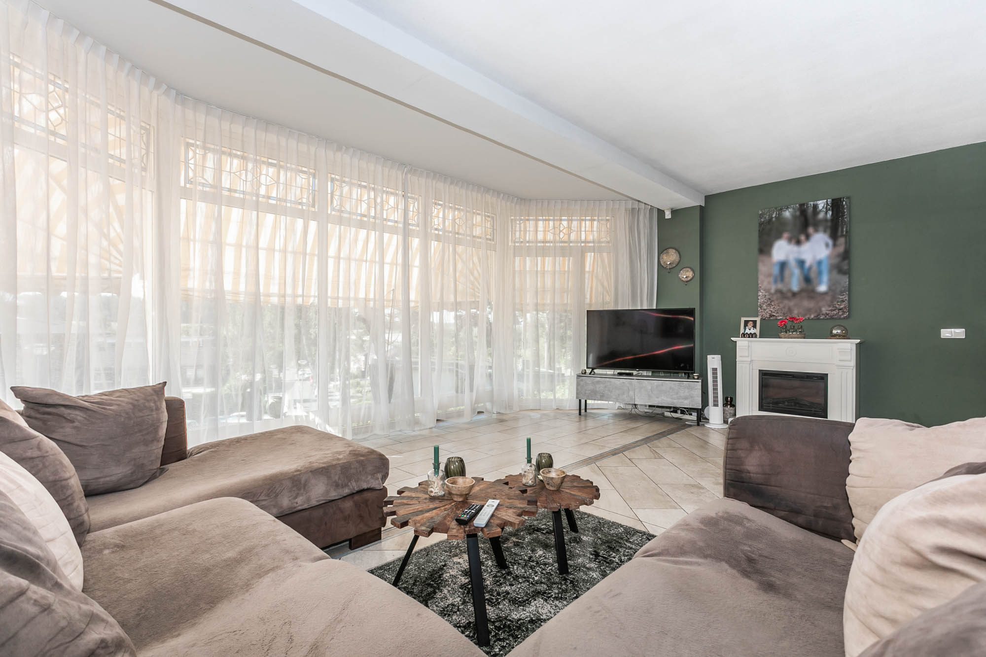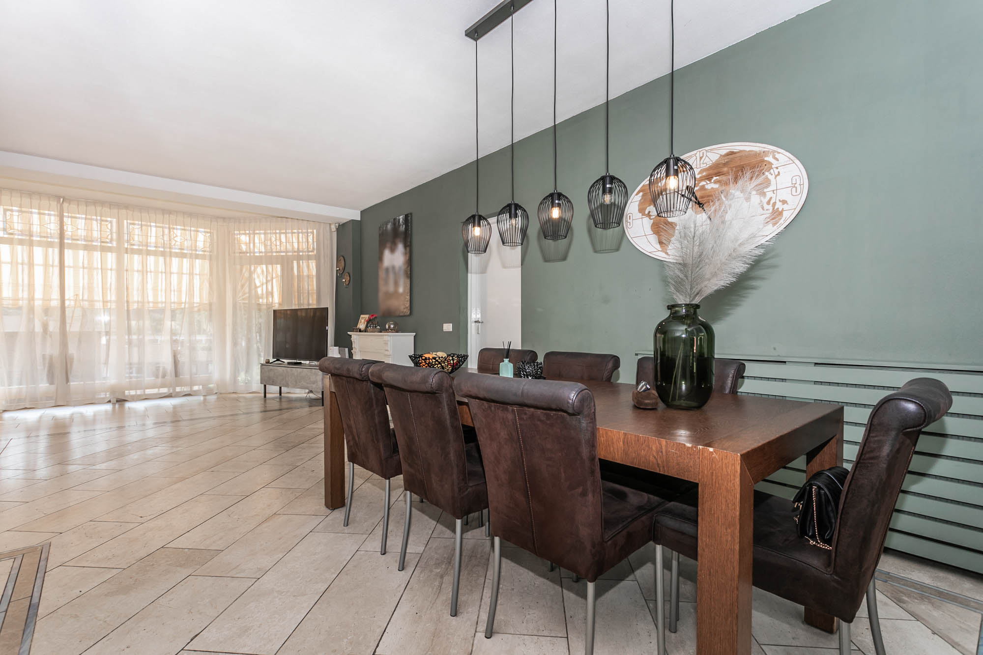De ruime woonkamer (9.45*6.48/3.35m) met natuurstenen vloer en een mooie erker baadt in het natuurlijke licht.
